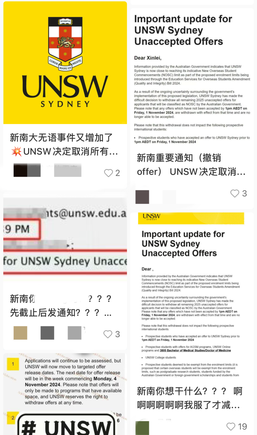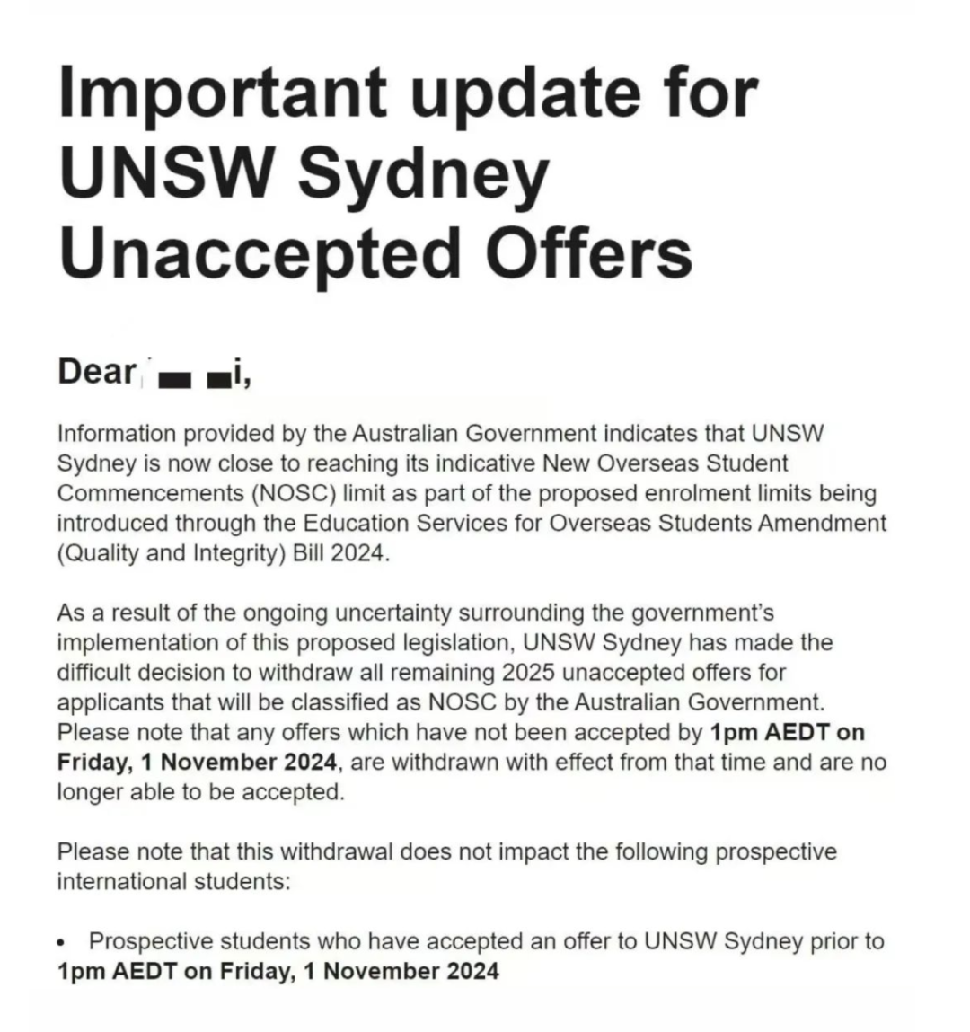 ![]() 点击上方关注我们 留学路上不再孤单 25QS世界大学排名第19的澳洲八大新南威尔士大学发布紧急通知:11月1日悉尼时间下午1点(北京时间上午10点)撤销所有2025开学未被接受的Offer!🤯 ![]() 通知显示👇 UNSW sydney 2025年度招生人数已接近Cap法案设置的上限,为应对法案带来的不确定影响,UNSW Sydney 决定撤销 NOSC学生(也就是国际新生)全部2025年未接收的 offer! 这主要是由于新南威尔士大学目前已经接近达到2025年国际学生招生配额,即9500人。从11月1日下午,也就是澳洲东部夏令时间下午1点开始,UNSW陆续撤回所有未接受的offer。 ![]() 不少留学生在社交网站上哀嚎:到手的offer居然飞了... ![]() 图源网络 还有不少受害同学收到了最新邮件: ![]() 图源网络 不过也不是完全没有机会,校方表示:11月-12月,针对2025年还有空位的课程,UNSW Sydney 将分批次发放录取,录取将发放给在候补名单(Offer Waitlist)上的申请人,更多细节将在未来几个月内更新。 ![]() 01# full offer 持有者 所有在11月1日被UNSW取消offer的学生,如果是full offer,大概率会收到学校的联络。 同时需要在11月8日悉尼时间下午5点,也就是北京时间下午2点前回复是否愿意加入 waitlist。 ![]() 小美建议大家还是试着填一填: https://unsw.au1.qualtrics.com/jfe/form/SV_a63EfFp5ou76k4K?mc_cid=b536d91956&mc_eid=8cbaab3900 02# Conditional offer持有者 Con-offer holder 如果申请加入waitlist,则需要在满足所有条件后才可能被录取。 ![]() 好消息是:这一决定不影响以下国际学生👇 ⭕️在2024年11月1日澳大利亚东部夏令时间下午1点之前已接受录取的学生; ⭕️获得AGSM项目、UNSW Online项目和3805 Bachelor of Medical Studies/Doctor of Medicine录取的学生; ⭕️UNSW College的学生; ⭕️被认为不受招生限额影响的学生(包括研究生研究类学生postgraduate research、获得澳大利亚或外国政府奖学金资助的学生,以及来自某些太平洋岛国和东帝汶的学生); ⭕️正在新南威尔士大学就读、之后也会在大学继续就读另一个学位课程的学生。 01 澳洲留学变天了 其实这件事也是可预见的,就在上个月新南威尔士大学宣布了多个热门项目暂停招生,包括商科、计算机科学、工程学等。 ![]() 高等教育专家诺顿教授指出:这与澳洲政府多项移民政策收紧有关。 ![]() 根据官方数据,今年8月的离岸学生签证申请数量仅为15,270份,不到去年同期的一半。 这无疑让原本已经竞争激烈的澳洲留学市场变得更加紧张。 而在这种形势下,还没有申请的同学们真的要上点心了!不准备今年申请的同学也要有紧迫感!面对瞬息万变的政策,我们要做的就是努力提升实力💪 02 硕士申请要求 想要继续冲澳洲的同学,小美也帮大家整理了另外7所澳洲大学的最新硕士申请要求以供参考。 01# 墨尔本大学 2025QS世界大学排名第13 申请要求: ✅ 211/985院校申请者平均分:80+ ✅ 双非院校申请者平均分:85+ 雅思语言要求: ✅ 雅思总分6.5,单项不低于6.0 ✅ 部分热门课程要求雅思总分达到7.0+ ![]() 02# 悉尼大学 2025QS世界大学排名第18 申请要求: ✅ 985院校申请者平均分:75+ ✅ 211院校申请者平均分:78+ ✅ 其他院校申请者平均分:80+ 雅思语言要求: ✅ 雅思总分6.5,单项不低于6.0 ✅ 接受单科重考 ![]() 03# 澳大利亚国立大学 2025QS世界大学排名第30 申请要求: ✅ 本科学位 ✅ 211/985院校申请者平均分:75+ ✅ 其他院校申请者平均分:80-85+ 雅思语言要求: ✅ 雅思总分6.5,单项不低于6.0(根据具体专业而定) ![]() 04# 莫纳什大学 2025QS世界大学排名第37 申请要求: ✅完成四年制本科课程,且获得学士学位证书 ✅双非院校申请者平均分:80+ 雅思语言要求: ✅ 雅思总分6.5,单项不得低于6.0(根据具体专业而定) ![]() 05# 昆士兰大学 2025QS世界大学排名第40 申请要求: ✅GPA要求达到4.0(总分7.0) ✅211/985院校申请者平均分:75+ ✅非211/985院校申请者平均分:80-85+ 雅思语言要求: ✅雅思总分6.5,单项不低于6.0(根据具体专业而定) ✅部分课程有工作经验要求 06# 西澳大学 2025QS世界大学排名第77 申请要求: ✅211/985院校申请者平均分:75+ ✅非211/985院校申请者平均分:80+ 雅思语言要求: ✅ 雅思总分6.5,单项不低于6.0(根据具体专业而定) ✅ 对于特定专业,如医学或教育,雅思要求可能更高,具体以专业要求为准。 07# 阿德莱德大学 2025QS世界大学排名第82 申请要求: ✅ 大部分专业均分要求75分,具体以官网要求为准 雅思语言要求: ✅ 雅思总分6.5,单项不低于6.0(据具体专业而定) ![]() 上述要求仅供参考,具体申请细则可咨询。面对澳洲国际生新政,各大学校的offer名额非常紧张,有意向申请澳洲的同学们,一定要抓紧时间尽快申请哦~ ![]() >>> 雅思&托福&GRE&留学咨询<<< ![]() 南京美中教育公众号将持续发布国际教育相关最新资讯,并邀请专业老师进行定期分析,邀请大家持续关注! |