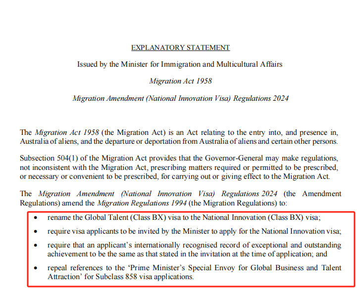 可以说,这次的职业清单极大地拓宽了移民的可能性。如果你符合条件,这可能就是一个绝佳的机会! 完整的职业清单如下: ![]() ![]() ![]() ![]() ![]() ![]() ![]() ![]() ![]() ![]() ![]() ![]() ![]() ![]() 再次注意,为了帮助陷入困境的建筑业,项目经理、建筑检查员、砌砖工和木工等行业也被列入清单,联邦政府公布的完整CSOL清单涵盖了456种职业。 所有这些职业都将被纳入“紧缺技能签证”(Skills in Demand visa)计划,为移民工人提供明确的途径来解决澳洲的劳动力短缺问题。 内政部长兼移民和多元文化事务部长Tony Burke表示:“政府决心解决技能短缺问题,特别是在建筑行业。这是吸引合格工人来帮助建造更多住房的重要一步。” NIV签证 千呼万唤始出来,期盼已久的澳洲国家创新签证NIV终于要来了。 今天,NIV相关修正法案正式公布!从2024年12月6日明天起,858全球技术人才签证GTI正式变更为858澳洲国家创新签证(NIV)。 ![]() NIV(National Innovation Visa),是原有858全球人才签证(GTI)的全面升级!并且,根据之前移民局发布的2024 Migration Strategy来看,这款签证还整合了之前关闭的投资移民签证! 这旨在为拥有澳洲所需技能的高技能移民,开辟新的和简化的移民途径!将现有的全球人才计划,集中在相对少的,能够为澳大利亚做出巨大贡献的申请人。这样一来,可以使得政府可以更好考虑,如何推动国家重要部门的创新投资和创业。 根据MIA透露的信息,新NIV签证主要包含四类申请人: