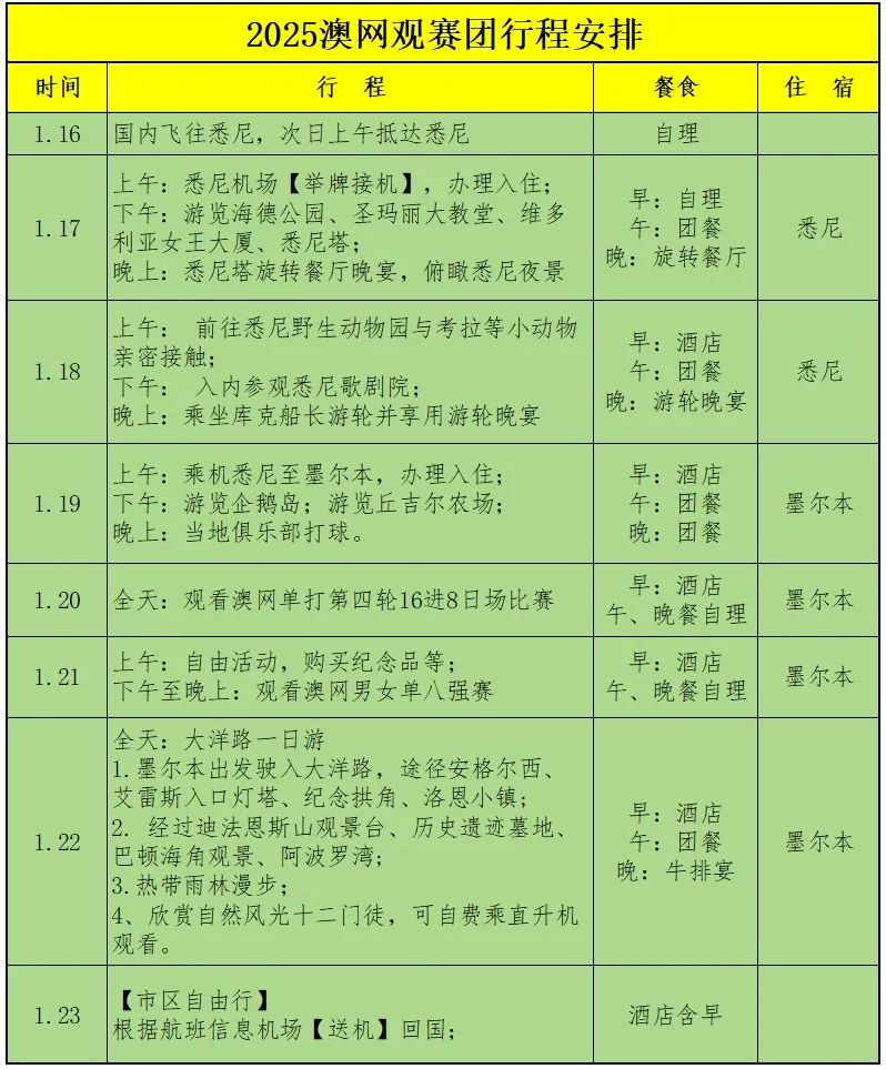 ![]() 2025年澳网 注定会是场内场外都值得关注的一年 德约科维奇牵手穆雷 塞尔维亚人目标直指澳网11冠王 更想以25座大满贯成为史上第一人 ![]() 郑钦文去年赢得澳网亚军 奥运冠军、总决赛亚军等一些骄人战绩 今年再赴墨尔本公园 即便面前屹立着多座高山 但她的眼里只有冠军 ![]() 阿尔卡拉斯 如能在罗德拉沃尔称王 将成为史上最年轻的男单全满贯 ![]() 辛纳 尽管有禁药风波 仍有一个辉煌无比的2024 2025年第一个目标就是澳网卫冕 ![]() 2025年1月12日-26日 澳网盛宴 网球迷的节日 ![]() 由华弘国旅和“PRO网球”共同策划的2025澳网观赛团 开启报名! 跟着我们一起 从中网走向大满贯 ![]() ![]() ···观赛团介绍··· ![]() ![]() 悉尼塔 ![]() 悉尼歌剧院 我们的旅程将从悉尼开始,这里的阳光和海滩是世界上最美丽的风光之一,从悉尼歌剧院到悉尼港大桥,处处都彰显着这座城市的迷人风采。除了美景,还有美食,悉尼塔旋转餐厅和库克船长游轮上享用当地特色大餐,满足味蕾,慰藉心灵。 ![]() 网球之城墨尔本 第二站是墨尔本,作为澳网的主场,这里处处洋溢着网球的热情,整个城市在澳网期间宛如一场宏大的网球派对。我们将组织球友在当地俱乐部打球,体验当地浓郁的网球文化。 ![]() 当然,最重要的是澳网观赛,那将是我们此行的核心。在罗德-拉沃尔这座见证无数传奇的网球圣殿,现场见证世界顶尖选手们的激烈角逐。 ![]() 近距离看企鹅归巢 观赛之余,企鹅岛看企鹅,丘吉尔农场体验农庄文化,游览大洋路观赏自然风光十二门徒,也是墨尔本之行必不可少的一环。 Let's go 行程安排 ![]() * 第一天,1月16日 * 第一天,1月16日 各地出发,乘坐国际航班飞往悉尼 ![]() * 第二天,1月17日 * 第二天,1月17日 上午:抵达悉尼,办理入住 下午:游览海德公园、圣玛丽大教堂、维多利亚女王大厦、悉尼塔 晚上:悉尼塔旋转餐厅自助晚餐 ![]() 圣玛利亚大教堂 ![]() 悉尼塔自助晚宴 ![]() 悉尼塔自助晚宴 * 第三天,1月18日 * 上午:游览悉尼野生动物园,与考拉等小动物亲密接触 下午:参观悉尼歌剧院、海港大桥 晚上:乘坐库克船长游轮并享用游轮晚宴 ![]() 与考拉亲密接触 ![]() 乘坐库克船长游轮 ![]() 享用游轮晚宴 ![]() 美味丰盛的晚宴 第四天,1月19日 第四天,1月19日 抵达墨尔本 上午:乘坐澳大利亚国内航班前往墨尔本 下午:游览企鹅岛;前往丘吉尔农场体验农庄文化 晚上:当地俱乐部打球 ![]() 抵达墨尔本 ![]() 游览企鹅岛 看小企鹅归巢 ![]() 丘吉尔农庄 第五天,1月20日 第五天,1月20日 11点起全天观看澳网日场比赛 ![]() 网球圣殿罗德拉沃尔球场 ![]() 罗德拉沃尔球场 第六天,1月21日 第六天,1月21日 上午:当地俱乐部打球,与当地球友交流 下午至晚上:观看澳网男单、女单八强赛 ![]() 霞光洒落罗德拉沃尔 ![]() 罗德拉沃尔夜场美如画 ![]() 库扬俱乐部以球会友 第七天,1月22日 第七天,1月22日 全天:游览大洋路,观赏自然风光十二门徒,迪法恩斯山观景台、历史遗迹墓地、巴顿海角等景观 ![]() 自然风光十二门徒 ![]() 最美海岸线 第八天,1月23日 第八天,1月23日 上午:自由活动及购物 下午:乘国际航班回国 ![]() 市区休闲时光 ![]() 结束完美旅程 ···行程亮点··· 1、观赛澳网日场和夜场,感受大满贯氛围 2、打卡库扬网球俱乐部等知名球场 3、游览澳洲风景名胜 感受异国文化 4、品尝当地特色美食 5、六晚四星级酒店住宿 ···行程安排··· ![]() ![]() 报名详情 价格:26900元/人 (团队及11岁以下小朋友报名有优惠,另议) 报名截止日期:2024年12月25日 行程时间:2025年1月16日-23日 费用包含: 1. 行程所列六晚酒店双人房; 2. 全程包餐(20日和21日澳网观赛,午、晚餐需自理); 3. 全程当地专业中文司机、导游服务; 4. 行程内司导服务小费、导服、住宿费; 5. 一张澳网夜场三类球票,一张日场二类球票; 6. 当地网球俱乐部打球费用; 7. 境外保险费用; 8. 所有标明参观景点的首道大门票; 9. 当地旅游行程所含的交通费用。 费用不含: 1. 首末段航班费用以及其中所产生的一切费用(如中途餐食、住宿、税费、转机费用及在澳洲境内因航班延误产生的各种费用); 2. 护照、签证相关费用,如未成年人公正,公正相关费用; 3. 除了上文所列,其余不含正餐; 4. 出入境行李的海关税、搬运费、报关费和超重(件)行李托运费; 5. 一切私人费用(如酒店酒水、洗衣、上网、通讯的等费用); 6. 单房差300澳币/人/晚(指酒店普通单人房差); 7. 司导超时游加班费用,司导游每天正常工作时间为09:00-19:00 8. 因个人滞留产生的一切费用; 9. 以上报价中未提及的一切费用。 报名截止日期: 报名联系:白老师 13651141698 识别下方二维码添加微信咨询详情 ![]() 因共同的热爱相聚 为美妙的旅程添彩 今年十一黄金周 我们组织的中网观赛团 吸引全国20多个省市及多位海外华人 共计100多位球友亲临现场观赛 并打卡京城多处地标性俱乐部 ![]() 2025年 我们的球友观赛团 从墨尔本开始 期待你的加入 |