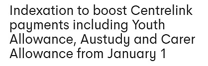 七号台新闻12月8日报道,澳洲多项福利金将从2025年1月1日起上调,上百万符合资格的民众将因此受益。![]() 包括青年津贴(Youth Allowance)、助学津贴(Austudy)、原住民助学津贴(Abstudy)以及照顾者津贴(Carer Allowance)在内的多项福利,将从2025年1月1日起上调发放金额。 对于年满18岁且单身的青年津贴领取人,每两周将额外获得17.3澳元,补贴金额将从459.8澳元上调至477.1澳元。 离家居住单身或有伴侣的青年津贴领取者,补贴金额将从646澳元上调至670.3澳元。 此外,青年津贴的父母收入测试门槛将提高至每年65,189澳元。 ![]() (图片来源:七号台) 对于有子女的单身人士而言,助学津贴将从每两周的815.2澳元提高至845.8澳元,增幅为30.6澳元。 有伴侣的领取者将增长26.3澳元,达到每两周725.8澳元。 在这轮指数化增长中,正在攻读硕士或博士学位并领取原住民助学津贴的人将受益最多,补贴每两周增加54澳元,达到1,231.4澳元。 此外,有超过66万人将从照顾者津贴的提高中受益,该补贴将提高至每两周159.3澳元。 ![]() 与此同时,行动不便者津贴(Mobility Allowance)、双孤津贴(Double OrphanPension)也将相应增长。 这些增长是每年1月为跟上通货膨胀而进行的常规指数调整。 社会服务部长Amanda Rishworth表示,指数调整可以使补贴与生活成本变化保持同步。 |
