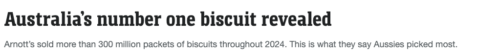 ![]() 临近年底,各种榜单出炉,最近澳洲人评选出了今年大家最喜爱的饼干。 ![]() 2024年最受欢迎的饼干不出意外的是Tim Tam Original! 这款由Arnott's出品的经典巧克力饼干,再次用销量证明了自己的“饼干霸主”地位。 ![]() Arnott's在2024年共售出超3亿包饼干,其中Tim Tam Original位居销量榜首。 尽管澳洲网友对Tim Tam的价格很不满,但显然,大家用实际行动表示:骂归骂,买还是要买的。 据统计,今年9月,一包Tim Tam的售价达到了6澳元,引发了全澳网民的热烈讨论。 不少人愤怒地表示,这简直是对“澳洲精神”的侮辱,甚至有人发现,这款标志性饼干在英国买居然更便宜! ![]() 虽然Tim Tam占领榜首,但2024年的销量榜显示,咸味饼干也正在崛起。 在前五名中,Tim Tam是唯一的一款甜味饼干,紧随其后的分别是烧烤饼干、鸡肉脆皮饼干、披萨饼干和经典Jatz咸饼干。 ![]() Arnott's作为饼干大户,旗下的饼干和薄脆产品多达130种。 Milk Arrowroot、Arnott's Water Crackers、SAO、Ice VoVo 和 Scotch Finger这些也是不少澳洲人的童年回忆,2024年继续保持稳定的销量。 大家今年心里的top 1饼干是哪个呢? ![]() ![]() ![]() ![]() ![]() 很开心认识你! 我是墨妮卡 ![]() |