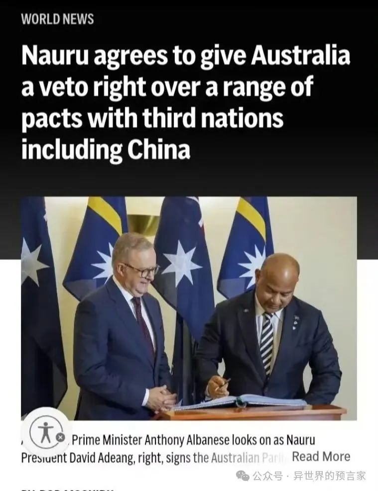 据美联社报道,澳大利亚周一宣布与瑙鲁达成数千万美元的协议,该协议赋予澳大利亚对这个太平洋小环礁可能希望与包括中国在内的第三国达成的一系列协议的否决权。![]() 根据将于明年实施的协议,澳大利亚将在五年内向这个偏远国家的1.2万人口提供1.4亿澳元(合8900万美元),其中包括4000万澳元(合2600万美元)用于加强治安和安全。 澳大利亚总理安东尼·艾博年(Anthony Albanese)在澳大利亚议会大厦与瑙鲁总统戴维·阿德昂(David Adeang)发表的联合声明中表示,“认识到我们中一方的安全影响到我们双方的安全,该条约规定,瑙鲁和澳大利亚将共同同意其他国家在瑙鲁安全、银行和电信部门的任何参与”。 阿德昂说,瑙鲁与其前殖民宗主国澳大利亚的伙伴关系对他的国家“至关重要”。 该协议与今年5月与图瓦卢达成的协议有一些相似之处,图瓦卢是另一个太平洋小岛国,人口与瑙鲁相似,该协议也赋予澳大利亚对第三国交易的否决权。 是可谓: 瑙鲁者,南太平洋之岛国,蕞尔之地,疆域促狭,民寡而力微。其史多舛,往昔为列强所据,先归德意志于 1888 年,一战之际入澳之手,后又遭日倭之侵于 1942 载,至 1947 年则托于联合国。洎 1968 年乃得独立,然观其源,向未真独立也。 其经济式微,结构单简,尝赖磷酸盐之采以为生,洎矿竭而困窘见。遂有卖主权以图财利之举,虽或为势所迫,然亦失大义。且官方语兼英语,足见西化之深,本土文化之未昌。 嗟夫!瑙鲁之境,如沧海一粟,于世界之林,飘摇若萍。虽立为国,而主权难全,经济难兴,文化难振,其途漫漫,未知何往,亦可叹也。 |