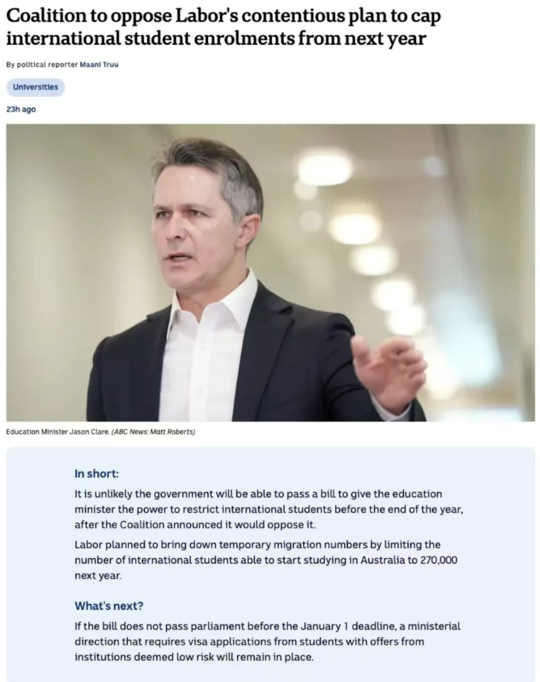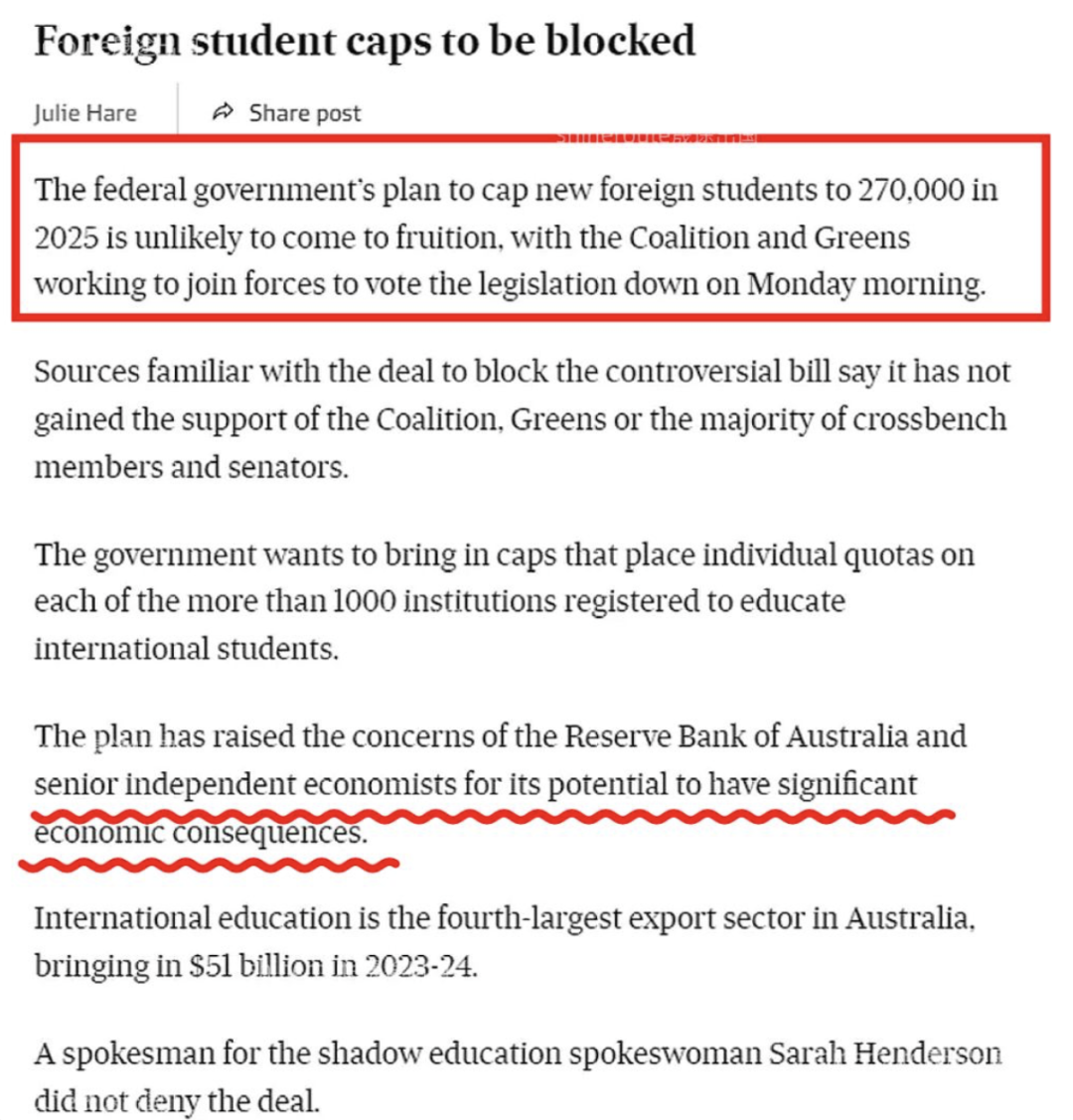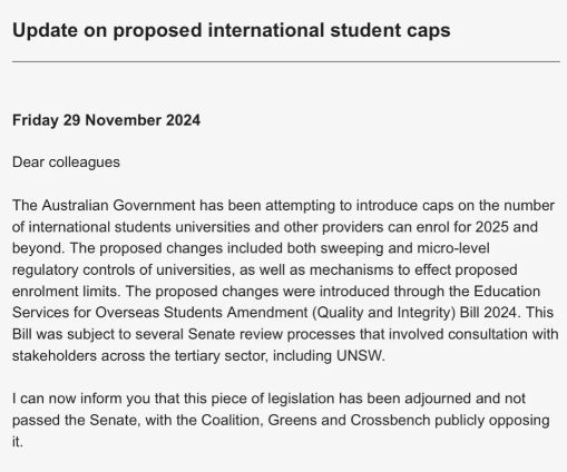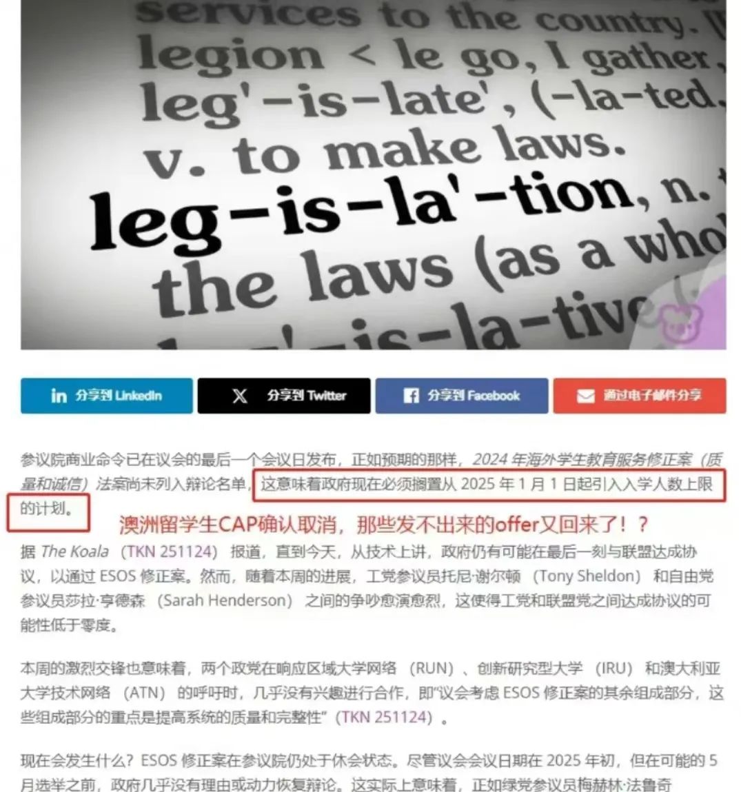 点击上方蓝字关注我们 LONGEVER ![]() ![]() ![]() LONGEVER ![]() ![]() ![]() LONGEVER ![]() ![]() ![]() LONGEVER ![]() ![]() ![]() LONGEVER 申请澳大利亚院校的同学有救了!之前,澳大利亚政府提出了针对限制新入学留学生人数的提案,没想到法案并没通过参议院,迎来了反转! 8月澳洲教育部长Jason Clare宣布,从2025年起,留学生人数上限将定为27万。根据官方数据显示,截至23年底,申请赴澳留学的国际学生人数已突破50万大关,工党这个政策的提出就意味着明年澳洲要把留学人数减少近半。 ![]() 图源:小红书 这样不仅影响了留学生的申请,更对澳洲教育产业造成了不小的冲击,不过由于给各个大学的留学生招生限额已下发,不少学校已经做出应对措施,比如新南暂停了明年所有学期的申请、悉尼大学很多专业已经招满停招...没想到在所有人都认为大局已定的时候,剧情来了个大反转。 这个法案根本就无法通过! 据最新报道,联盟党和绿党已经联手反对了工党提出的“留学生上限法案”,因此该法案必然不能通过。 ![]() 图源:小红书 雅思、托福、小语种 公共英语、商务英语 考研英语、大学英语四六级 留学、游学、签证、移民 海外投资、国际学校 扫右侧二维码免费咨询 ![]() ![]() ![]() 联系电话:18915121655 (微信同号) PART.1为何又将限令短期搁置? 为什么会发生这样的政治转变呢?由于澳洲两党之间的分歧与争端,致使双方难以达成共识,所以关于留学生数量限制的法案在近期不会再有进一步动作,下一次审议则要等到2025年初。 从短期来看,这一结果无疑让澳大利亚各大学如释重负。尤其是对于2025年第一学期的招生工作而言,法案的搁置意味着原本计划于2025年1月1日实施的留学生招收配额限制政策将被搁置,大学得以维持现有的招生计划,不必受新上限的约束。 ![]() 图源:小红书 其次,留学产业作为澳洲主要的经济来源之一,其为澳洲带来的经济贡献和发展是相当可观的。如果留学生的数量真的收到了配额的限制,高等教育大学以及澳洲整体的经济来源将会受到非常严重的影响。 此外,澳大利亚的本地居民常常将房价和工作等问题归咎于留学生。留学生的涌入,不仅可以提升澳洲的教育质量、学校设施建设,而且对教育行业的整体发展也带来了积极影响。 如果对留学生名额实施限制,学校或将面临收入的下降,进而难以维系设施升级与教学质量优化的进程,还可能引发学校排名的下滑,不利于学校的长远发展。同时,那些依赖优质教育资源以满足教育需求的当地家庭,也将受到影响。 所以在这些大学的强烈说服下,自由党开始重新审视这一政策,最终选择了反对。 雅思备考、留学申请 可咨询客服领取优惠 ![]() 联系电话:18915121655(微信同号) 教得好 管理严 出分快 PART.2 重新开始发放入学offer ESOS修正案法案目前处于休会状态,然而未来会怎样,评论两极分化。未来澳洲留学生限制法案趋势不明朗,法案搁置给国际学生市场带来不确定性,如何平衡学生数量与教学质量,还是摆放在澳洲政府面前的一道难题。 但至少以现在的情况来看,法案的搁置代表澳洲大学们又可以重新开始发放入学offer了!!例如UTS、南十字星大学、托伦斯大学、ACU等等也纷纷发表通知,重新开始发放明年入学的offer啦!这一决定无疑为众多正在等待offer的留学生带来了极大的宽慰和喜悦。 这两天,澳洲八大之一的澳大利亚新南威尔士大学(UNSW)官方正式确认了一个备受留学生关注的重要消息——原本旨在限制留学生数量的CAP政策已被正式取消。 ![]() 与此同时,UNSW自11月21日起推行了“Offer轮次制”,即分多批次向学生发放录取通知书,优先挑选符合条件的优秀学生予以录取。众多有意赴澳深造的中国学子对此表示热烈欢迎:该法案的暂停实施无疑为澳大利亚各高校带来了一丝喘息之机,尤其对于2025年第一学期的招生工作而言,这一决定意味着没有新的上限限制,,各校可以保持原有的招生规划不变。 另外有一些院校也做出了一些调整: 01悉尼科技大学 重启UTS College文凭奖学金项目,奖学金额度分别为4,000澳元和8,000澳元,2025年2月入学的境外申请截止日期为11月30日,境内申请截止日期为2025年1月15日。 02纽卡斯尔大学 为2025年入读主修课程的国际留学生准备了6,000澳元的奖学金,只要满足课程入学要求即可获得,该奖学金适用于大多数本科和授课型硕士课程。 03中央昆士兰大学 所有课程均提供25%的学费减免,吸引更多国际学生。 04澳洲天主教大学 2025学年的申请现已重新开放,除护理专业外,其他所有专业均接受申请! PART.3 抓住缓冲期,抓紧交申请 在新法案被搁置的情况下,目前仍实行107号指令(自去年12月起实施,要求移民官员优先考虑那些来自低风险学校的学生的申请。这对留学生是有利的,所以想申澳洲的同学务必抓紧时间行动,现在正是最佳时机!因为未来仍有限制留学生人数的风险。 ![]() 第107号指令:移民局被要求优先处理“低风险”的留学申请 首先,下一次参议院会议将于2025年初举行,届时两党是否会达成一致、重新推行限制留学生人数的政策尚未可知。 其次,2025年澳大利亚即将迎来新一任大选,若产生新的执政党,也可能会带来留学政策的不确定性。因此,建议大家尽快提交申请,以免错失良机。特别是申请低风险等级大学比如澳洲八大等,不仅能享受政策优势,还能提高签证通过率。 所以法案未能通过,澳洲的大学可能会