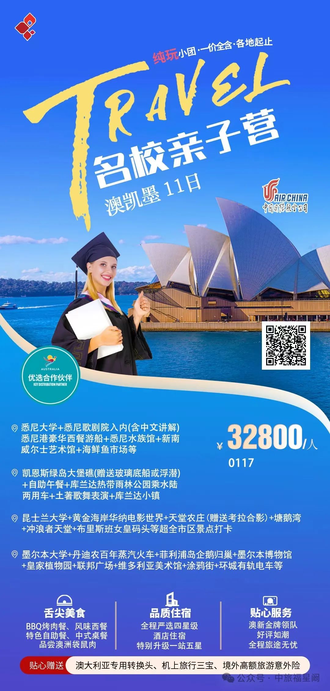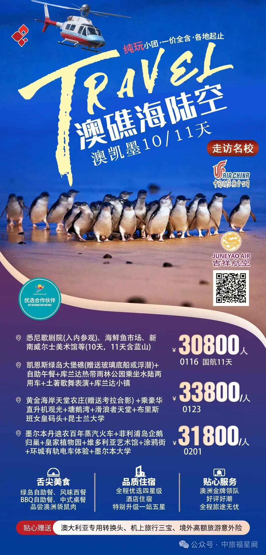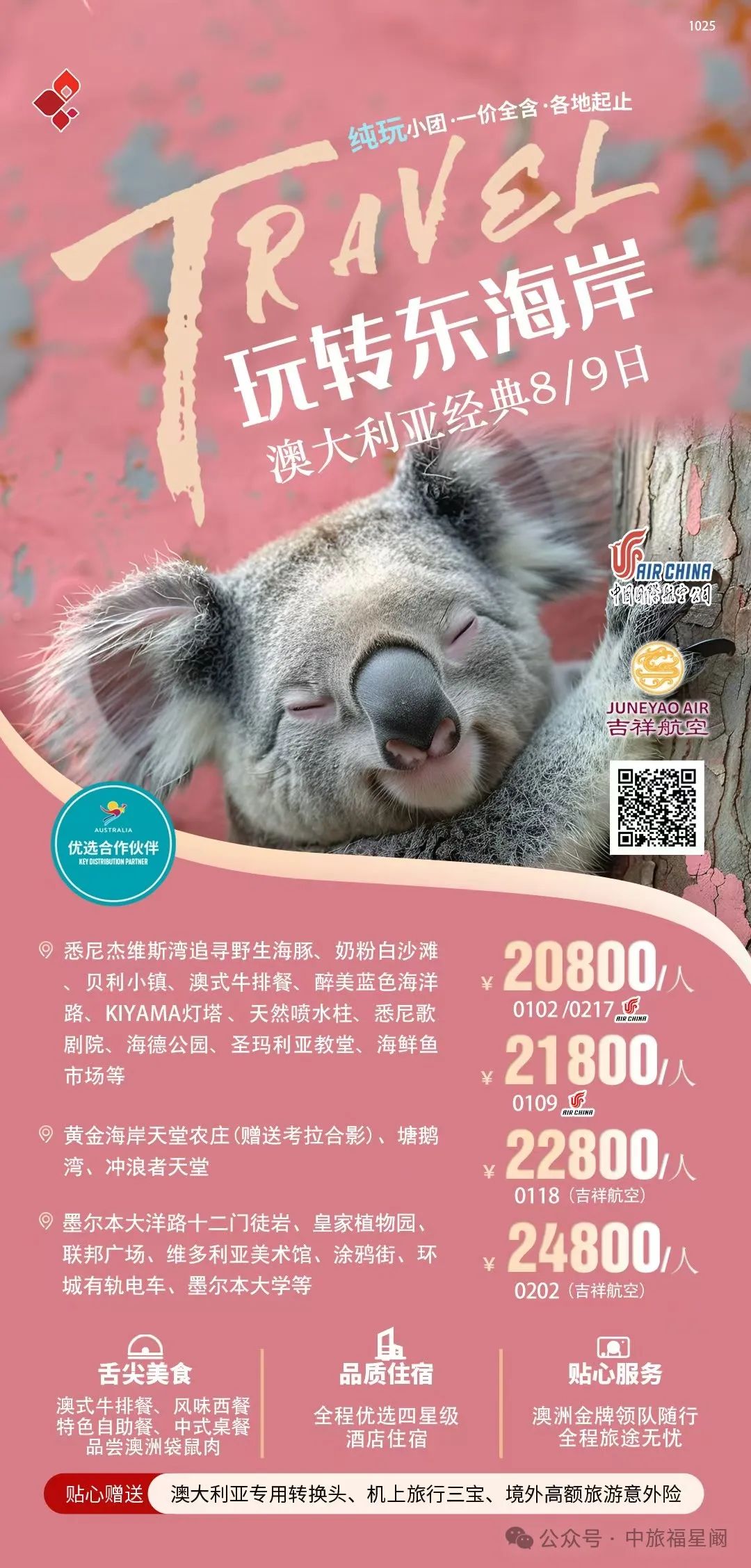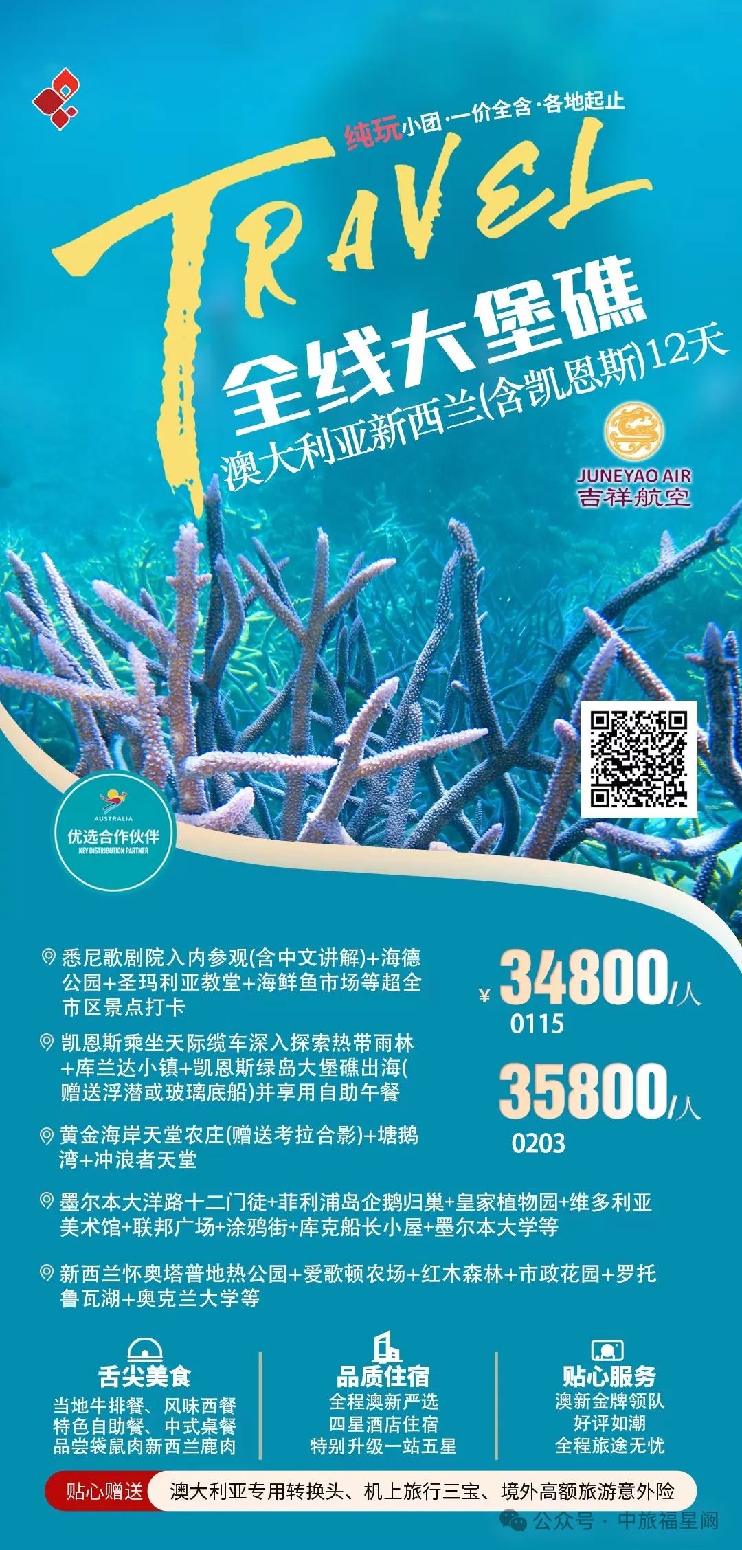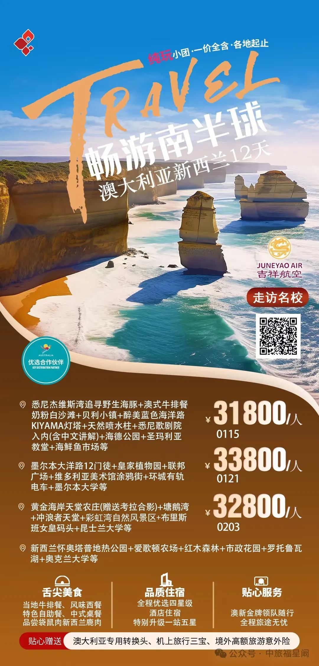 当北半球被寒冬笼罩,南半球的澳洲正闪耀着独特的魅力,宛如一颗璀璨的明珠,静候着旅人们的探寻。这里,是自然的奇幻乐园,是都市活力与原始野性碰撞出奇妙火花的地方。![]() 悉尼歌剧院,那标志性的帆船造型建筑,在阳光下熠熠生辉,与悉尼港的湛蓝海水相互映衬,奏响着艺术与自然的和谐乐章。漫步在悉尼港畔,海风轻拂脸庞,感受着这座城市的悠然与繁华。 ![]() ![]() 大堡礁,是海洋给予澳洲的绝美馈赠。五彩斑斓的珊瑚礁群如海底花园般绚烂,热带鱼穿梭其间,灵动而自在。戴上潜水镜,纵身跃入这片清澈的海底世界,与海洋生物来一场亲密接触,仿佛自己也成为了它们中的一员。 ![]() 而在澳洲的内陆,广袤无垠的红色沙漠震撼人心。乌鲁鲁巨石孤独而雄伟地矗立在这片红色大地之上,随着光线的变化,它呈现出各异的色彩,诉说着古老的原住民传说,让人不禁对这片土地的历史与文化肃然起敬。 ![]() 墨尔本,这座充满文艺气息的城市,街头巷尾弥漫着咖啡的香气和艺术的氛围。复古的电车穿梭在城市之间,带您领略古老建筑与现代艺术的完美融合,无论是时尚的街区还是宁静的公园,都散发着独特的魅力。 ![]() 黄金海岸,阳光、沙滩、海浪,这里是冲浪者的天堂。绵延的金色沙滩上,人们尽情享受着阳光的沐浴,在波涛汹涌的海浪中挑战自我,感受着大海带来的无尽活力与激情。 ![]() 澳洲的美食也不容错过,鲜嫩多汁的澳洲牛排,搭配上当地特色的葡萄酒,味蕾在舌尖上跳跃,体验一场舌尖上的盛宴。还有新鲜的海鲜、香甜的澳芒,每一口都是大自然的恩赐。 ![]() ![]() |