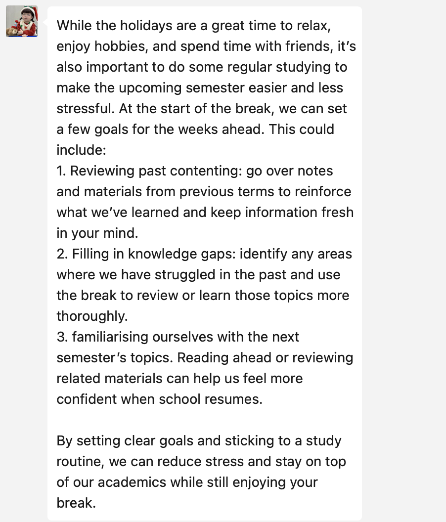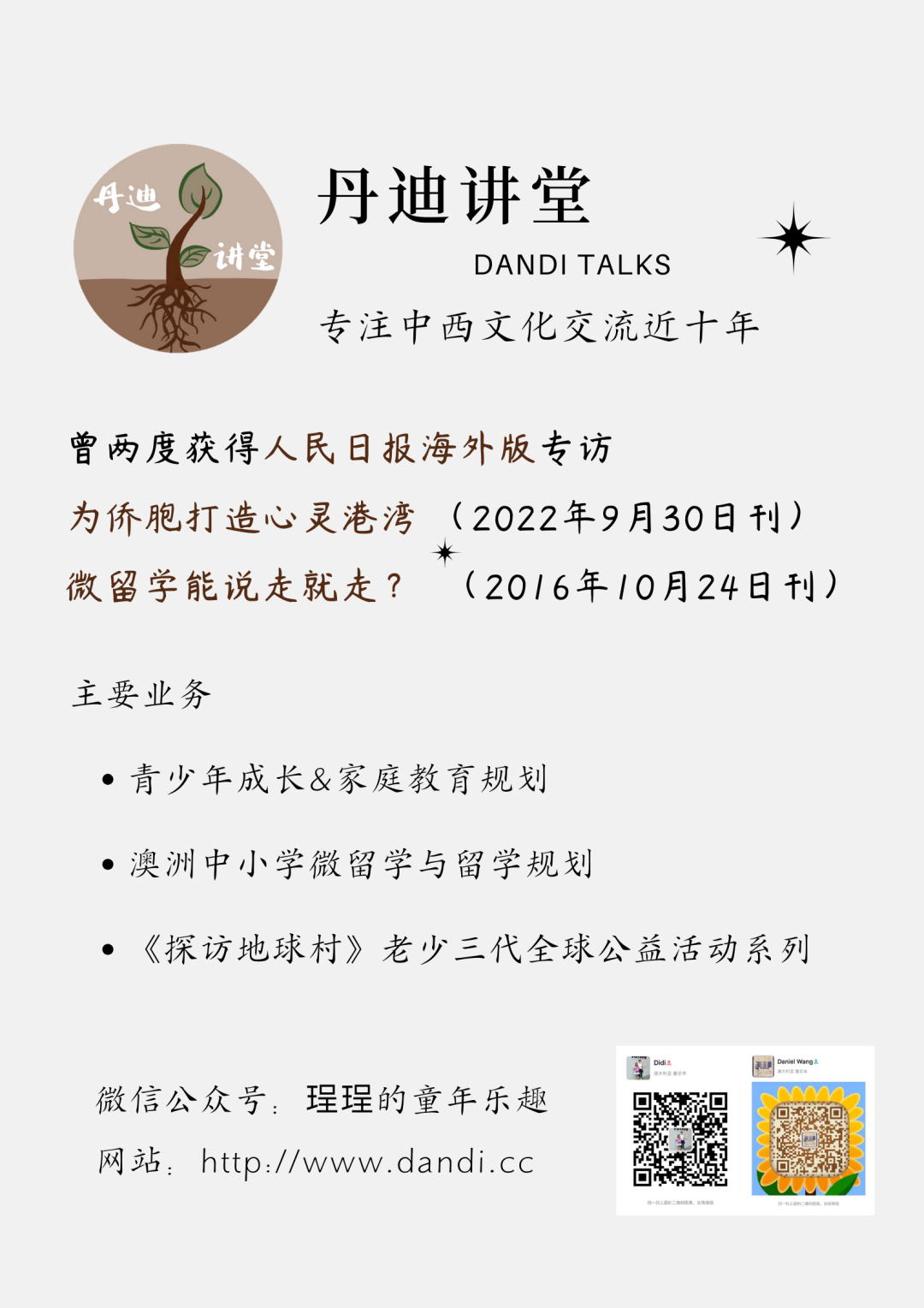 点击上方”珵珵的童年乐趣“关注。丹迪讲堂 九年来专注中西教育文化交流 私人定制澳洲留学/微留学解决方案 服务上千家庭曾两度获得人民日报海外版专访为侨胞打造心灵港湾 (2022年9月30日刊)微留学能说走就走? (2016年10月24日刊) 原创文章,转载请联系Didi,微信:bdyjade。 墨尔本所在维多利亚省的term 4 最后一天是12月20日(下周五),而许多私立学校已经提前一到两周放假了。再开学,就是2025年1月29日或30日,新的学年。 ![]() 南半球的悠长夏日假期,已经拉开序幕。对于没有假期作业的澳洲学生而言,大把时光如何安排,各家有各家的规划。 -1- 回国 几周前,Didi组织留学和移民年末聚会时,80%的家庭都说要利用这个长假期回国,与家人团聚,探望亲戚,走访朋友,休闲放松。有些孩子接近高考年的朋友说,今年抓紧聚,明年的几个学生假期就在澳洲安心备考,不折腾了。 往年,有的朋友会利用澳洲假期让孩子回国内学校”插班“,感受不一样的教学氛围,提升中文读写水平。都说人是环境的产物,更何况是可塑性极强的孩子。澳洲长大的小朋友,在国内学校读了几周书,放学写作业效率大大提高,家长挺惊喜。 也有不少孩子,会参加国内的不同主题的训练营/兴趣班/文化研学旅行。当年谷爱凌不就是美国暑假回国,因找不到发小伙伴同玩,随即去咱海淀黄庄学奥数,进而突飞猛进的吗?😄 -2- 跨省跨国旅行 家庭自由行:我家出行基本都是珵珵爸订机票,他说临近school holiday,机票通常会贵,想要合适的deal,要提前规划。比如这次9月份的学生假期去欧洲,他提前半年订好了机票和行程,我们一家三口的总花费算下来,考虑到欧洲的吃住物价,是超值的。 孩子独立参加欧洲or北美研学营,是另一个不错的选择。比如墨尔本EQD教育中心,总会在学生假期组织这样的研学活动,带学生走访英美名校、参观高科技企业和当地知名的研究中心等等。 有一些孩子,会因某项突出特长(比如乐器、舞蹈、表演等)加入艺术文化组织,有机会走访不同国家,并在当地参加演出和交流。还有一些孩子参与不同学科的竞赛角逐,表现优异者将有机会代表澳洲去参加国际Final比赛。 -3- 假期自定义 算下来,这是Didi一家在墨尔本的第11个夏天了。与小时候的家长主导不同,读中学之后,珵珵倾向于自己安排假期schedule,家长根据需要提供精神和环境支持。 这是她头脑风暴之后,热气腾腾制定的假期计划: 一、学科复习 查缺补漏,特别是提高相对薄弱的部分(她写的笔记如下): ![]() 二、个性化定向活动 娃近期的聚焦点是如下三个:1⃣️ 更新”探访地球村“欧亚澳篇 2⃣️录制中文经典学习笔记 3⃣️组织并开展主题访问 目前均已开启,做事的魅力就在于此。无论结果如何,都是很好的锻炼。 三、用喜欢的方式放松,把时间花在热爱上 老师说,未来非常稀缺的一种能力,是会休息! 主动选择去做热爱的事情,有可能享受心流状态,还能补充能量。同时,又不会被这个海量信息时代的被动推送,牵着鼻子走,掠夺注意力。 比如:家庭旅行、和朋友们聚、看电影,读好书、做好吃的,去大自然里静心,游泳、K歌、跳舞、画漫画、学习怎么变得更美等等。 如果您想要获取有关澳洲短期留学、长期留学、境内升学更多信息,或者探讨孩子学业与成长,欢迎私信Daniel和Didi,联系方式见文末名片。 更多原创文章⬇️