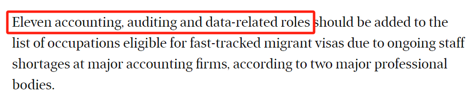 报告还指出,由于国内候选人、国际学生、新移民或持有技术移民签证的人无法充分填补这些职位空缺,这些机构希望将11个会计、审计和data相关岗位纳入快速移民签证的职业清单中。