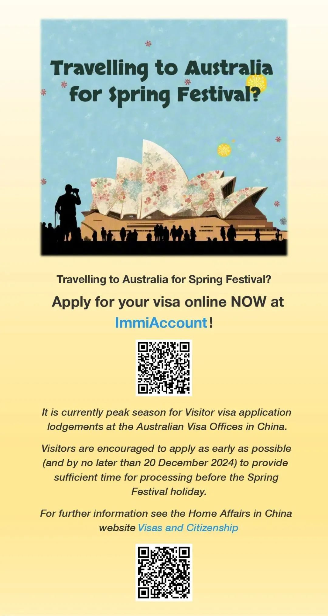 ![]() 春节将至,澳大利亚也将迎来众多中国游客,澳大利亚驻华使领馆签证处温馨提醒您尽早提交前往澳大利亚的访客签证(600类别)申请,以确保行程无忧。您可以扫描下方ImmiAccount二维码,或登录官网(https://immi.homeaffairs.gov.au/help-support/tools/immiaccount)直接进入申请流程。 ![]() 同时,澳大利亚驻华使领馆签证处将于2024年12月25日(星期三)至2024年12月27日(星期五)以及2025年1月1日(星期三)关闭。在关闭期间,澳大利亚驻华签证处将无法回复任何咨询或处理任何签证申请(包括快速签证申请)。 欢迎您扫描Visas and Citizenship二维码或前往官网(https://china.embassy.gov.au/bjng/Visas_and_Migration.html),查询更多信息。 |