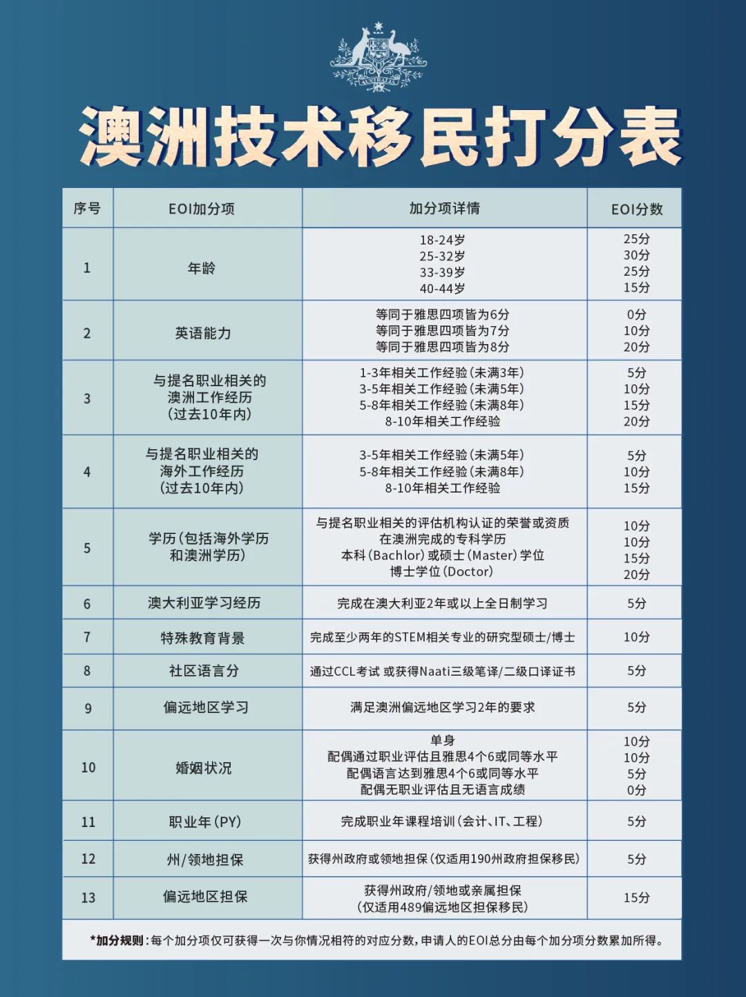 ![]() 咨询微信:yiminnews 新年伊始,澳洲移民局公布了2023-2024财年的技术移民审批数据,包括各州详细的获邀人数、获邀分数、获邀职业、剩余配额等情况。 看看2025年有哪些职业可以上岸?今年有计划申请澳洲移民的朋友都可以作为参考!我们一起来看看吧! 🦘澳洲技术获邀情况 根据来源国数据显示,23-24财年下签最多的国家前三位还是印度、中国和菲律宾,且澳洲各区域的数据也具有参考价值,比如西澳就迎来了3.7%的配额数据增长,新州依然拥有最多的配额: • 新州:57,458人,占据全国总移民配额的30.2% • 维州:50,146人,占26.4% • 昆州:23,028人 • 西澳:20,101人,同比增长3.7% • 南澳:16,556人 ![]() 在技术移民类别中,23-24财年的配额为137,100个: 186雇主担保类186:36,825 491/494偏远地区提名类别:32,300 190州/领地提名类别:30,400 189独立技术移民类别:30,375 858全球人才(独立)计划:5000 188商业创新与投资类别:1900 124高精尖人才移民类别:300 ![]() ✅189最新获邀情况 ▶️递交数据:189在去年已经历三轮邀请,分别是6月、9月和11月。6月共邀请5292份申请,9月则上升至7973份申请,11月初的189更是邀请了15000个申请人,在此基础上我们推测12月的递交数据也不会少。 ▶️剩余配额:虽然189的递交数量非常多,但好消息是189签证依然还有批签配额,虽然23-24财年前五个月一共批复了9404个,但随着批签速度的下降,剩余配额还有申请余地,条件合适的申请人建议尽早递交。 ▶️评分情况:6月的邀请分数线在65-95之间,且最低65分档位有528份邀请;9月随着受邀人数增多,分数上涨了10分左右,80分为峰值;在最新的11月邀请中,邀请分数峰值达到了75分,很多八炸客户成功获邀,值得一提,90-95分的申请人也达到了惊人的数量(2739和1841份),可见189的分数竞争愈演愈烈。 ▶️189下签职业Top10: ① 254499 注册护士nec ② 351311 主厨 ③ 241111 幼儿(学前)教师 ④ 221111 会计师(普通) ⑤ 233512 机械工程师 ⑥ 233211 土木工程师 ⑦ 254412 注册护士(老年护理) ⑧ 241411 中学教师 ⑨ 261313 软件工程师 ⑩ 261111 信通技术业务分析师 ![]() ▶️总结:189的优先级还是很高,会计类获邀均分为85,护理、教育等三宝专业依然有大量缺口,土木工程、建筑和医疗类受邀增多,最低有65分获邀数据,这些职业或将成为新的优先级别,申请人如果能满足优先级和高分数邀请,可以尽快申请,抢占剩余名额。 ✅190最新获邀情况 ▶️递交数据:190的递交数据逐月上升,11月的递交数据为2807个,西澳率先在12月发力,多数州担保仍然有不少名额。 ▶️剩余配额:190的批复进度推进到6月初,11月低积压申请有将近29000个,相比之前有所上升,剩余配额虽然充足,但也有优先级“插队”情况发生。目前维州、塔州、南澳的已用配额接近1000,剩余比例接近50%,如果还未申请可继续递交;但申请人也可以考虑剩余配额较多的新州、北领地、堪培拉作为备选。 ▶️评分情况:190的竞争压力不亚于189,光是85分以上的申请人就达到6000人,在最新邀请中,依旧是境内申请人以及四个重点职业领域(建筑、医疗保健、社会服务和餐饮旅游)的申请者占据了主导地位。新州最新一轮的190邀请中,大致集中在80-95分之间;在ACT官网的数据中大多在80-120分。 ▶️190下签职业Top10: ① 254499 注册护士nec ② 261313 软件工程师 ③ 221111 会计师(普通) ④ 411411 登记护士 ⑤ 233211 土木工程师 ⑥ 241111 幼儿(学前)教师 ⑦ 261111 信通技术业务分析师 ⑧ 351311 主厨 ⑨ 233512 机械工程师 ⑩ 261312 开发人员程序员 ![]() ▶️总结:190的竞争仍然很激烈,像会计、幼教、土木工程师、电气工程师等热门职业依旧在榜,对于这些职业的申请人来说,把握加分5分非常重要,尤其在高竞争职业中! ✅491最新获邀情况 ▶️递交数据:23-24财年的491递签数量依旧不高,尤其是新获邀数量少,但11月已经破千达到1304个。很多申请人选择优先递交189和190,但如果在分数方面不占优势的话,可以考虑走491的方式顺利拿到邀请。 ▶️剩余配额:491的配额远小于189和190,且大部分都集中在三宝和建筑类职业,海外人士开放的通道并不多,且491转191永居的申请也已经达到了惊人的10000个,但如果申请人想从小众行业突破一下,机会还是很大的。 ▶️评分情况:虽然491并没有前两个项目那么热门,但85分以上的申请人数直达1000,尤其是会计专业,分数更是卷的很高。境内491获邀分数在60-110分区间,部分职业达到125分;境外491的获邀分数在65-115,部分职业高达120分。 ▶️491下签职业Top10: ① 221111 会计师(普通) ② 351311 主厨 ③ 233512 机械工程师 ④ 233211土木工程师 ⑤ 233914 工程技术员 ⑥ 261111 信通技术业务分析师 ⑦ 263111 计算机网络与系统工程师 ⑧ 233311 电气工程师 ⑨ 411411 登记护士 ⑩ 141111 咖啡厅或餐厅经理 ![]() ▶️总结:澳洲491的境内申请压力比境外要小一些,分数要求也低5分左右,想申请新州的小伙伴要注意一下,很多职位已经无法申请,尤其是一些商科类,在递交的时候一定要重新确认职业列表。 “澳洲技术移民适合年轻、英语好的申请者,如果是年龄、英语不占优势,但是有创新企业管理/投资经验,或是在自身行业内有突出成就的朋友,则可以考虑澳洲NIV创新移民签证!” 想了解更多澳洲移民\签证咨询可添加微信:13232873385 澳洲技术移民 澳洲技术移民主要指的是189、190、491签证;申请人需要根据学历、工作经验、年龄、英语水平等进行打分,及格分65分,分