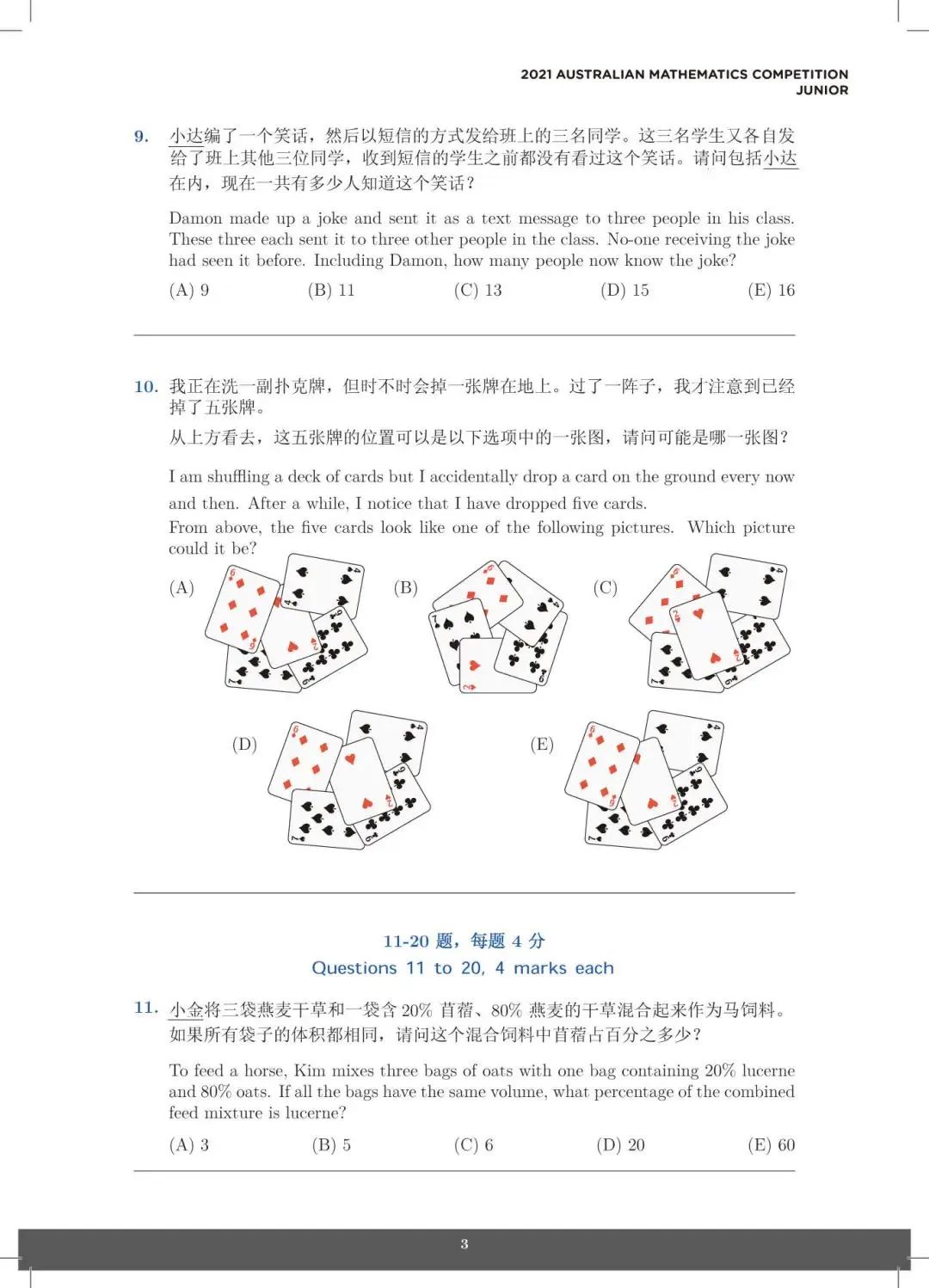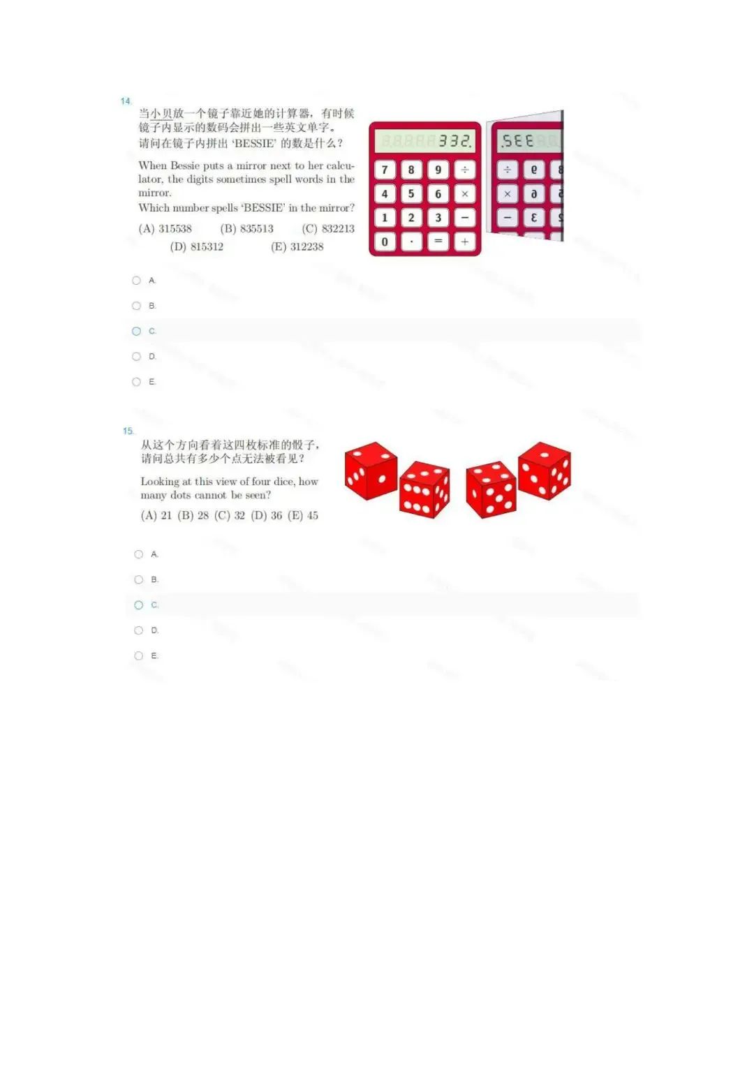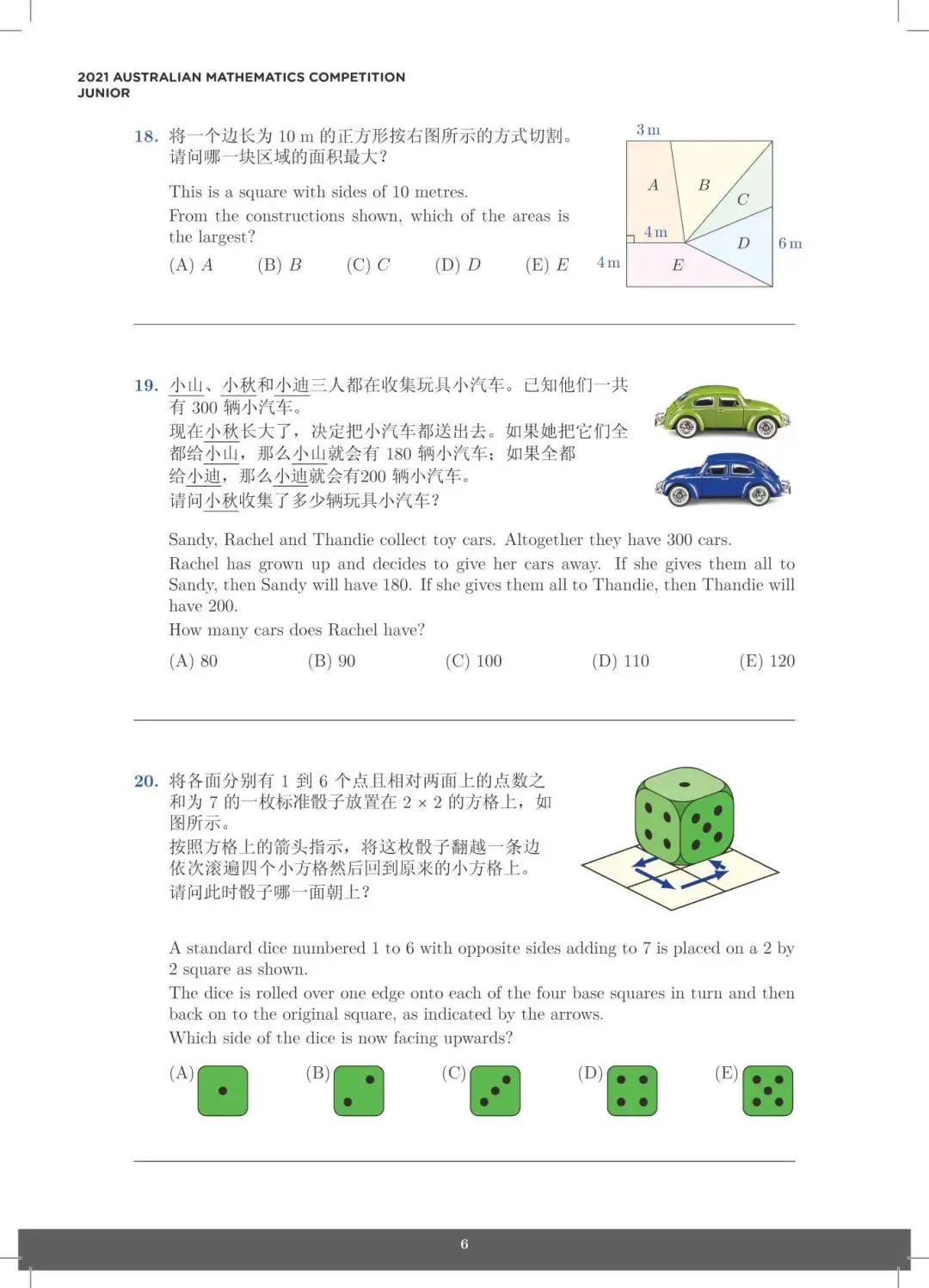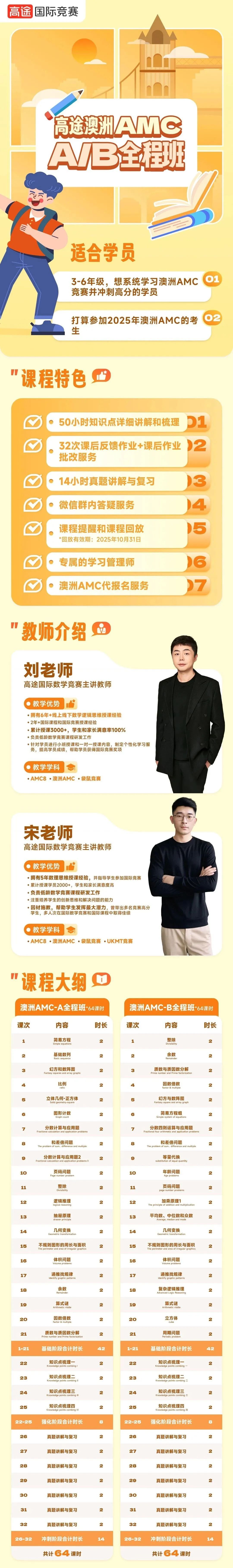 澳洲AMC竞赛因其实际益处而广受欢迎。对中国学生而言,澳洲AMC竞赛题目设计全面且具挑战性,含金量高,有助于真正锻炼学生的数学思维和解题技巧。更值得一提的是,线上考试形式便捷,且成绩永久有效,是学生未来升学和留学的重要加分项。 为了让家长们了解澳洲AMC难度,整理了澳洲AMC各等级的真题,关注公众号领取~ ![]() 澳洲AMC LEVEL A真题 ![]() ![]() ![]() ![]() 澳洲AMC LEVEL B真题 ![]() ![]() ![]() ![]() 澳洲AMC LEVEL C真题 ![]() ![]() ![]() ![]() 澳洲AMC LEVEL D真题 ![]() ![]() ![]() ![]() 澳洲AMC LEVEL E真题 ![]() ![]() ![]() 关注公众号领取澳洲AMC真题 ![]() 澳洲AMC竞赛考点 ![]() ✅图形问题 涉及简单的观察图形和复杂的统计图形等各类图形问题。 图形翻折、三视图、图形还原等题目难度大且考的频率高,需要提高空间想象力,多做训练。 ✅行程问题 建立在基本公式s=vt之上,演变出的追击和相遇问题。 ✅图形面积和体积 基本计算公式是得分的关键,进阶难度的题型要结合因数分解答题,熟练应用才能保证准确率。 ✅方程式 主要考察是二元一次方程组,这部分初中内容,对低龄学生来说是个难题,没学过的需要结合场景应用,安排知识点专项复习。 能解二元一次方程组是基本能力,难点在于需要根据题目条件列出方程组。 ![]() 澳洲AMC课程 ![]() ![]() ![]() END ![]() 澳洲AMC培训 扫码咨询 ![]() |