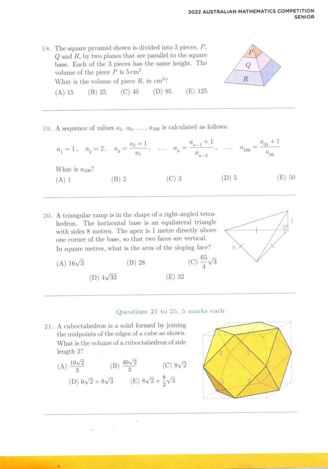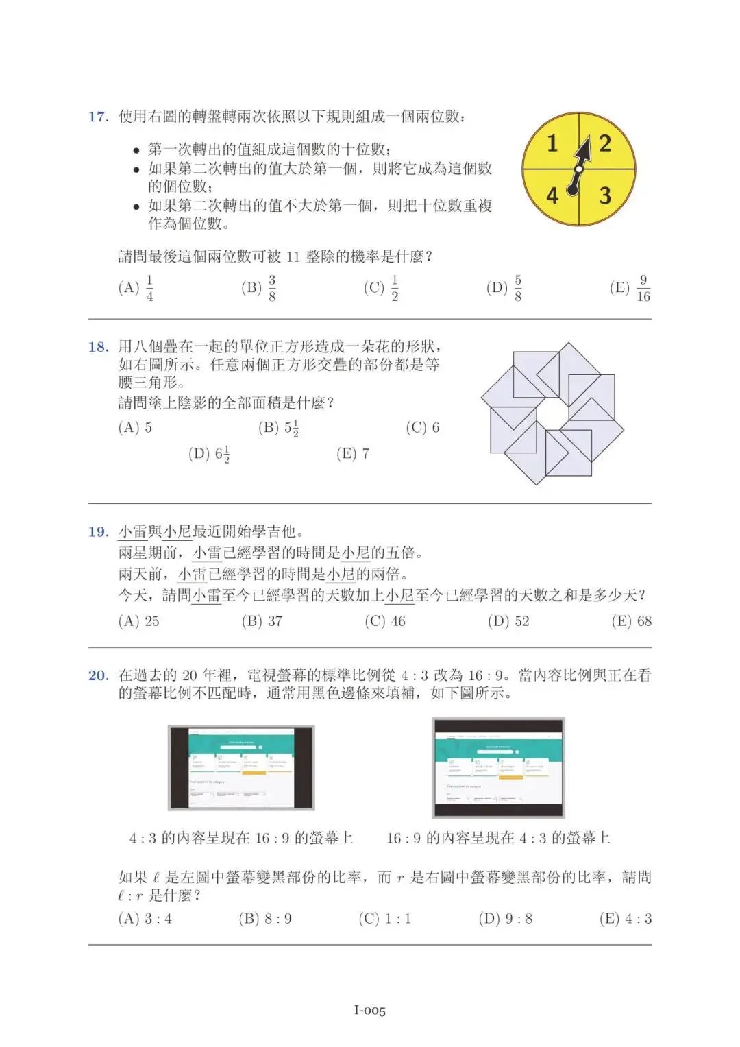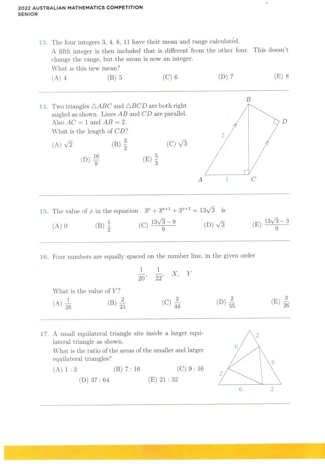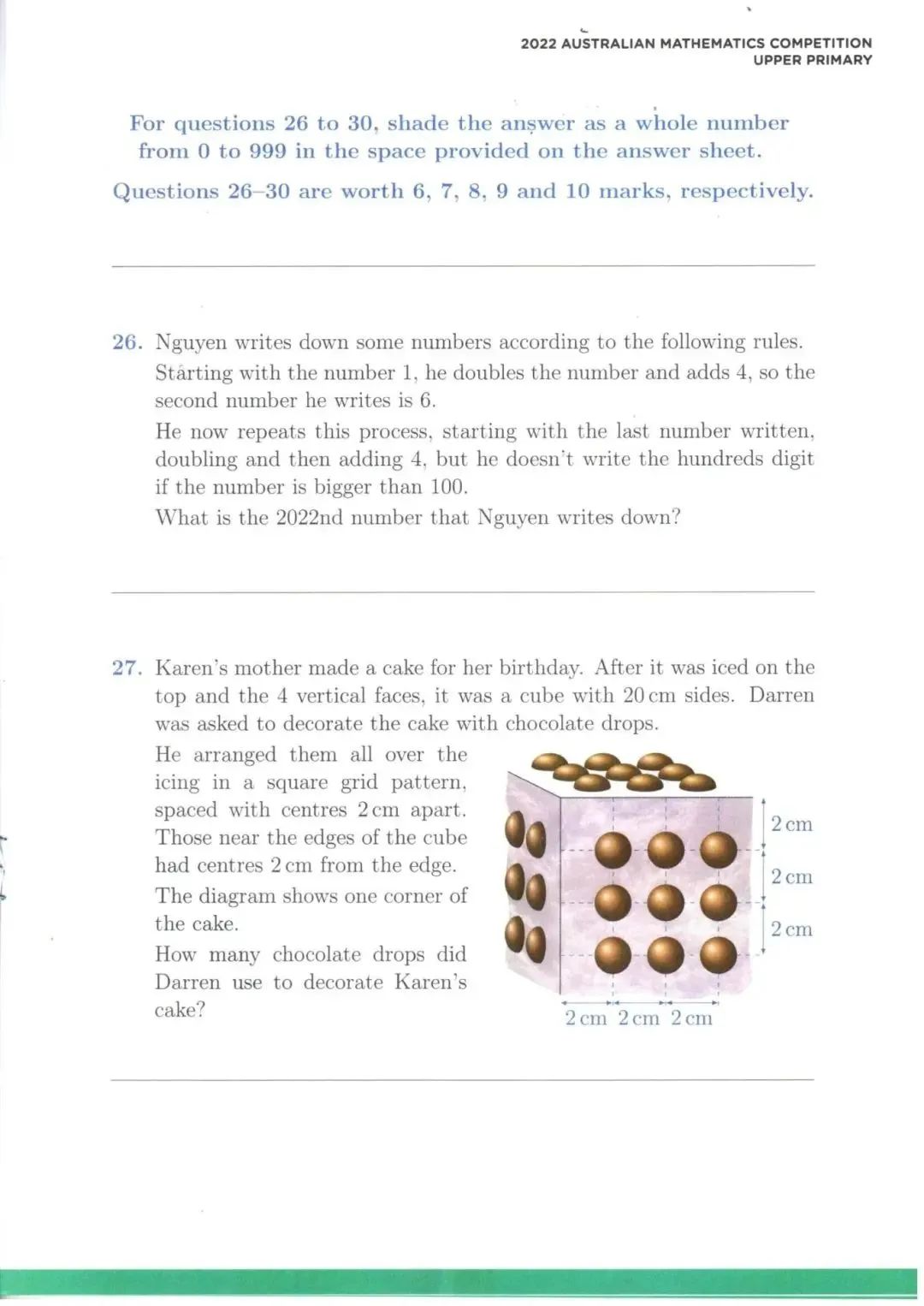 澳洲AMC竞赛因其实际益处而广受欢迎。对中国学生而言,澳洲AMC竞赛题目设计全面且具挑战性,含金量高,有助于真正锻炼学生的数学思维和解题技巧。更值得一提的是,线上考试形式便捷,且成绩永久有效,是学生未来升学和留学的重要加分项。 为了让家长们了解澳洲AMC难度,整理了澳洲AMC各等级的真题,关注公众号领取~ ![]() 澳洲AMC LEVEL A真题 ![]() ![]() ![]() ![]() 澳洲AMC LEVEL B真题 ![]() ![]() ![]() ![]() 澳洲AMC LEVEL C真题 ![]() ![]() ![]() ![]() 澳洲AMC LEVEL D真题 ![]() ![]() ![]() ![]() 澳洲AMC LEVEL E真题 ![]() ![]() ![]() 关注公众号领取澳洲AMC真题 ![]() 澳洲AMC竞赛考点 ![]() ✅图形问题 涉及简单的观察图形和复杂的统计图形等各类图形问题。 图形翻折、三视图、图形还原等题目难度大且考的频率高,需要提高空间想象力,多做训练。 ✅行程问题 建立在基本公式s=vt之上,演变出的追击和相遇问题。 ✅图形面积和体积 基本计算公式是得分的关键,进阶难度的题型要结合因数分解答题,熟练应用才能保证准确率。 ✅方程式 主要考察是二元一次方程组,这部分初中内容,对低龄学生来说是个难题,没学过的需要结合场景应用,安排知识点专项复习。 能解二元一次方程组是基本能力,难点在于需要根据题目条件列出方程组。 ![]() 澳洲AMC课程 ![]() ![]() ![]() END ![]() 澳洲AMC培训 扫码咨询 ![]() |