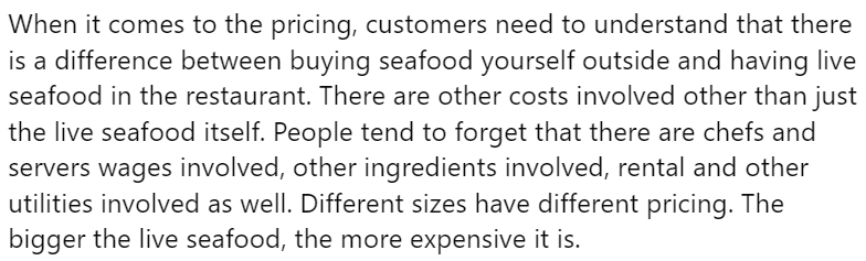 ![]() ![]() 你怎么看 最近,澳洲一位华人网友在网上发帖称,她在一家备受欢迎的中餐厅用餐,结账时才发现,其中一道菜居然要615澳元! 这个帖子也引发了一场关于价格透明度的大讨论。 ![]() 据Reanne Ho说,1月3日,她和一群人到珀斯的Canton Lane中餐厅用餐,点了一道龙虾面。 这道菜里用到的活龙虾是按重量收费,并不是固定价格。 ![]() Ho女士表示,工作人员在上菜前并没有明确告知她龙虾多重、价格是多少,直到收到账单时她才发现居然要615澳元! “我想借此提醒大家,因为我不希望其他人经历我这样的事,特别是在透明度和定价方面,”Ho女士告诉记者。“一道菜600澳元对我来说确实很不寻常,尤其是在事先没有明确告知价格和重量的情况下。” ![]() ![]() ![]() ![]() 然而,在网上分享了她的用餐体验后,中餐厅的工作人员发表声明,否认他们欺骗了Reanne,并为他们的定价辩护,但承认“我们有疏忽”。 顾客“未被告知”600澳元的价格标签 Ho女士称,对于海鲜这一类的菜肴,餐厅在烹饪之前先拿到餐桌前向顾客展示,这是“标准”操作,“尤其是涉及到龙虾或鱼等昂贵的原材料时。” 然而,在她用餐时,工作人员并未这么做。 ![]() 餐厅的菜单上只写着龙虾是“市场价”。 因此,当账单拿过来时,Ho女士被“惊到了”,还询问工作人员是否搞错了,“他们向我保证没有错。” 加上其他的菜品,Ho女士那一桌最后的总花费是944.30澳元。 ![]() 回家之后,她越想越觉得不对,于是第二天给餐厅打电话询问详细情况。 餐厅的工作人员在电话中向她解释说,这只大龙虾重4.5磅,约合2公斤,每磅售价120澳元,加上五份面条,这道菜的价格为615澳元。 ![]() 虽然价格没有问题,但Ho女士还是有一种被欺骗的感觉:“我们点餐时,服务员没有明确告诉我们龙虾的重量和价格,也没有提到这是一只‘大龙虾’。” ![]() 网络配图 她把这件事发在社交媒体上之后,引发了数百人的讨论。 有人站餐厅,认为:“称重和展示海鲜并不是标准做法。” 另一位网友说:“如果不确定就问,不要假设。” 但也有网友站Ho女士,认为“这价格真贵”。 ![]() ![]() ![]() ![]() 餐厅回应:有疏忽,但没有欺骗 后来,餐厅在自己的社交媒体页面上做出回应。 “是的,我们确实有疏忽,没有提前告知顾客价格和重量。但是,绝对不存在欺骗行为。” “龙虾是从活海鲜箱中拿出来的,称重之后进行烹饪并上菜。” ![]() 餐厅还晒出几段监控证据,证明龙虾在烹饪之前是活的、新鲜的。 ![]() ![]() 至于价格过高的问题,餐厅表示:“顾客需要明白,自己在外面买海鲜和在餐厅吃活海鲜是有区别的。除了活海鲜本身之外,餐厅还有其他成本,包括厨师、服务员的工资,其他原材料、租金水电费等等。而且,不同大小的海鲜有不同的电价,越大的活海鲜越贵。” ![]() 餐厅还补充说,每年年底的假期,龙虾的价格都会“涨得非常快”,尤其是今年还恢复了向中国的出口,价格更贵。 “我们经营这家餐厅已经有8年了,一直非常顺利。我们不需要以任何方式欺骗任何人来维持我们的生意。” ![]() 时隔4年龙虾首次出口中国,价格上涨 说到龙虾涨价这个事,就不得不提到上周,澳洲龙虾时隔4年首次恢复向中国的出口。 首批龙虾刚拿到出口许可,还没有运到中国,就已经被预定一空。 ![]() 此前的2024年12月20日,中国正式解除澳洲的龙虾“禁令”。 得知这一消息后,澳洲的龙虾出口商激动不已,许多人连夜备货、通宵作业,为即将到来的中国春节销售旺季做准备。 渔民们也非常开心,仿佛一下子找回了生活的动力,尤其是随后的几天,龙虾上岸价格不断攀升,让大家终于看到了希望。 ![]() 渔民Pirrottina说,虽然该行业愿意继续服务澳洲国内客户,但他非常乐意再次供应中国市场。 “中国给的价格太高了,就我个人而言,很难拒绝。” ![]() 渔民们是开心了,但对澳洲老百姓来说,这不是什么好事。 大家都感叹:好不容易得来的龙虾自由,又要没了…… ![]() 唉,且吃且珍惜吧。 来源:7 News部分图片来自网络 闲话澳洲 第一个将中国左舵绿牌车 开到澳洲并上牌的人 浙江嘉兴禾城的阿呆,一位环球自驾游的冒险者,他驾驶中国新能源车已经跨越40多个国家。如今,他来到了墨尔本,开启他环澳之旅的第一站。作为第一个将中国左舵绿牌车开到澳洲的人,阿呆将分享为何选择墨尔本作为他的出发点,探讨他对这座城市的独特印象以及他所安排的计划和面临的挑战。 -视频号- ![]() ![]() ![]() ![]() 公众号新功能 一键收听每一篇文章~ ![]() ![]() ☞维州政府重磅官宣:现在免费!![]() 墨尔本微生活 ![]() ![]() 点“在看” 你出国后的每一天 都有微生活的陪伴 ![]() |