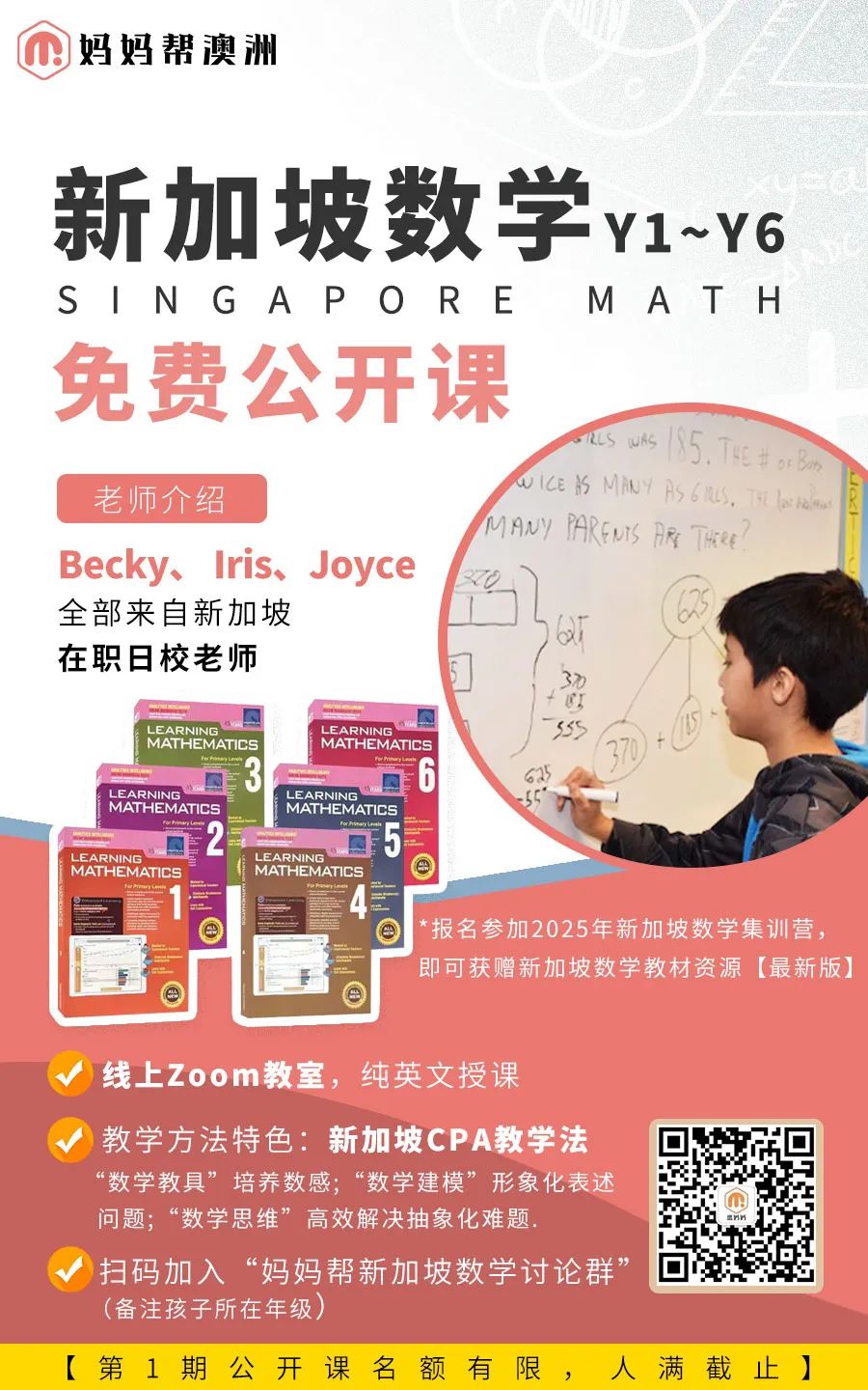 在数学启蒙阶段,帮助孩子建立良好的“数感”、数学,不只是解决各种复杂的运算,更要有举一反三的能力、应用能力、建模能力。 ![]() 类似于思维导图能把我们的思考过程展示出来,用建模方式可以帮助孩子把数学可视化、直观化,把抽象的数学关系转化成看得见摸得着,也很容易用来和别人讨论交流的东西, 可以说是连接数学具像与抽象之间的桥梁。 提示提升孩子计算,应用,逻辑思维,空间想象,分类统计,归纳等多种数学能力,建立系统性数学思维。 ![]() 新加坡数学的学习模式,一直都深受很多鸡娃家长的欢迎。此前,为了帮助妈妈们给娃提高成绩,妈妈帮也进行了多期“新加坡数学集训营”。2025年集训营将再次启航,敬请关注! 课程以新加坡数学各个年级内容为主线,锻炼孩子数学思维,结合澳洲考纲,穿插Naplan、袋鼠数学竞赛、奥数经典试题。 让娃在简单、中等、偏难的三种模式中,慢慢提升数学思维,培养学习数学的兴趣。 ![]() (往期zoom课程截图) 妈妈帮新加坡数学集训营线上教学的老师都来自新加坡日校,教学内容也都来自新加坡最经典的教材,以及顶级私校、精英公校的Past Paper,权威性毋容置疑。 比如, 下面为 Y6 Past Paper (上下滑动查看) ![]() ![]() ![]() ![]() ![]() ![]() ![]() Y3、Y4 Past Paper (上下滑动查看) ![]() ![]() ![]() ![]() ![]() ![]() ![]() 往期妈妈帮新加坡数学集训营获得了妈妈们的一致好评: ![]() 妈妈帮免费“新加坡数学公开课”即将开讲! 席位有限,先到先得,感兴趣的妈妈赶紧扫码抢占席位, ![]() ![]() ![]() ![]() 在公开课之后,妈妈帮还将推出2025年最新一期的新加坡数学集训营,感兴趣的妈妈可以扫描上方二维码之后回复“集训营”了解详情! 报名参加2025年新加坡数学集训营的妈妈,即可获赠最新版“新加坡数学教材网络资源”。 ![]() 新加坡数学教材+在职日校老师线上教学,相当于把新加坡课堂搬回家,让娃体验原汁原味的CPA数学教学!心动的妈妈扫描下方二维码速速报名 ![]() ![]() ![]() ![]() - END- 如果想了解1. 悉尼中学、小学的最新排名情况, 2. Naplan历年真题,OC攻略, 3. 27页悉尼奖学金考试攻略等信息, 请扫码后台回复“排名”来查看 ![]() ![]() |