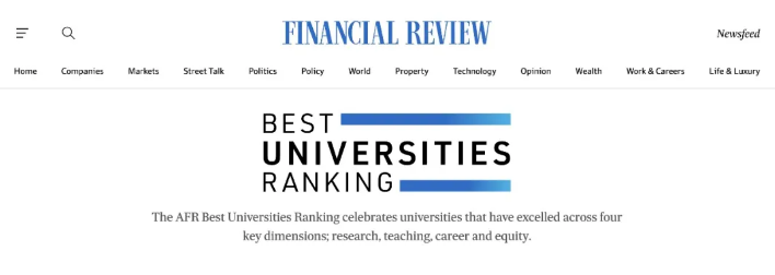 ![]() 前不久,《澳洲金融评论报》(Australian Financial Review,简称AFR)公布了《2024澳洲最佳高校排名》,这是澳大利亚唯一的本土大学排行榜。 ![]() *图源AFR官网 排名指标 本次排名采取了4个指标进行综合评判