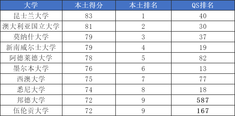 排名亮点 这份排名与QS排名可以说是大相径庭,不同的地方在于本地认可度。 ![]() 昆士兰大学蝉联第一,校方也在官网发出了庆祝文章。 ![]() *图源昆士兰大学官网 澳洲国立大学位列第二,比去年上升一位,其中“职业成果”评选指标上表现突出,全澳排名第三,深受雇主认可。 蒙纳士大学和新南威尔士大学并列第三位。蒙纳士大学比去年进步一名。新南威尔士大学比去年下降一名,但“职业成果”评选指标全澳第一。 阿德莱德大学位列第五名,与以往持平。 墨尔本大学位列第六名,“科研”评选指标位列澳洲第一,但是由于“教学”指标分数低,拉低了整体排名分数。 下面给大家总结出了一些值得冲的澳洲学校,快来一起看看吧! 昆士兰大学 昆士兰大学,简称“昆大”、“UQ”,位于澳大利亚昆士兰州首府布里斯班。该校是一所位于澳大利亚昆士兰州的公立综合性大学。 ![]() 同时还是六所砂岩学府之一,环太平洋大学联盟、澳大利亚八校联盟、UNIVERSITAS 21、国际铁路联盟及新工科教育国际联盟、法学院全球联盟等组织成员。 雅思要求