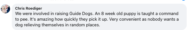“我们参与了导盲犬的培养。一只8周大的小狗就会被教导一个排尿的指令。很震惊,它们学得很快,非常方便,因为没有人希望狗狗随便在乱七八糟的地方解决。”