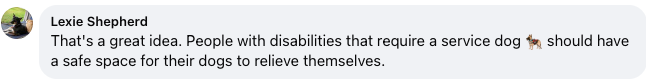 “这个主意很棒。需要服务犬的残障人士应该有一个安全的地方让他们的狗狗解决生理需求。”