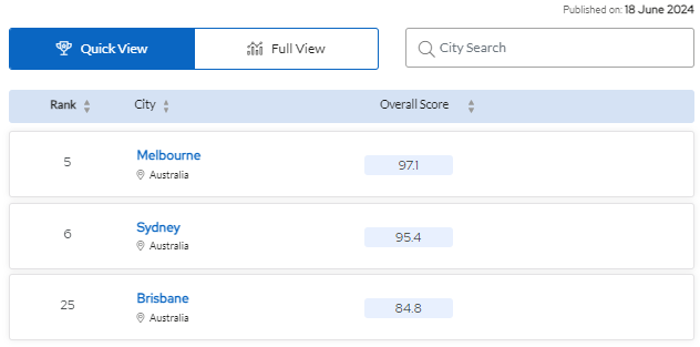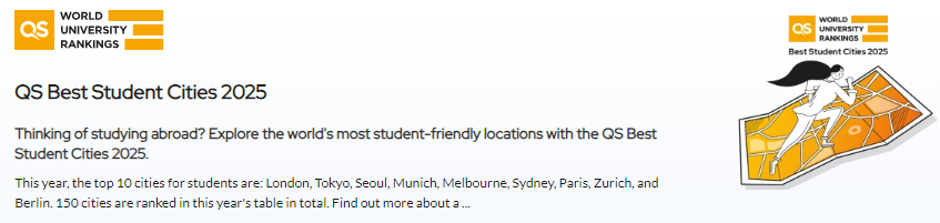 ![]() 同学们在定校时,学校所处的地理位置以及所在城市都是很重要的影响因素。 澳大利亚一直是留学热门国家,随着2025年QS世界大学排名公布后,QS2025全球最佳留学城市排名也随之出炉了。 ![]() 图片来源:QS官网截图 今年,全球共有150座城市上榜。澳大利亚有7座城市表现突出,位列世界Top100,其中6座城市排名前五十。 墨尔本与悉尼更是双双进入榜单前十名! ![]() 图片来源网络 让我们一起看看排名情况吧! 排名总体情况 本次排名对比了来自150个主要留学目的地。 本次排名从大学排名、合意性/宜居性、负担能力、雇主活动、学生构成、学生观点6个方面进行综合比较。