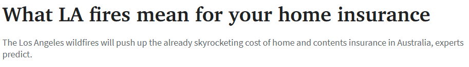 ![]() ![]() ![]() ![]() ![]() ![]() ![]() ![]() ![]() ![]() ![]() ![]() ![]() ![]() ![]() ![]() ↑↑已有50000+墨尔本家庭点击关注我们↑↑ 美国洛杉矶灾难性的大火还在继续, 而目前专家们认为澳洲的房屋保险将随势大涨 ![]() 专家们称,由于房屋保险行业的全球性,洛杉矶大火将进一步推高澳洲的房屋成本、和财产保险成本。 根据澳大利亚竞争和消费者委员会(ACCC)的最新报告,2023 年,