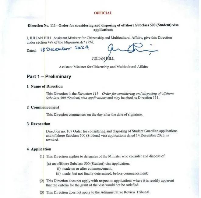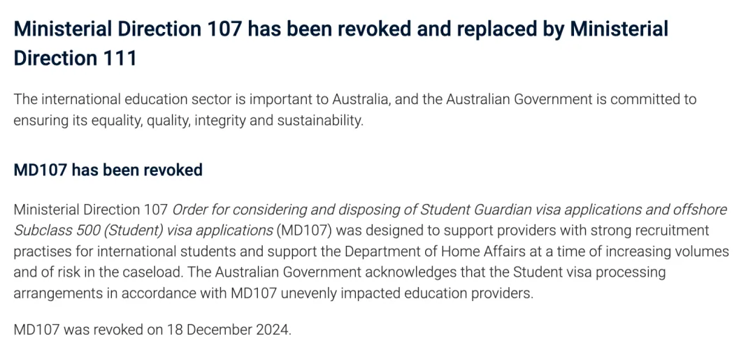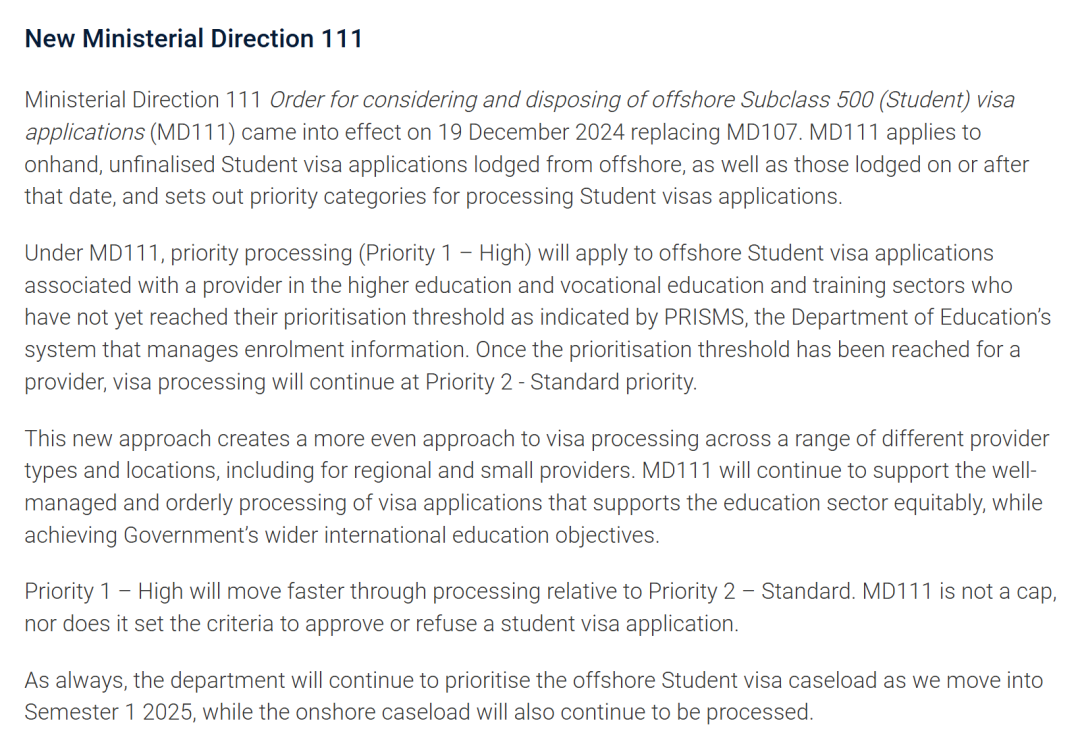 ![]() 关注↑↑↑我们获得更多申请资讯! 1 🎉留学小伙伴们注意啦!澳洲移民局部长令111号(Ministerial Direction No.111)闪亮登场,正式接替了107号的岗位,于12月19日优雅生效,专为境外500学生签证和590学生监护人签证的申请者们量身定制! ![]() 图源:网络 这个新指令一来,咱们的签证申请流程可就得改改啦!别急,跟着华小夏一起,咱们一探究竟! ![]() ![]() 新指令会带来哪些大不同呢? ![]() 想当年,部长令107号可是对低风险国家和高分澳洲院校的申请者们特别关照,比如澳洲八大的中国留学生,那可是VIP待遇,嗖嗖地就拿到签证了。 但这也惹毛了一些评分较低的院校,觉得移民局这是在搞“区别对待”。 于是呢,移民局就琢磨出了新招,结合2025年的CAP配额,不再看院校等级,而是看每个学校的净海外学生人数有没有达到配额的80%。这样一来,高等教育和VET院校的学生们都得按这个新规矩来。 🌟高优先级(High Priority): 如果你的学校还没达到那个80%的阈值,恭喜你,你的签证申请就是VIP啦!审理速度快得飞起,签证到手so easy! 而且啊,还有10类留学生也是VIP待遇,比如中小学生、研究型硕士及博士生、短期交换生、独立ELICOS的语言课学生……等等,简直就是留学生中的VIP中的VIP! ![]() 图源:网络 📚标准优先级(Standard Priority): 如果学校已经达到了那个阈值,或者你不是上面那些VIP之一,那就得按标准流程来啦。不过别担心,虽然审理速度慢点,但签证还是有机会的! ![]() 图源:网络 📊简单来说,就是招生人数还没满80%的大学,才会给申请者开绿灯。满了的话,那就得慢慢来啦。 可以看出,虽然那个2025年1月1日的留学生招收配额限制政策暂时不实施了,但这个新指令也是异曲同工,通过签证处理优先级来实现类似的效果。 🚨特别提醒:在澳洲境内的签证申请处理速度也会变慢哦,可能得先拿个过桥签证过渡一下。 ![]() 给中国留子的建议 ![]() 📅对于签证申请,华小夏给大家点建议哈: 1类学生,提前2个月申请就差不多;2类学生呢,最好提前3到4个月。早点申请,早点安心嘛! ![]() 图源:网络 对于中国留学生来说,新指令下得这么几点注意: