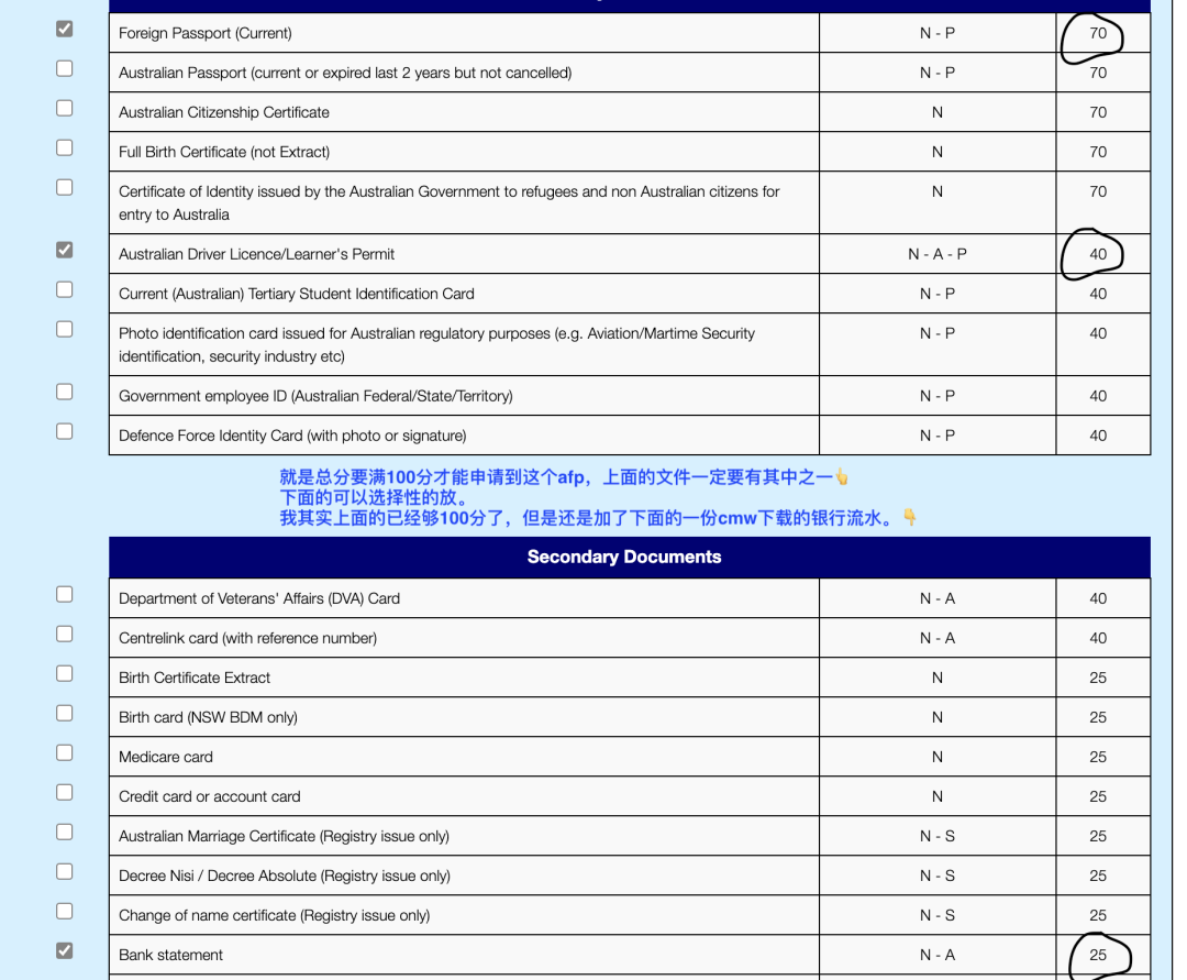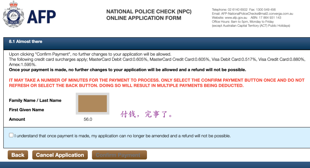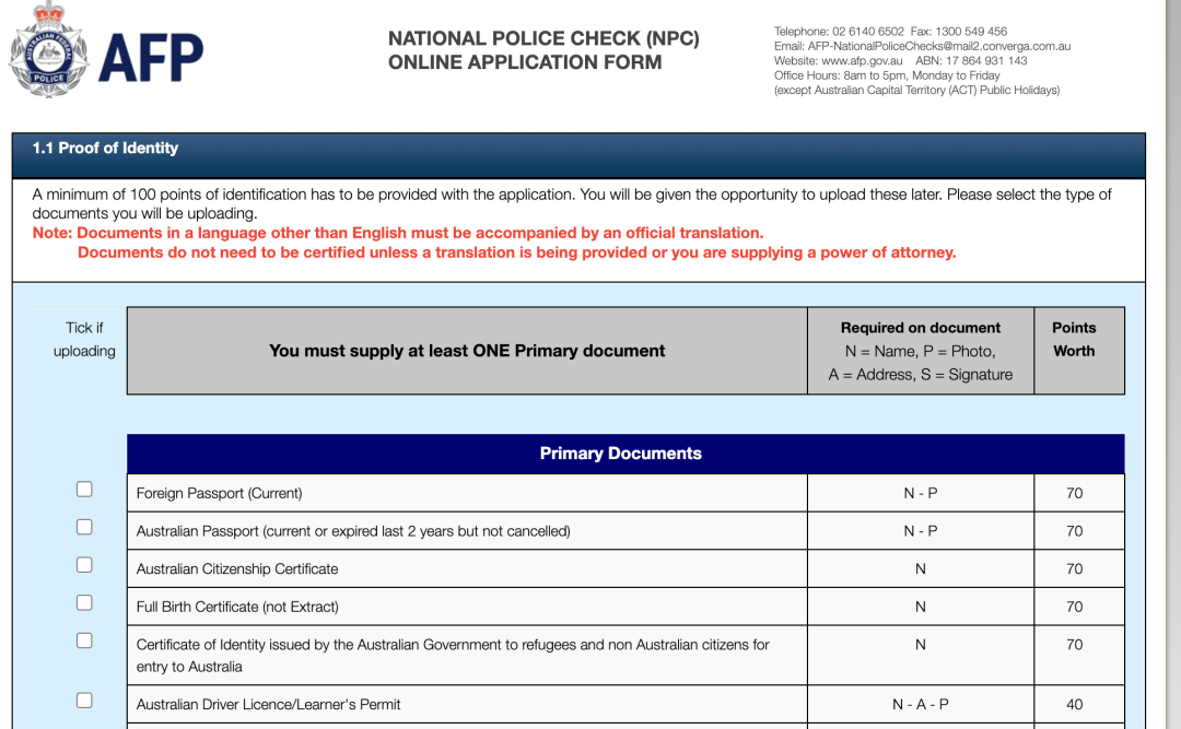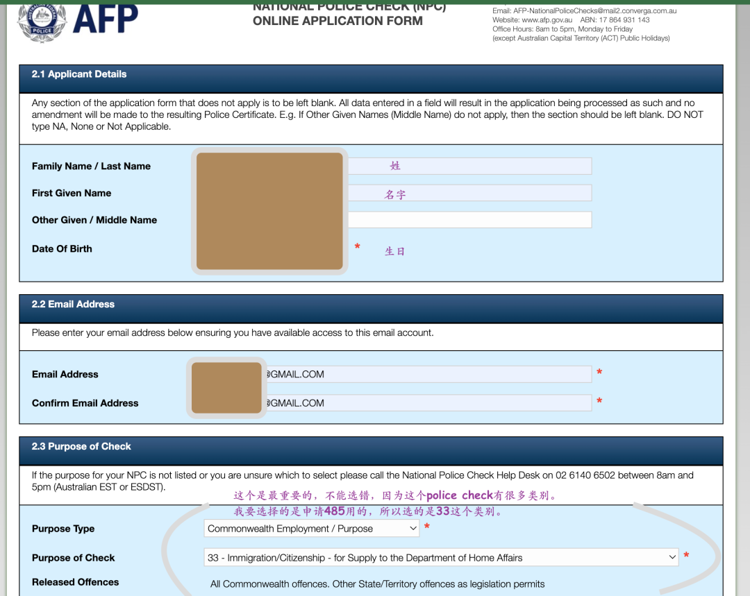 这又是另一个干货贴,如何申请澳洲的无犯罪证明。![]() NATIONAL POLICE CHECK (NPC) ONLINE APPLICATION FORM的申请就是在这个网站,无犯罪证明也就是很多人说的良民证,在申请一些签证或者某些工作的时候就会需要到,嗯这个证明我得说是体现澳洲最效率的证件了。(别问我为啥,申请过国内这种类型的证件跑上跑下需要各种找关系的事情我早都烦透了,明明就是输入一个证件号就知道是否有过犯罪记录的事情,可大多数还是要求人跑来跑去折腾,不知道现在如何,反正我是很害怕的。哎明明电子支付能这么先进,这有什么好不能upgrade的吗,😑烦。) ![]() 网站在这:https://afpnationalpolicechecks.converga.com.au/pointCheckForm主要需要的东西很多可以选择的,凑够100分就行了。有护照/澳洲驾照/出生证明/学生证明/银行流水,等等的可以选择,你们看着有什么用什么吧。 ![]() 我自己是用了:护照+澳洲驾照+银行流水这里面最麻烦的是回忆这十年你都搁哪呆着呢。我真的就是写了个大概,然后不在澳洲的日子都写在我家了。 ![]() 时间线:1月2日申请(当时就下了个reference no,如果急着用可以先记下这个用)1月3日,下了电子版发到邮箱,和这个纸的一样的内容。1月10日,信箱拿到这个。下面是截图说明申请主要的步骤:(交钱 56aud) ![]() ![]() ![]() ![]() ![]() 今日干货完毕,写这个主要是为了我自己以后如果还要申请的话,就按照这个步骤来。毕竟这个才1年有效期。🙏拜拜了您。 |