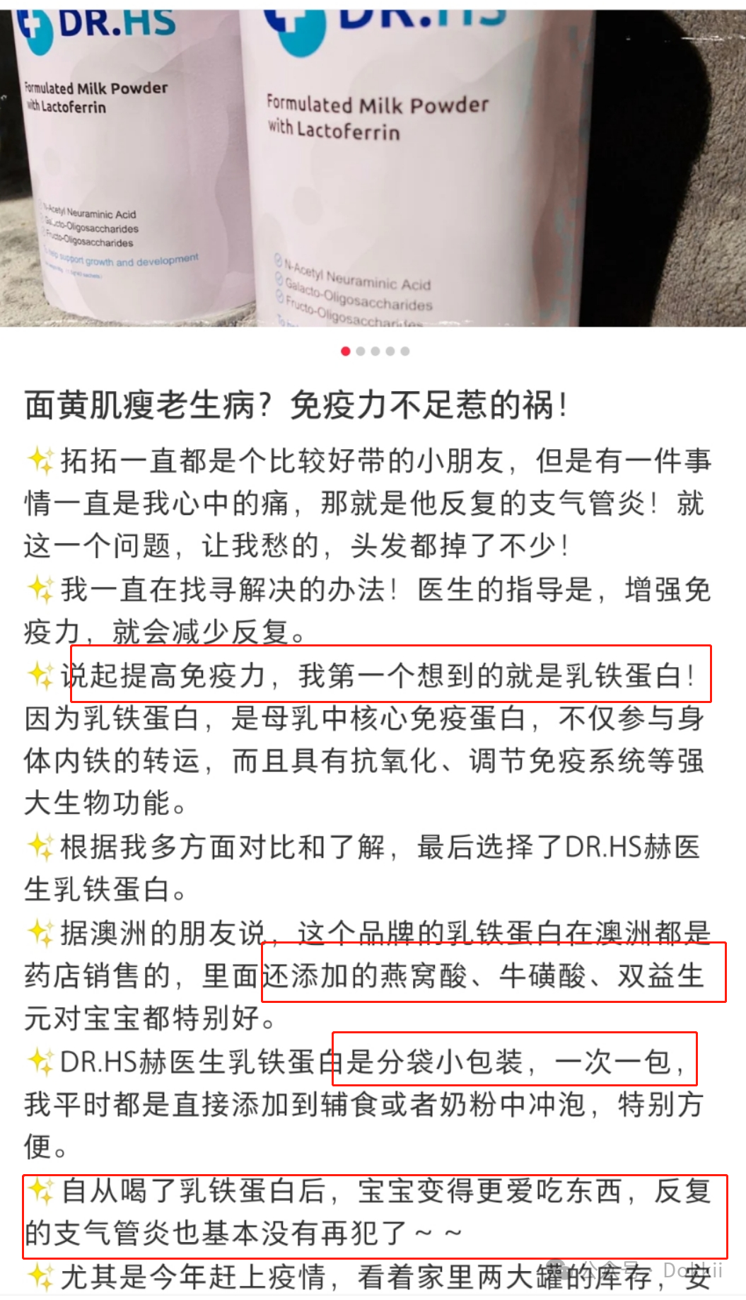 【澳洲DR.HS赫医生乳铁蛋白精装版】 平台团购:269/三罐 (直接图一扫码下单即可) ![]() 现货秒发❗炸天福利❗一条才1+元❗给孩子囤❗今年最大力度❗独家福利 6罐送40条到手💰529❗ 🉐280条+2个熊猫盲盒 正品授权❗️【澳洲DR.HS赫医生乳铁蛋白精装版】 老客反馈生病明显少了😋 提高免疫力,还是乳铁蛋白管用 保质期到27年!下一批没有这个价格 ☑️澳洲最大牌乳铁蛋白,每14公斤牛奶仅提取1克乳铁蛋白 ☑️硬成分‼️ 特别添加珍稀燕窝酸 #福建仓 快递 团管理订单管理商品核销 33天前 发布 跟团中360天18小时19分32秒后结束 ![]() ![]() ![]() ![]() ![]() ![]() 乳铁清关终于到货了, 最新鲜的日期,到2027年,快入~ 品牌直发,正品授权❗️ 我家孩子一直都在喝乳铁蛋白, 所以她很少生病。 而且,乳铁蛋白我一直都有在开团, 这次我跟品牌方争取了很久, 才有这么优惠的价格! 一定要多囤点,全家都能喝! 1罐送体验装4条 3罐送尝鲜装20条+盲盒1个 6罐送尝鲜装20条*2+盲盒2个 (盲盒款式随机发~} ![]() ![]() ![]() ![]() ![]() ![]() ![]() ![]() ![]() ![]() ![]() ![]() ![]() ‼️ 以上为实拍 ,请 勿 盗 图‼️ 盗 图 必 究️‼️澳洲DR.HS乳铁蛋白精装版 +特贝优A2全脂乳粉最强优惠来袭 补蛋白质补钙,提高免疫力 搭配起来喝更方便 ![]() ![]() ![]() 大家一定要坚持喝, 期待大家的身体越来越好! ![]() ![]() ![]() ![]() ![]() 据了解, 乳铁蛋白是乳汁中一种非血红素铁结合糖蛋白, 对婴幼儿的生长发育有着无可替代的作用。 补充乳铁蛋白能够为婴幼儿筑起第一道健康防线, 所以乳铁蛋白是每一位宝妈的必选品! 之前买过的老客,都懂得它的好! ![]() ![]() ![]() ![]() ![]() ![]() ![]() ![]() ![]() ![]() ![]() ![]() ![]() ![]() ![]() ![]() ![]() ![]() ![]() 市面上乳铁蛋白的产品众多, 澳洲家庭医生联合推荐的DR.HS澳洲赫医生, 药房同步销售! 百万级网红张医生都在推荐~ ![]() ![]() ![]() ![]() 最近大家各种生病 现在提高免疫力和抵抗力是真的很有必要。 我就找品牌方要来了最大优惠! 旗舰店一罐159, 数量有限,还不快来~ ![]() ![]() ![]() ‼️ 以上为实拍 ,请 勿 盗 图‼️ 盗 图 必 究️‼️甄选了新西兰黄金纯净奶源。 14kg牛奶中才能提取出1g乳铁蛋白, 乳铁蛋白原料纯度高达95% (经第三方机构独立测试权威认证) 每100g乳粉含100mg乳铁蛋白 最精华的营养才能让宝宝补到实处! ![]() ![]() ![]() ![]() 在配方上添加了珍稀的燕窝酸, 激发孩子更强脑力, 促进记忆和智力的发育, 还能助力乳铁蛋白的吸收, 增强宝宝的免疫力。 ![]() ![]() ![]() 还添加了天然GOS+FOS双益生元组合, 通过调节宝宝肠道中菌群生态平衡, 封闭肠道粘膜细胞间隙, 起到对抗致病菌的作用。 还能促进铁和维生素D的吸收,强健骨骼 ![]() ![]() 不含防腐剂、香料及蔗糖 (宝宝吃的安全品质很重要!) ![]() ![]() ![]() 包装也是一小包一小包的,超级方便! 一罐有40袋, 吃上一个月左右也是完全没问题的~ ![]() ![]() ![]() ‼️ 以上为实拍 ,请 勿 盗 图‼️ 盗 图 必 究️‼️直接冲泡就可以啦~ 粉质细腻,容易冲泡 宝宝也可以放进辅食、奶里! 宝宝6个月以上就能吃, 喝起来是一股淡淡的奶味~ ![]() ![]() ![]() ![]() 拥有长达32年的母乳研究历史, 并成功通过了新西兰GMP与新西兰RMP认证, 是一款专业可靠、营养均衡的 高性价比乳铁蛋白产品。 ![]() ![]() ![]() 6个月至1岁的宝宝,建议1天1包; 1岁以上的儿童、成人、孕妇、老人,建议1天2包~ 全家都能吃,必须多囤点! ![]() ![]() ![]() ![]() ![]() 【产品名称】:澳洲DR.HS赫医生乳铁蛋白精装版 【产品版本】:一般贸易 【产品规格】:澳洲DR.HS乳铁蛋白精装版:(1.5g*40包)/罐 【使用人群】:澳洲DR.HS乳铁蛋白精装版:6个月以上,1岁以下的婴儿,建议服用量为1包1天,1岁以上儿童及孕妇、成人1-2包1天 【有效日期】:2027年 【发货地区】:福建 【发货时间】:3-7天 【发货快递】:韵达 【运费标准】:包邮;甘肃、内蒙、青海、宁夏+18元,西藏、新疆+22元,港澳台地区不发 【售后说明】 1、保健品开封后不接受无理由退换货; 2、本产品为膳食补充剂(营养素补充剂)不能代替药物; 3、由于保健品类更新换代较快,会出现包装版本、批次不同,不属于产品质量问题; 4、产品已经发出的情况下,不可更改地址,拒绝任何形式的拒签,收到产品后当场验货; 5、如出现异常情况,请带面单+产品拍照并与我们联系,我们会第一时间处理,如产品有质量问题可在收货24小时之内,联系客服进行赔付换货或者补发 ; 6、留错地址、电话等信息导致货物不能正常送达均不在售后范围内; 7、发货和上传运单有24-48小时时差,没有运单/单号无物流可以稍等,如时间较长可联系售后查询!注意!!新旧两种版本随机发哦!!!! ![]() ![]() ![]() 赠品库存有限!先到先得! 盲盒真的敲可爱 如有侵权,请联系删除!!! |