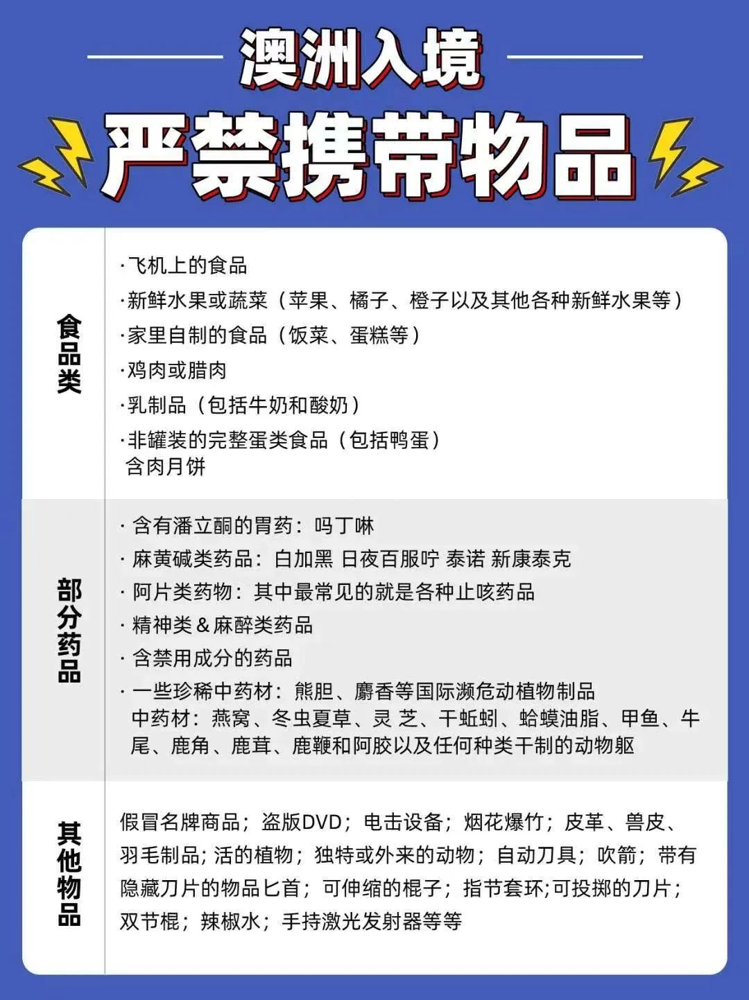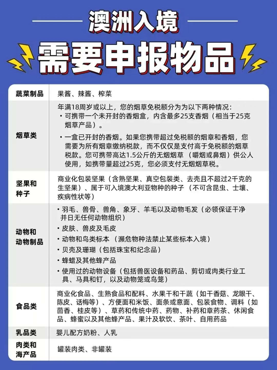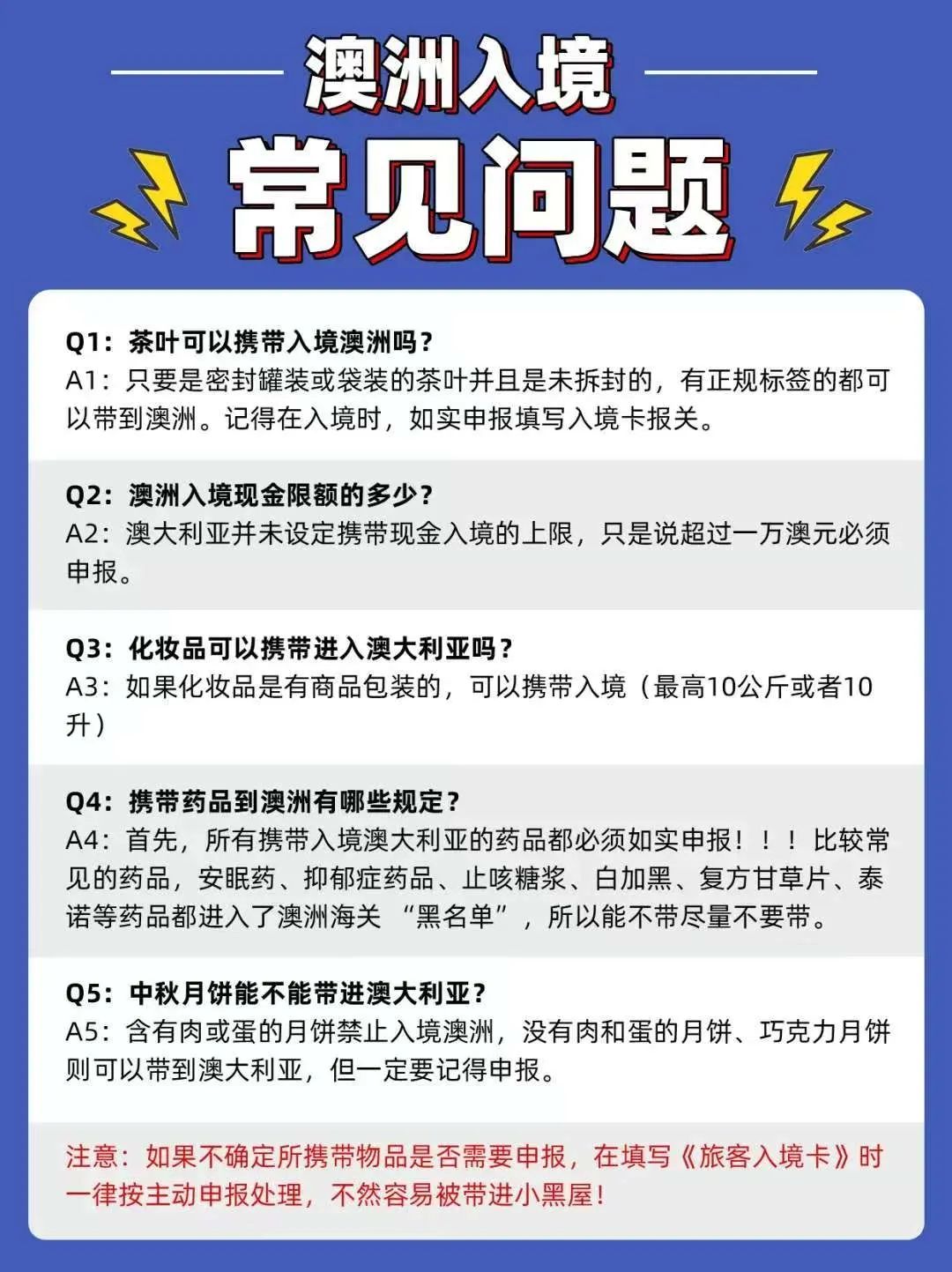![]() ![]() 点击公众号获得更多信息! 春节将至,假期时间到!正是出游的好时节。相信不少朋友已整装待发,准备开启自己的假期愉快之旅了!而澳洲作为全球知名旅游大国,此时正值春暖花开,每年亦会吸引不少游客前来开启一场跨越季节的梦幻旅行!那么,在这片充满自然美景与独特文化的土地上,如何确保旅途既愉快又顺利呢? 众所周知,澳洲海关的严苛是全世界都出了名的,什么能带,什么不能带,哪些必须申报,都有着非常明确的规定。根据澳洲最新规定,如果游客(包括国际学生、打工度假者、海事船员和临时工作人员)隐藏本应该需要进口许可证的物品,或将面临取消签证的风险。除此之外,如果访客提供虚假信息或拒绝回应生物安全官员,签证也可能被取消。而签证一旦取消,3年内不得再申请澳洲的签证!情节严重的很有可能再也无法来澳洲了! 而且,近年来澳洲《生物安全法》进行了修订,针对未经许可携带或进口“有条件非禁止物品”的人,制定了新的民事处罚条款。其中有违法嫌疑的可能会面临四小时的拘留。忽视这些规定或情节严重者,还可能会面临高达375,600澳元的罚款! 不要不拿这些规则当一回事,接下来我将为大家展示一个真实的例子: 在2024年7月的时候,这时候正是澳洲的旅游旺季,墨尔本自然也迎来了大量游客。S女士也选择了此时来墨尔本出游。S女士跟随其他游客队伍来到例行检查的等候区,准备通过海关安检。没想到,此时澳洲边境工作人员在检查完其他物品后,要求对S女士进行深入检查。随即,海关官员在她未申报的行李箱里,居然发现了数十捆现金,全部藏在普通衣物之中。 ![]() 经过盘点,海关发现她竟然携带了近15万澳元、超过8万美元,以及近7000港币,合计约27万澳元(约17.6万美元)的现金。 ![]() 海关怀疑这些资金可能与其他犯罪活动有关。因此当地海关对S女士处以高额罚款,并当场取消了她的签证,最终将她遣返回中国。 这时候很多朋友就要问了,去旅游带多点现金以防万一不是很正常吗,澳洲的海关需要这么斤斤计较吗?但是我可以跟大家说明,这是正常的。因为澳洲海关曾规定过如携带1万元(含)以上的澳元及等值外币,必须申报。如携带本票、旅行支票、个人支票、汇票,还须应要求填写可转让证券表(BNI),如实申报。但S女士明显就是没有理会过这个规定,所以才导致了最终的惨淡结局! 澳洲海关入境注意事项 为了让大家充分享受自身的澳洲假期之旅,接下来我将会给大家说明一下澳洲海关的注意事项,祝大家能顺利入境,拥有一个愉快的旅程! ![]() 在飞机上您会收到一张入境旅客卡,这是一份法定文件,如果您携有任何食物或植物或动物来源的货物-包括本小册子所列的任何物品,您必须在"是"(YES)栏打钩。如果您携有不想申报的检疫物品,在您前往领取行李的途中及将申报卡交给海关人员前,把物品丢弃于特别检疫标志箱内。 您抵达澳洲时,在行李输送带可能会遇到检疫猎犬。不用惊慌,它们只是在嗅乘客的行李,寻找检疫关注的物品。如果您看见一只狗在您附近工作,请把您的行李袋放在地上准备接受检查。 有时侦察犬会察觉特别的味道,尤其是您在袋内一或两天前放过肉类或水果。检疫工作人员大概会要求检查您的袋子以确保袋内没有属检疫关注的物品,但如果您解释情况,您不会有任何问题。 带入澳洲的东西 有些东西,由于对澳洲的动物及植物的生存有疾病威胁,所以是不准带入澳洲,这些包括有:· 乳类、蛋及含蛋的产品:包括全个,乾的及粉末的蛋及一些有蛋的成份的产品(随同婴儿的婴儿配方,及纽西兰的乳类产品是准许的)。 活的动物:包括雀、鸟、鱼、爬行动物及昆虫。 肉类及肉类产品:包括所有非罐装或新鲜、乾、冷藏、烟熏或鹹肉。 种子及果仁:包括生、没烤过的果仁、生花生、栗子及爆壳。 新鲜水果及蔬菜:包括所有新鲜和冷藏的水果及蔬菜。 活的植物:包括插枝、根、球茎、谷物、根茎及茎部。 含有或种子制成的手工艺品及纪念品 鲑及鳟鱼产品:询问有关特别的入口情况(罐头的鲑鱼是准许的)。 生物材料:包括人类/动物疫苗及治疗货物(询问有关特别的入口情况)。 鹿角/鹿茸,食用燕窝包装产品:来自纽西兰的鹿茸或鹿角是准许的(附证明书)。 泥土及沙:包括填满泥土或沙的物品(不带泥土和沙的石块是准许的)。 所有猪肉产品。 下列物品在检疫条件许可并事先获得澳洲检疫当局的证明情况下可以另行带入,但许可证必须在你进行海外旅行之前取得;这些物品有: 猫、狗及其他小动物 培养液、微生物、动物精子及卵子 活的植物,插枝及球茎 动物或植物制作的陈列纪念品及珍品 婴儿食物(每名婴儿准带一公斤) 小量圣水 检疫官员会检查这些物品,如果不会带有动植物疾病或害虫的话,再把这些物品还给您。汽车也可以带进来,但在下货后须经严格检查及清洗。 另外还有些物品可带入境但必须申报,相关资讯可向本中心或澳大利亚签证服务处索取,或是到澳洲官方网站www.aqis.gov.au查询。 为什么连机舱也要消毒? 您如果乘机抵澳大利亚,您会发现在下机之前,飞机舱内也要消毒,这种消毒是用以控制飞行昆虫,此类昆虫可能在海外港口进入机内,而可能把外来疾病及害虫带进澳大利亚。这种消毒得到国际卫生组织批准使用,飞机货舱也要消毒 海关限制及规定 入境前,请认真阅读入境卡(IPC)内容并如实填报。在不能