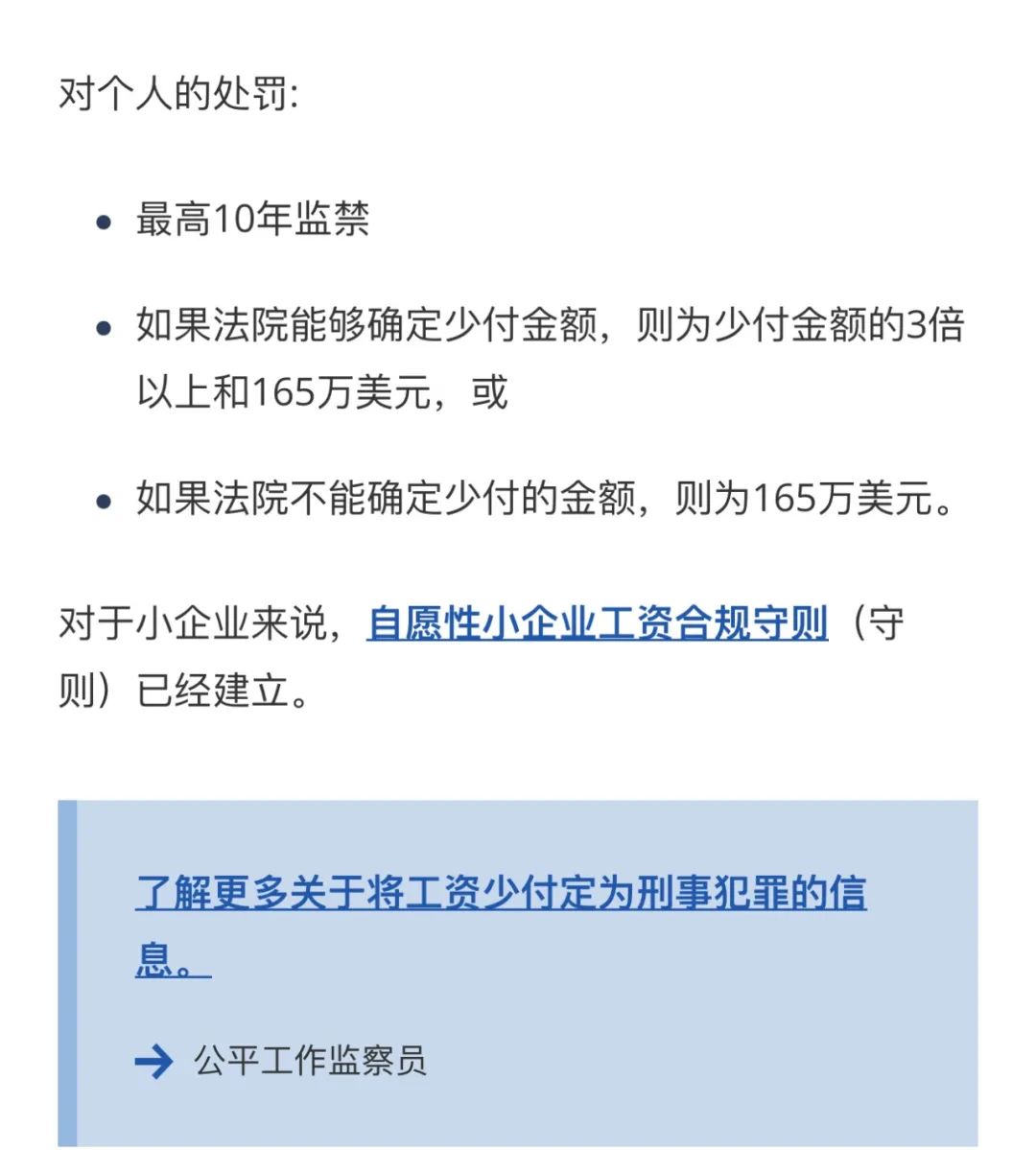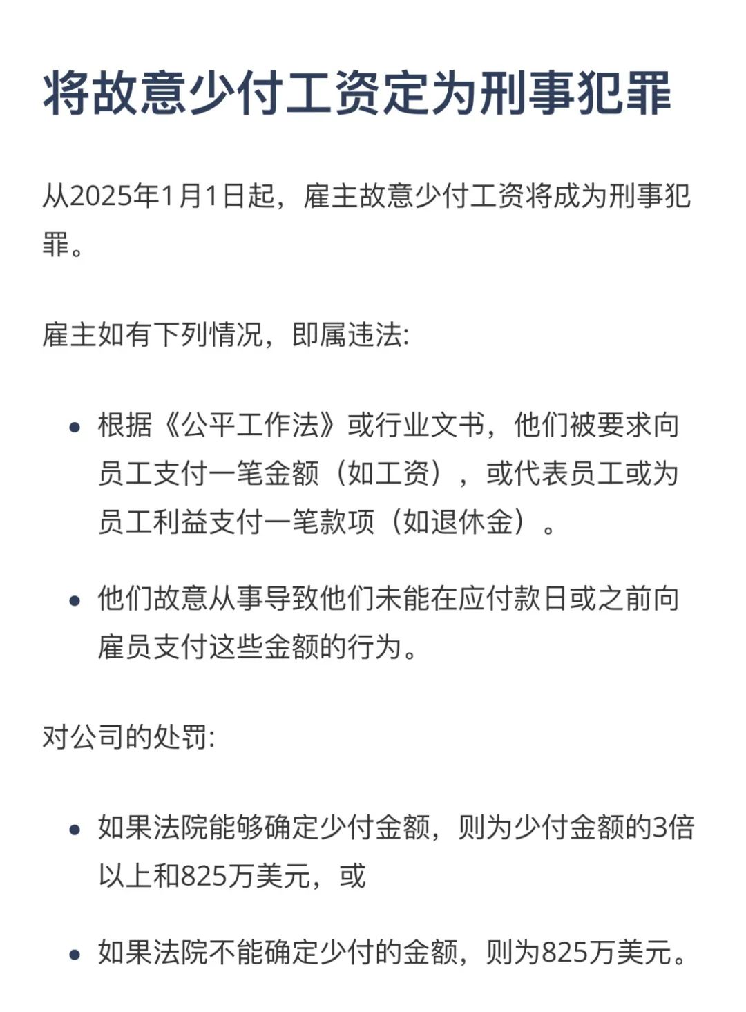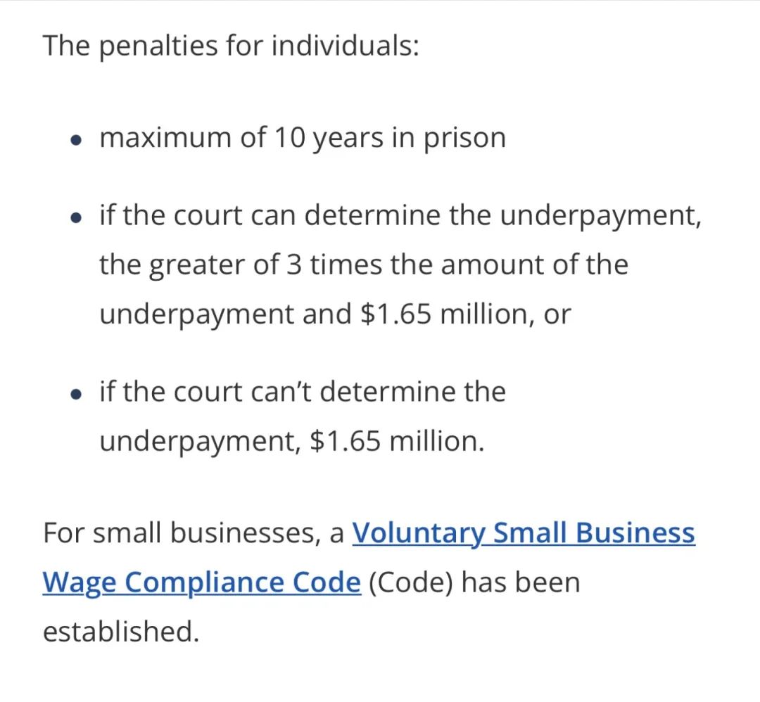 ![]() ![]() 点击蓝字 关注我们 ![]() ![]() 2025年起澳洲雇主故意 少付工资 将成为刑事犯罪 《公平工作法》 2025年1月1日起,澳大利亚《公平工作法》正式实施,雇主故意少付工资或福利可能构成刑事犯罪!但这不包括无心之过(honest mistakes)。 ![]() 根据《公平工作法》,雇主必须向雇员支付一定金额(如工资),或代表雇员或为雇员的利益支付一定金额(如养老金),或支付工业用具。 如果有以下情况,雇主即属违法:他们故意做出某些行为,导致未能在应付款日或之前向员工支付这些款项。 违法处罚 01 对公司的处罚: 如果法院能够确定少付款项,则取少付款项的3倍和825万澳币中的较大者,或者如果法庭不能确定少付的金额,罚款825万澳币; 02 对个人的处罚: 最高可判处10年监禁; 如果法院能够确定少付款项,则取少付款项的3倍和165万澳币中的较大者,或者如果法庭不能确定少付的金额,则罚款165万澳币; 03 Fair Work可以调查涉嫌刑事少付的犯罪行为,并将适当的事项移交刑事起诉。如果被判有刑事罪,法院可以处以罚款、监禁或两者兼施。 企业有适当的保护措施以避免刑事起诉,这包括the Voluntary Small Business Wage Compliance Code和Cooperation agreement。 ![]() ![]() ![]() ![]() 这项新法律的出台,旨在加强对员工权益的保护,打击不法企业主的恶意欠薪行为。可以说澳洲政府在维护员工权益、规范企业用工行为,营造一个公平公正的劳动市场环境上一直在努力。 免责申明 本文由小编综合整理,内容及图片版权均归原作者所有。若未能找到文章或图片出处,请谅解。 如有侵权行为,请与本账号联系,我们会在第一时间申明原文作者或者将侵权文章或图片删除,谢谢! ![]() ![]() 创世集团2014年中国区总部成立,选址在辽宁省大连市星海湾,澳洲总部位于澳大利亚墨尔本最大的华人区BOXHILL,并计划在未来五年向全国多个一线、二线城市辐射,打造集团中华区服务生态圈,致力于为更多国内客人柔性定制独一无二的留学移民及海外资产配置计划。 我们将为您提供一对一量身定制的服务,海外留学、 移民、地产开发、终端销售、渠道销售、资产配置、 租赁管家以及生意买卖等方面给予您一条龙服务体验,多层次全方位辅助您在澳洲的每一步发展。 ![]() |
