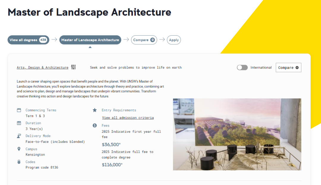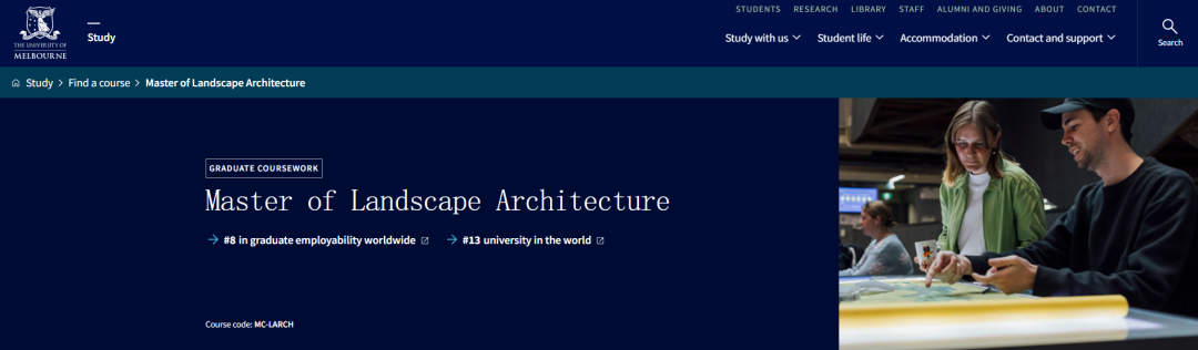景观建筑 Master of Landscape Architecture ![]() https://study.unimelb.edu.au/find/courses/graduate/master-of-landscape-architecture/ 在该项目学习中,学生可以使用最新材料和技术设计无害生态的现代景观的技能、深入了解国际当代实践,在跨学科项目团队中有效工作的管理和沟通技能,直接应用于专业实践,丰富景观建筑历史和理论知识。 · 申请截止时间:2025年3月31日 · 语言成绩:托福79,雅思6.5 · 学费:AUD$142,251 Indicative total course fee · 申请费:100 · 申请材料: