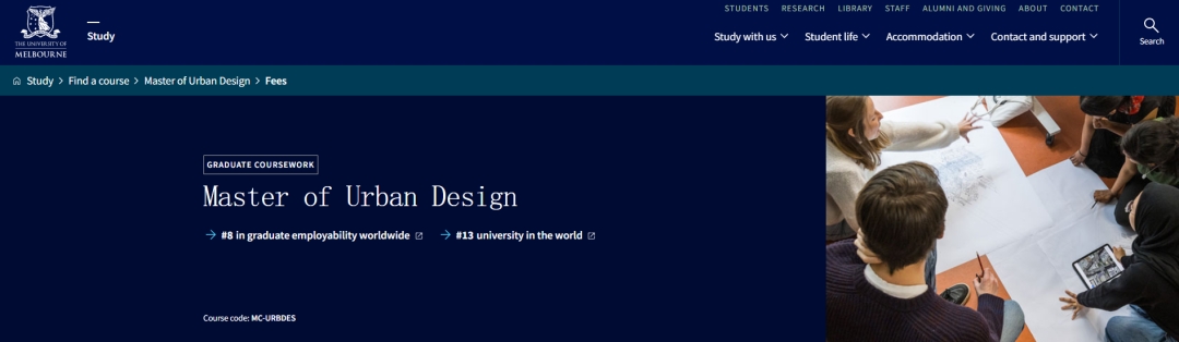 城市设计 Master of Urban Design ![]() https://study.unimelb.edu.au/find/courses/graduate/master-of-urban-design/fees/ 该项目着眼于建筑群、街景、景观和市政服务的提供,旨在创造和谐、有凝聚力的空间。学生需要能够理解城市的空间和时间要素,并能针对大规模城市化和不断变化的气候需求等当代挑战进行设计。 · 入学要求:城设,景观或建筑专业 · 申请截止时间:2025年3月31日 · 语言成绩:托福79,雅思6.5 · 学费:AUD$83,049 Indicative total course fee(2024年) · 申请费:100 · 申请材料: