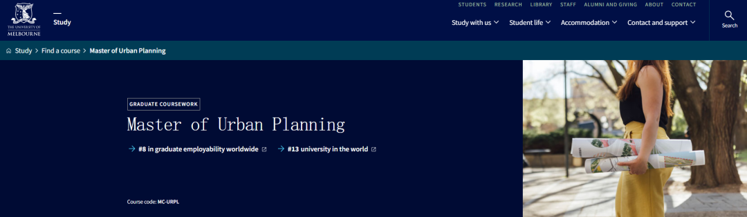 城市规划 Master of Urban Planning ![]() https://study.unimelb.edu.au/find/courses/graduate/master-of-urban-planning/ 该项目重点研究澳大利亚和国际与人类住区相关的政策和规划,以及我们如何应对具有挑战性的人口和环境问题。 · 申请截止时间:2025年3月31日 · 语言成绩:托福79,雅思6.5 · 学费:AUD$90,250 Indicative total course fee · 申请费:100 · 申请材料: