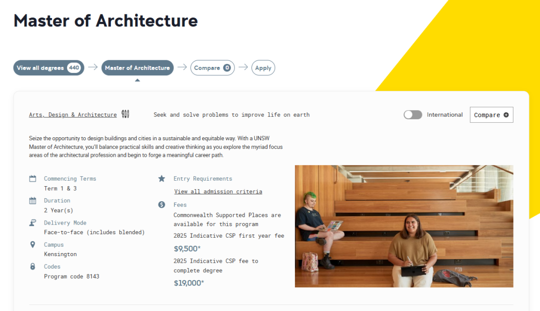 | 新南威尔士大学 新南威尔士算得上是八大校中的“潜力股”了,他一直在持续进步中,而且QS排名也在kuku向前冲,终于在2025年闯进了全球第19位!UNSW的建筑设计和室内设计也是艺术领域的“王牌专业”,而且现在还注入了计算机与数字技术方面的内容,可以说在未来求职和研究中,有了更多机会。 UNSW目前已经停止了2025年的全部申请!! ![]() LCT,录取新南威尔士大学景观建筑 点击图片查看经验分享 建筑设计 Master of Architecture ![]() https://www.unsw.edu.au/study/postgraduate/master-of-architecture 通过学习,学生将掌握建筑实践方面的专业知识,以及可持续发展、土著社区设计和创新设计思维方面的高级技能和技巧,并在职业生涯中加以运用。 · 入学要求:建筑学本科学位(或同等学历);若不符合入学要求,也可以通过工作经验和建筑本科学习来证明 · 语言成绩:托福90,雅思6.5 · 学费:$98,500* Indicative CSP fee to complete degree · 申请费:125 · 申请材料: