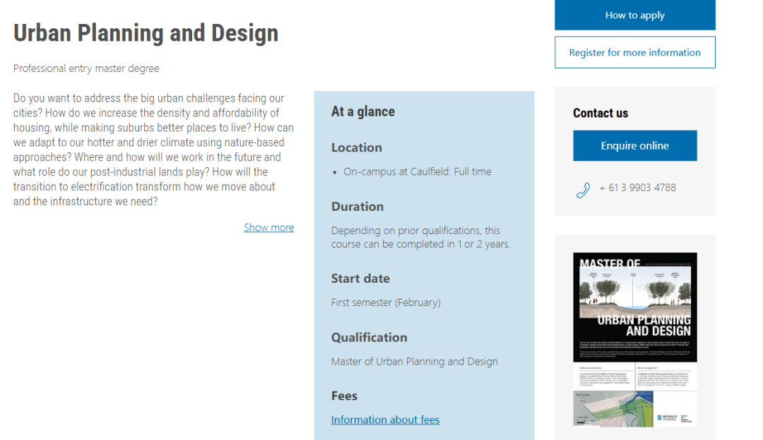 · 作品集要求: 简介应为一份多页、高分辨率的 PDF 文件,至少应包括 3 个项目,阐述各种规模和建筑类型;应展示各种绘图类型,包括二维正交和三维可视化、实物模型制作或材料原型。 城市规划 Master of Urban Planning and Design ![]() https://www.monash.edu/study/courses/find-a-course/urban-planning-and-design-f6004?international=true#application-fees 该课程为学生提升技术能力和创新能力的提供了支撑,以应对城市面临的巨大挑战,并实现可持续发展和以人为本的未来。该穴位已获得了澳大利亚规划协会(Planning Institute of Australia)的认证。 · 入学要求:1y项目要求需联系学校核实 · 申请截止时间:滚动申请 · 语言成绩:托福79,雅思6.5 · 学费:$98,500* Indicative CSP fee to complete degree · 申请费:A$100 · 申请材料: