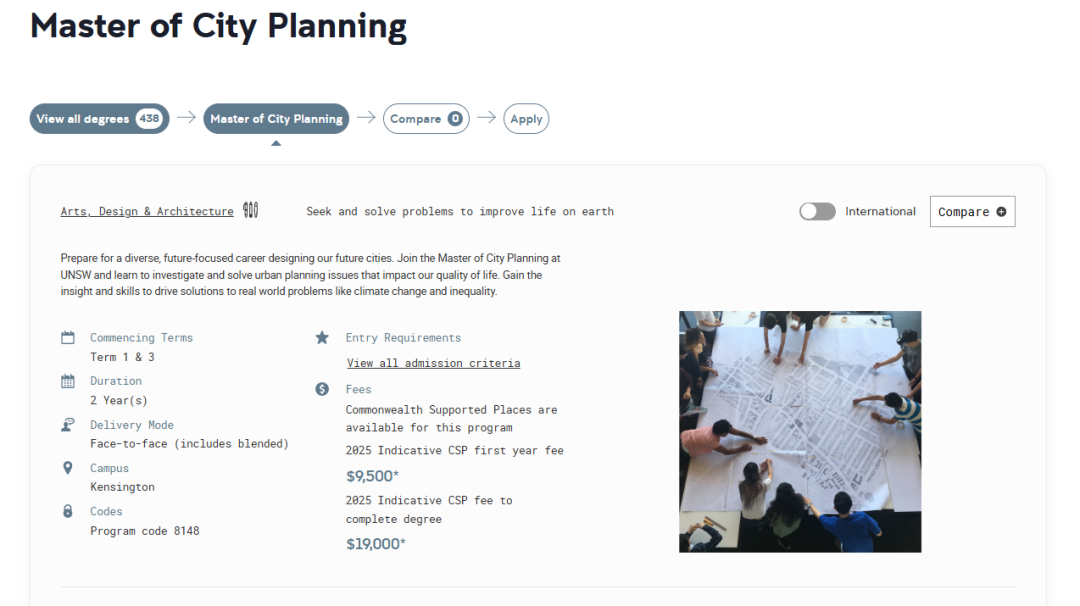 · 作品集要求: 作品集需要以清晰的数字格式提交。它应包括以前工作经历中的样本作品以及所有项目的书面说明。以前学位中的作品可以作为作品集的一部分,但需要清楚地说明自己的角色和贡献。其他创意作品也可以包括在内。 城市规划 Master of City Planning ![]() https://www.unsw.edu.au/study/postgraduate/master-of-city-planning?studentType=international 该项目为期2年,通过理论和实践探索,深度了解城市设计、城市经济与发展、环境与可持续发展、城市建设-基础设施与交通、战略性空间规划、规划法律与管理、规划研究与分析、城市管理与发展评估、城市公平与健康、城市分析等内容。 · 语言成绩:托福90,雅思6.5 · 学费:$19,000* Indicative CSP fee to complete degree · 申请费:125 · 申请材料: