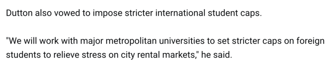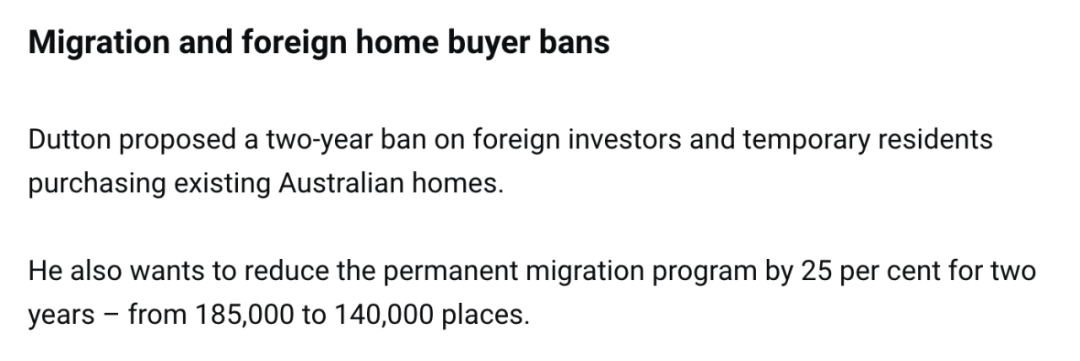 澳大利亚即将迎来三年一度的联邦大选,这场事关国家未来走向的政治博弈已拉开序幕。在这场竞争中,反对党领袖彼得·达顿(Peter Dutton)以强硬的政策主张和激进的改革蓝图成为焦点人物。而达顿也被认为是下一任澳洲总理最大掌权人。![]() 与此同时,现任总理安东尼·阿尔巴尼斯(Anthony Albanese)也已全力投入竞选。他的政府以推动可再生能源和解决住房危机为核心施政方向,但在反对党强势挑战下,执政联盟能否稳住阵脚仍是未知数。近日,作为澳洲最具可能的总理候选人,反对党领袖彼得·达顿(Peter Dutton)在竞选总理的演讲中,阐述了一系列优先事项,包括经济、移民和支出等领域的多项承诺,试图赢得选民支持。而这基本决定了未来澳洲的走向!有两大重磅信息透露出来:第一,联盟党考虑禁止外国人在澳洲买房;第二,联盟党考虑大幅缩减移民配额,缩减幅度达25%! ![]() 这里也涉及中国留学生澳洲华人最关心的议题,包括移民政策和留学政策的变革,我们一起来看看:近日,在维州的工党边缘选区Chisholm发表演讲时,这位自由党领袖借助新年首场重要政治活动,为即将到来的联邦大选造势。 ![]() 他说:“如果我们赢得Chisholm选区,那我们就离赢得执政权更近一步。而如果我们赢得执政权,我们就能让负债累累的维州和整个国家重新运转起来。”尽管澳洲联邦大选的具体日期尚未公布——最迟必须在5月17日之前举行——反对党领袖彼得·达顿(Peter Dutton)和总理Anthony Albanese已经开启了竞选活动。 ![]() 挑战百年政治传统达顿领导的自由党试图打破近百年来的政治传统,推翻一个首届执政期的政府。他表示,未来几天和几周内将公布更多新政策,并承诺削减“浪费性的支出”。我们一起看看自由党的竞选改革政策: 经济政策与税收改革![]() 如果联盟党赢得大选,达顿承诺将实行“更低、更简单、更公平”的税收政策,同时调整工业关系政策。他表示:“我们将恢复对临时工的简单定义,并遏制职场中的工会激进主义。” ![]() 移民与外国买家禁令![]() 关于这一个留学生和华人最关心的议题,达顿将进行大削减!他提出了两项与移民和住房市场相关的政策: