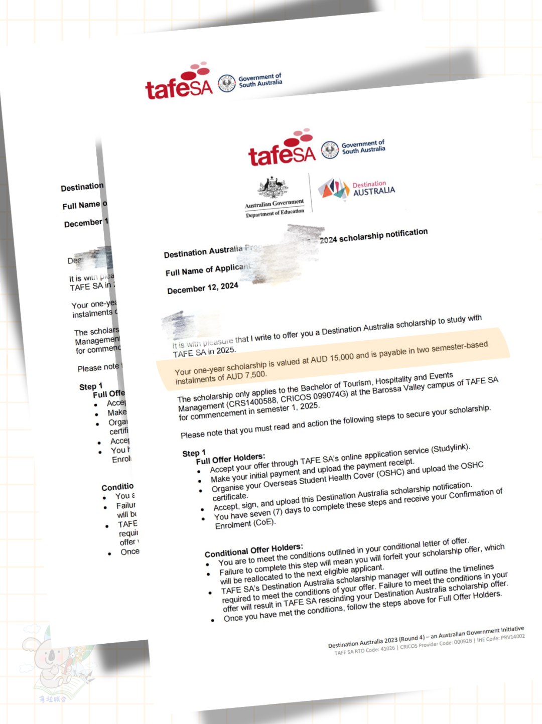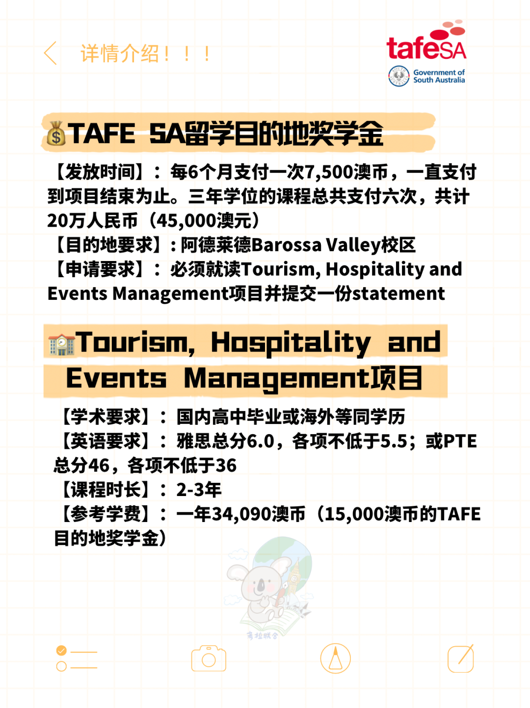 ![]() ![]() 点击上方 ![]() ![]() 我们的双胞胎学生一起拿到了TAFE的offer,就读Tourism, Hospitality and Events Management项目。 ![]() TAFE以低门槛高性价比闻名,学费一般只有高等教育的三分之一。该课程涵盖了从旅游、会议和活动到餐厅、酒店和度假村的方方面面,提升学生在旅游、酒店和活动管理方面的职业能力。❗最重要的是他们一起拿到了TAFE SA的奖学金,每年7万人民币,一直发到项目结束!今天我们就来跟大家介绍一下TAFE SA的留学目的地奖学金❗️ ![]() 🎉澳洲政府通过澳洲目的地计划提供资金,帮助符合条件的高等教育机构向国际学生提供奖学金,帮助澳洲偏远地区学习和生活的学生。TAFE SA很荣幸入选了“ 2024澳大利亚目的地奖学金学校名单”,有条件为学生提供这一笔丰厚的奖学金~✅该奖学金要求学生在TAFE SA的Barossa Valley校区攻读旅游、酒店和活动管理学士学位(099074G/CRS1400588),该校区位于努里奥特帕镇,距离阿德莱德以北约一小时车程。Barossa Vally是世界上最好的葡萄酒产区之一,也以其季节性农产品、风景秀丽的景观和饮食文化而闻名。 ![]() ![]() 💰TAFE SA留学目的地奖学金