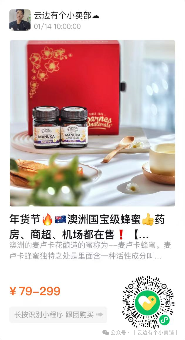 【Barnes Naturals巴恩天然麦卢卡蜂蜜】 团购秒杀:79 (直接图一扫码下单即可) ![]() 年货节🔥🇦🇺澳洲国宝级蜂蜜👍药房、商超、机场都在售❗【Barnes Naturals巴恩天然麦卢卡蜂蜜】 1瓶开团价低至💰79‼️ 买2瓶装还送礼盒+礼袋+木勺 MGO100+、300+,2款可选 ✅NPA6+日常养胃,适合三餐不规律人群 ✅NPA11+养胃温补, 适合免疫力低下人群 ✅肠胃呵护专家,提高免疫力必备#日常保养#年货送礼# 版本:一般贸易 快递 团管理订单管理商品核销 2天前 发布 跟团中379天2小时13分18秒后结束 ![]() ![]() ![]() ![]() ![]() ![]() 澳洲的麦卢卡花酿造的蜜称为--麦卢卡蜂蜜。 麦卢卡蜂蜜独特之处是里面含一种活性成分叫独麦素(NPA),NPA指数越高,活性值越高. NPA指数一般分别为NPA2.7+ ,NPA6+,NPA11+,NPA16+ ①日常呵护:建议6+以上,加数越高,呵护较好! |