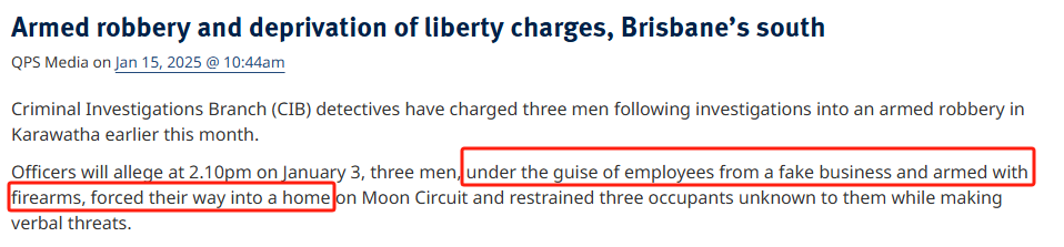 据九号台新闻报道,近期布里斯班发生了一起令人震惊的抢劫案—— 三名男子冒充清洁工,持枪闯入民宅抢劫并挟持居民。 ![]() 据警方介绍,1月3日下午2点, 三名男子假扮成某清洁公司的工作人员,敲开了布里斯班Karawatha地区的一处民宅大门。 这些持枪歹徒强行闯入房屋后,持枪限制了屋内人员的行动自由,并进行言语威胁。 ![]() 警方表示,嫌疑人抢走了大量现金和手表,随后乘坐一辆白色面包车逃离现场。 ![]() (图片来源:九号台新闻) 警方公布的监控录像显示,这些男子戴着圣诞老人帽,乘车离开了案发现场。 1月13日,也就是案发十天后, Acacia Ridge刑事调查科的警察对Greenbank的一处房产、两辆汽车和Ormeau的一个储物单元进行了突击搜查。 ![]() (图片来源:九号台新闻) 在搜查过程中,警方发现了被盗现金、枪支和毒品。 随后,警方逮捕了三名嫌疑人,分别是33岁、39岁和28岁的男子。 ![]() 他们被控三项武装抢劫并伴有人身暴力和剥夺自由罪,以及一项闯入民宅实施可公诉罪行罪。 其中,33岁和39岁的男子将于3月4日出庭受审,28岁的男子则预计于案发当天出庭。 ![]() (图片来源:九号台新闻) 警方称这起犯罪为“高度有组织”的行为,呼吁公众提供更多信息,同时也警惕上门的陌生人。 本文转自微信公众号:今日墨尔本 ![]() END ![]() “壹本乐活”公众号发布的所有内容和商业信息,所有权归属原作者。部分内容、图片来源于网络,如有侵权,请后台联系我们删除。 ![]() 精彩推荐 ![]() ![]() ![]() ![]() ![]() ![]() |
