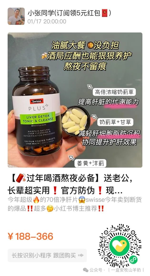【澳洲进口swisse斯维诗70倍净肝片】 平台团购:188起 (直接图一扫码下单即可) (如遇二维码邀请过期,请联系团长) ![]() 【🧨过年喝酒熬夜必备】送老公,长辈超实用❗ 官方防伪❗现货秒发❗ 增强版💥护肝片当然首选大牌!拥有16项TGA权威认证 【澳洲进口swisse斯维诗70倍净肝片】 熬夜、应酬,脸黄冒痘、尿黄口臭,熬夜/外卖的bi入❗️ 某猫官旗舰454 开团仅需💰188史上最低 ✅高浓度奶蓟草,调节肝脏脂肪代谢 ✅新增的甘草成分,与奶蓟草净肝黄金CP ✅抑制脂质过氧化,增加肠胃蠕动 日期:26年4月 快递 团管理订单管理商品核销 今天 发布 跟团中1084天18小时22分8秒后结束 ![]() ![]() ![]() ![]() ![]() ![]() ![]() ![]() ![]() ![]() 今年超级🔥的70倍净肝片😱 swisse今年卖到断货的爆品‼️ 超多🤔小红书博主推荐‼️ |