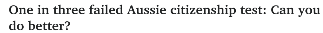 ![]() //前言// 澳洲的入籍考试, 竟然有这么多人直接挂了? #01: 澳洲入籍考试 三分之一直接挂 不少华人在定居澳洲之后,不仅会拿下PR,还会选择加入澳洲国籍。 18至59岁的人在申请成为澳洲公民时,还有一项必须要进行的入籍测试。只有通过这项测试在20道选择题中至少答对15题,才有加入澳洲国籍的资格。 最新数据显示,在去年参加澳洲入籍考试的人中,竟然足足有三分之一的人不合格! ![]() 图片来源:heraldsun.com.au 2024年共有超18.3万人参与入籍考试,但只有12.2万人通过了考试。 澳大利亚的公民入籍考试有20道选择题,问题包括为什么庆祝澳新军团日,以及说出原住民国旗的颜色等等,都是一些非常基础的关于澳洲的文化和传统知识。 ![]() 图片来源:heraldsun.com.au 要想通过考试,申请者还需正确回答所有5道有关“自由、尊重和平等”的题目,且总分必须达到75%以上。 对于那些初次未能通过考试的申请者,也不必过于担心。根据规定,他们最多可以有3次机会申请重新参加考试。 这意味着,即使初次未能达标,申请者仍然有机会通过努力学习和准备,最终成功获得澳洲公民身份。 #02: 澳洲入籍测试题曝光 你能拿下多少分? 澳洲入籍考试究竟有多难?如果是你,在入籍测试中,你能拿到多少分呢? 不如来测试一下吧,正确答案在文章最后。 1. On Anzac Day, we remember a. all Australians who have fought and died in wars. b. the creation of an independent Australian nation. c. the arrival of the First Fleet from Great Britain. 2. What are the colours of the Australian Aboriginal flag? a. Black, red and yellow. b. Green, white and black. c. Blue, white and green. 3.Which is correct in Australian law? a. Men and women have equal rights. b. Men have more rights than women. c. Women have more rights than men. 4.When did the separate colonies join together to become the Australian nation? a. 1601. b. 1901. c. 2001. 5.Who can deliver a welcome to Country? a. Anyone that lives on the land. b. An Aboriginal or Torres Strait Islander custodian of the land. c. A Master of Ceremonies at an event on the land. 6.What is Australia's capital city? a. Brisbane. b. Canberra. c. Perth. 7.Australians believe in freedom of speech. This means a. people can say what they think about politics. b. men have more legal rights than women. c. everyone must follow a religion. 8.In Australia, the government a. tells people which religion to follow. b. is separate from any religion. c. makes laws based on the official religion. 9.By law, Australian citizens aged 18 and over must a. attend local council meetings. b. vote in Australian elections. c. join the Australian Defence Force. 10.Which of the following is true? a. Australian citizens can get an Australian passport. b. Permanent residents can get an Australian passport. c. Australian citizens need a visa to enter Australia. 11.In Australian elections a. you are free and safe to vote for any candidate. b. you must tell the police who you voted for. c. you must write your name on your vote. 12.The Australian Constitution is a legal document that a. contains religious rules. b. contains rules of government. c. can never be changed. 13.In Australia, a referendum is a vote to change a. the Australian Government. b. the Australian Constitution. c. the Prime Minister. 14.In Australia, the parliament a. makes and changes the laws. b. is chosen by the Prime Minister. c. is controlled by judges. 15.The Governor-General represents a. our head of state, the King of Australia. b. a political party. c. the current Prime Minister. 16.Freedom of speech a. underpins Australia's democratic position. b. is not an Australian value. c. means people do not need to obey the law. 17.Why is it important for people living in Australia to learn English? a. Only native English speakers can become Australian citizens. b. English is the only language spoken in Australian communities. c. Speaking English helps people get an education and a job. 18.In Australia, the use of violence against a person is a. acceptable if they are a different religion. b. acceptable if they have a different opinion. c. never acceptable and it is against the law. 19.In Australia, we believe in mutual respect and tolerance. This means you can a. physically fight someone when you disagree with them. b. peacefully disagree with someone. c. only agree with people from the same religion. 20.In Australia, volunteering is important because a. it strengthens our community. b. it earns people lots of money. c. we have to do it by law. 正确答案:aaabb babba abbaa accba 最后 其实,这些问题还是比较基础比较容易回答的。 不过,虽然每次只考20道题,但其实澳洲的入籍考试有一个题库,题目数量大约在500道左右,每次都会随机抽选。 想要入籍更加顺利,还是已建议提前了解,毕竟很多澳洲的人文知识,对于一些人来说还是有“知识盲区”的。 Ref: https://www.heraldsun.com.au/news/national/one-in-three-failed-aussie-citizenship-test-can-you-do-better/news-story/b964e11b4a50340ee8256b70b78897fa ![]() |