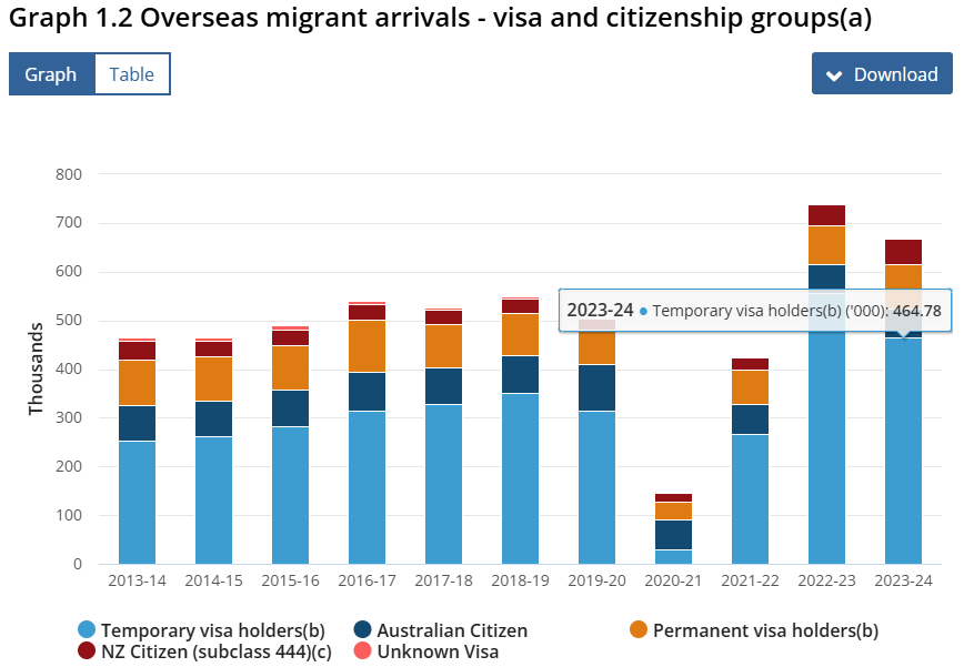 ![]() 海外移民入境人数 - 签证2023-24年移民入境人数总体下降了10%。不同签证类别的变化如下: