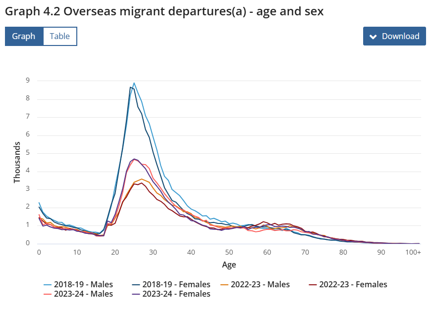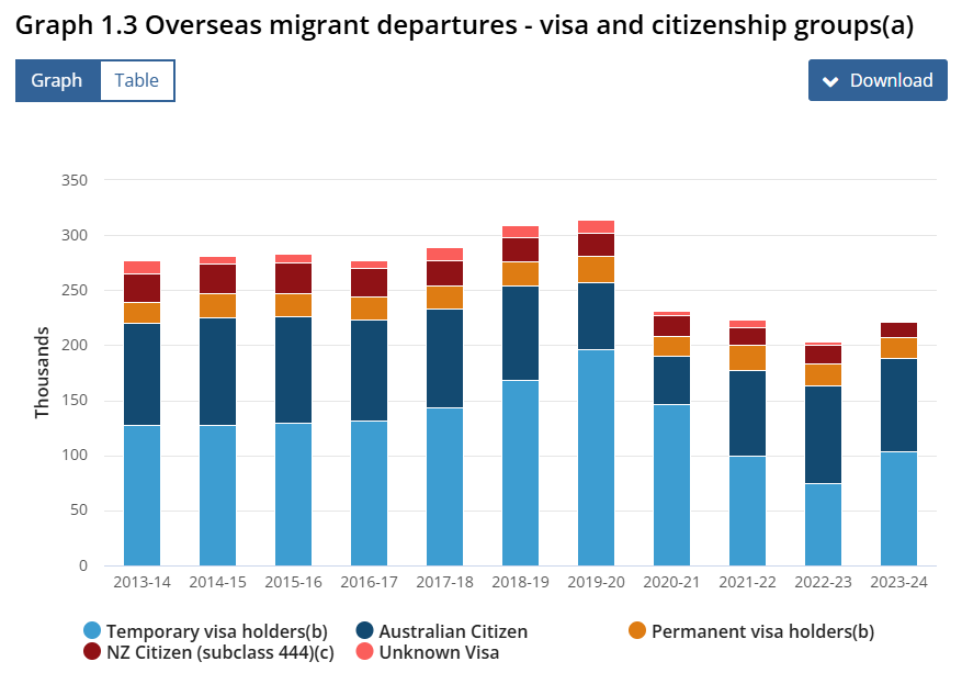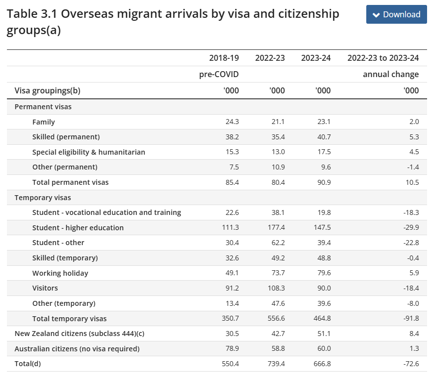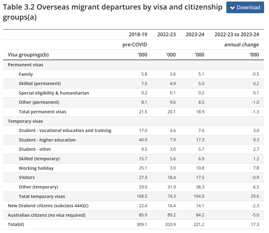 ![]() 海外移民离境人数 - 签证2023-24年,移民离境总体增长了8%。 不同签证类别的变化如下: