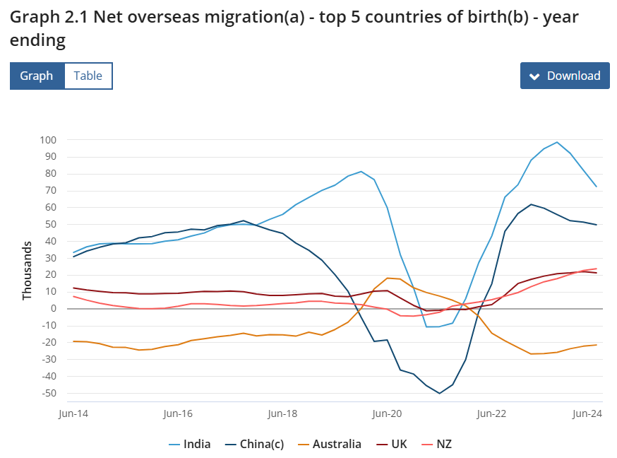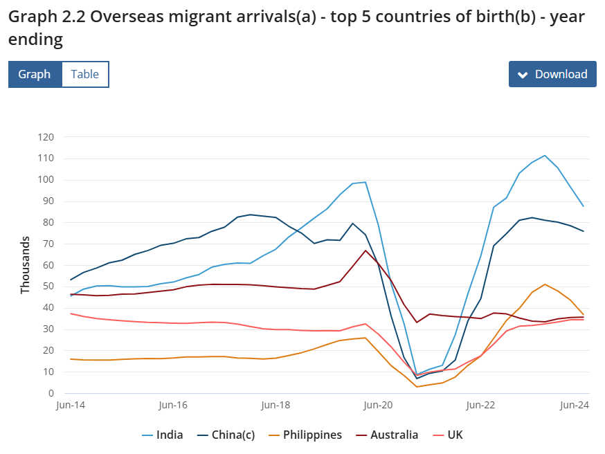 ![]() 移民离境人数 2023-24年,移民离境人数从204,000增加至221,000,比上一年增长了8%。这也是边境重新开放以来首次年度增长。 在2023-24年,临时签证持有者(104,000人)、澳大利亚公民(84,000人)、永久签证持有者(19,000人)和新西兰公民(14,000人)的离境人数均低于疫情前五年的平均水平。 疫情期间,澳大利亚的临时移民数量较少。随着旅行限制的解除,许多临时签证持有者,尤其是国际学生,开始离开澳大利亚,因为他们已经停留了足够长的时间。例如,从2022-23学年开始,持临时学生签证的离境人数增加了97%。 ![]() 净海外移民 - 前5大出生国 2023-24年,海外移民出生国排名前五的国家是印度、中国、澳大利亚、英国和新西兰。 ![]() 海外移民入境人数 - 前5大出生国 2023-24年,移民入境人数排名前五的出生国是印度、中国、菲律宾、澳大利亚和英国。 与2022-23财年相比,除澳大利亚和英国外,其他国家的移民入境人数均有所下降。