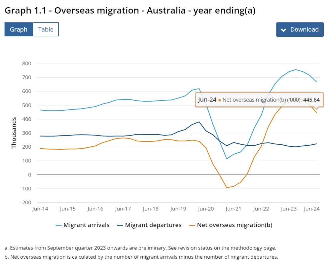 ![]() ![]() 敬畏丨践行丨专注法律10年 ![]() ![]() ![]() 近日,澳洲统计局发布2023-24财年最新移民数据。2023-24年净海外移民人数为446,000,相较于前一年的536,000有所减少。 这主要是由于入境移民人数减少,尤其是临时签证持有者,而同期出境人数有所增加。 2023-24年,移民入境人数从上一年的739,000下降至667,000;这是边境重新开放以来的首次下降。 具体来看: