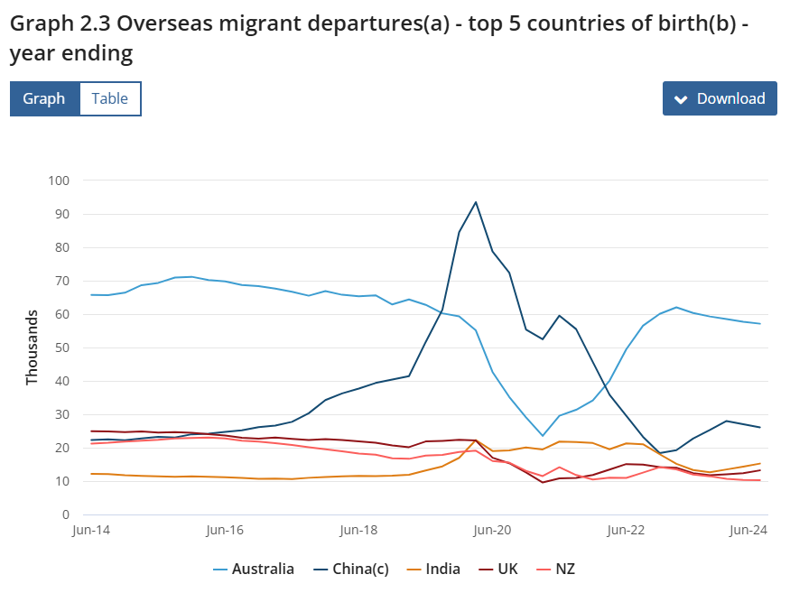 ![]() 海外移民离境人数 - 前5大出生国 2023-24年,移民离境人数排名前五的出生国是澳大利亚、中国、印度、英国和新西兰。 与2022-23年相比,2023-24年在中国、印度和英国出生的移民离境人数有所增加,而在澳大利亚和新西兰出生的移民离境人数有所减少。