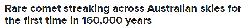 澳洲九号台1月20日报道,罕见的G3 Atlas彗星经过16万年后重返太阳系,出现在了澳洲的夜空中,这一千载难逢的天文现象目前在澳洲及整个南半球都可以观测到。![]() G3 Atlas彗星是在2024年4月首次被发现的,NASA(美国国家航空航天局)目前正严密监测其轨道。而一些澳洲人已经成功在地球上观测到了它。 ![]() (图片来源:九号台) NASA宇航员Don Pettit更是从国际空间站捕捉到了G3 Atlas的影像。他表示:“从轨道上观测彗星,真是太震撼了。” 据悉,G3 Atlas有望成为2024年太阳系中最明亮的彗星,而它下一次出现,将是80万年之后。 天文爱好者现在可以在日落后短暂的时间内,观察到G3造访澳洲的天空。不过,这颗彗星在地球上可见的时间有限,大约三天后,也就是1月23日,将从视野中逐渐消失。 ![]() (图片来源:九号台) 一些幸运的澳洲人已经在彗星消失前成功一睹其风采,摄影师们在社交媒体上分享了他们的观测地点,包括新州Orange的Mt Canobolas、维州的Mt Dandenong,以及Adelaide Hills的Mount Barker。 新州摄影师Troy Pearson于1月19日在Orange的Mt Canobolas上拍摄到了彗星的壮美照片。 据NASA称,G3 Atlas在1月13日距离太阳仅有1350万公里。一旦它的轨道开始远离地球方向,NASA估计它大约需要60万年才能再次如此接近太阳。 ![]() (图片来源:九号台) 根据TheSkyLive.com,G3目前位于摩羯座,距离地球约1.46亿公里。 对于南半球的人们来说,未来几天将是观赏G3彗星的最佳时机。但由于它距离太阳较近,可能会增加观测的难度。 英国天文协会(British Astronomical Association)的Nick James表示:“很难预测这颗彗星在经历了与太阳的‘生死相遇’后会表现如何。它可能比我们预测的亮得多,也可能会更暗。” |