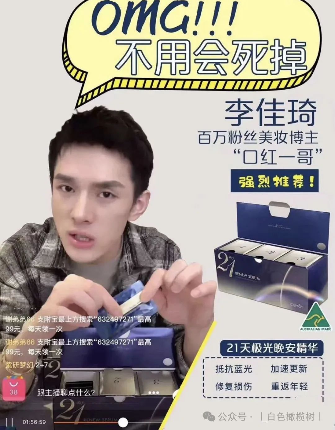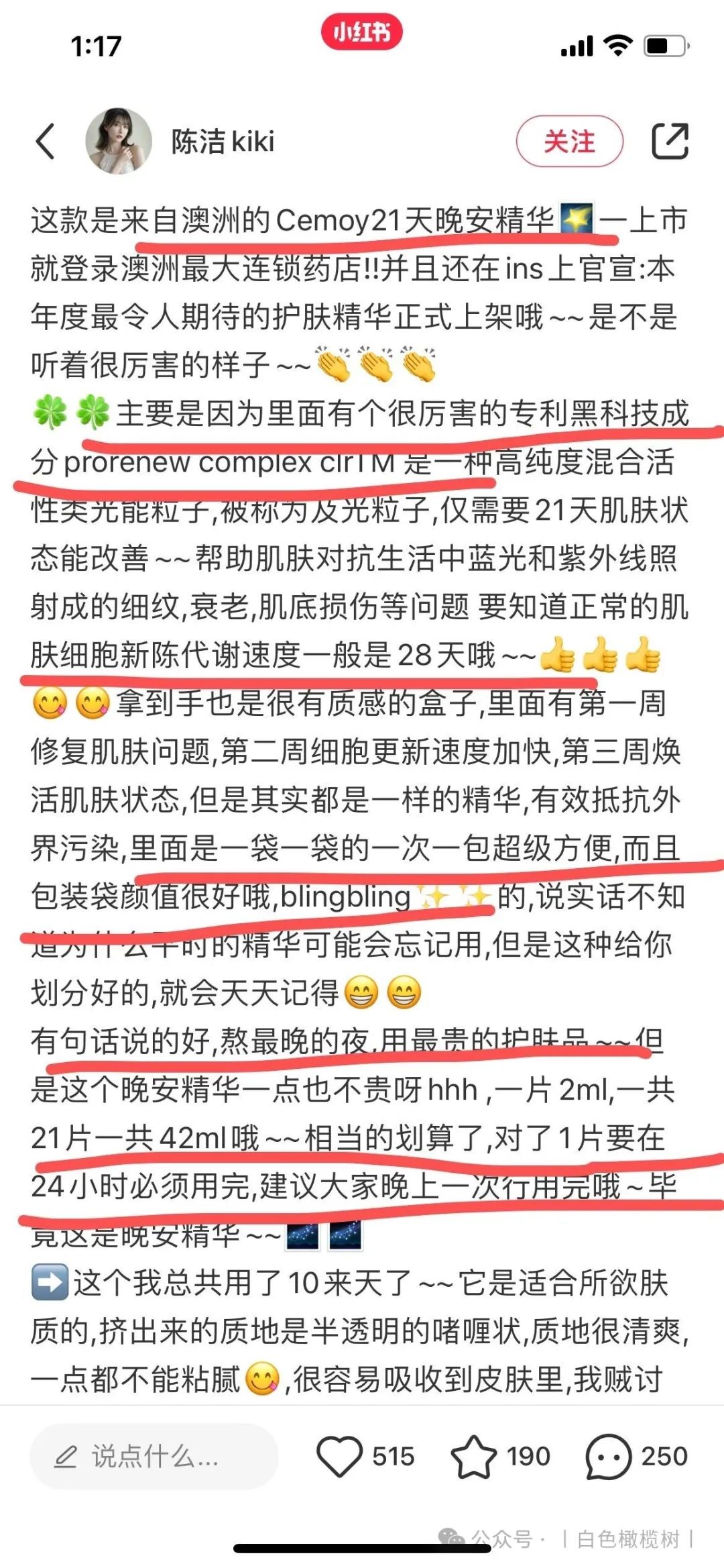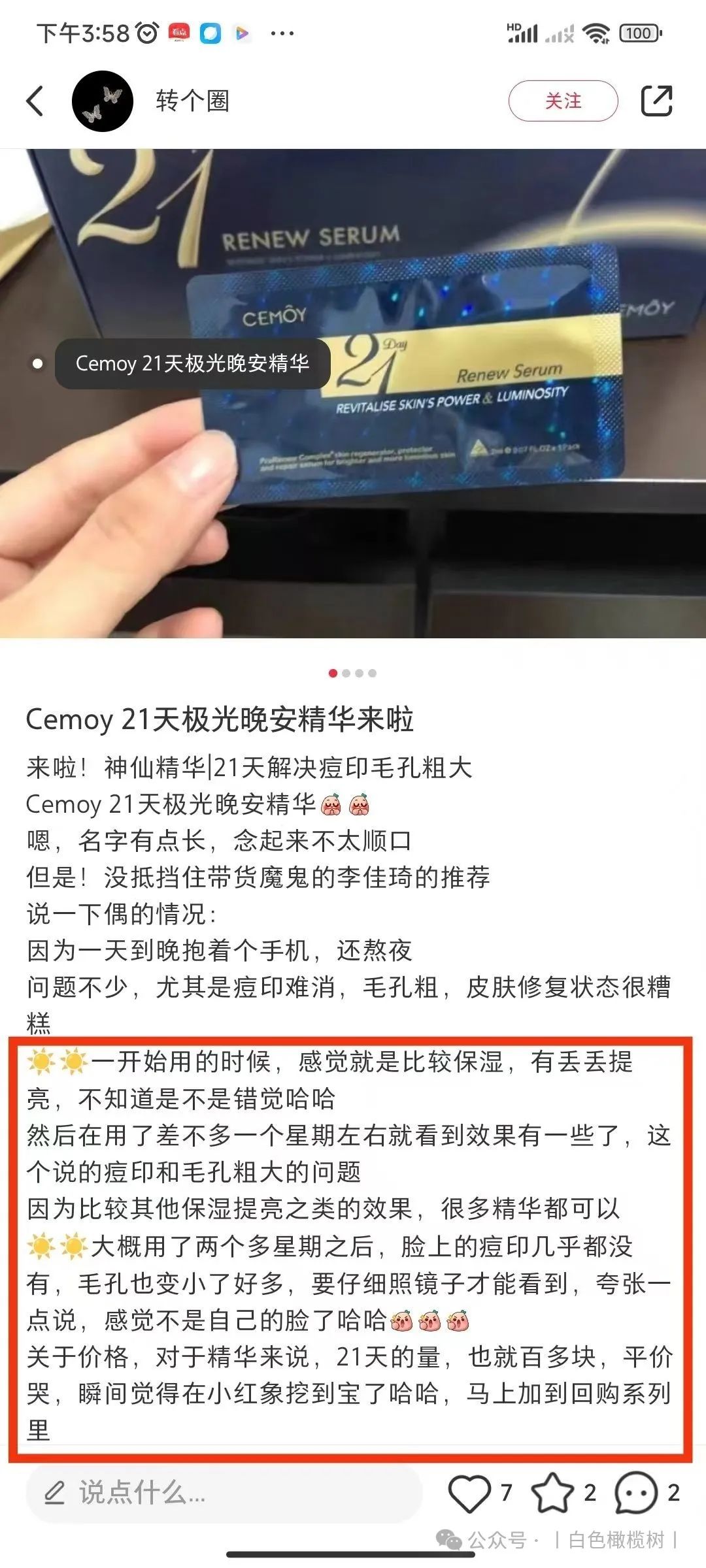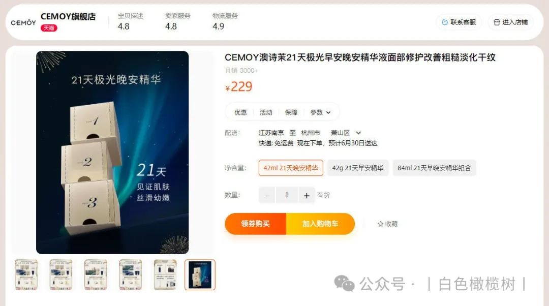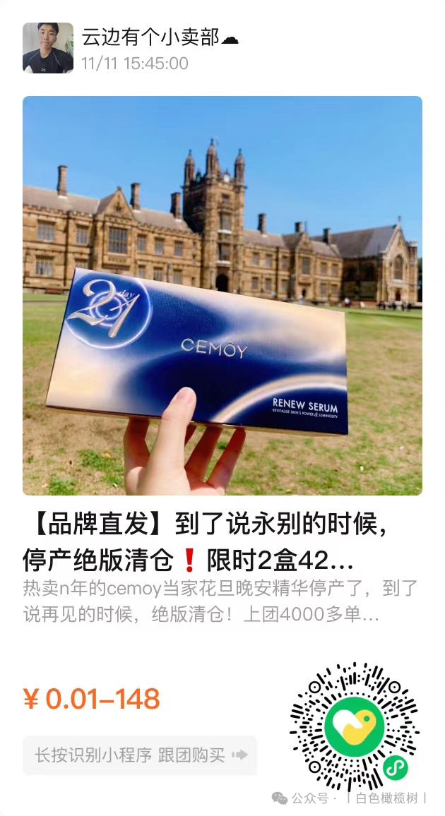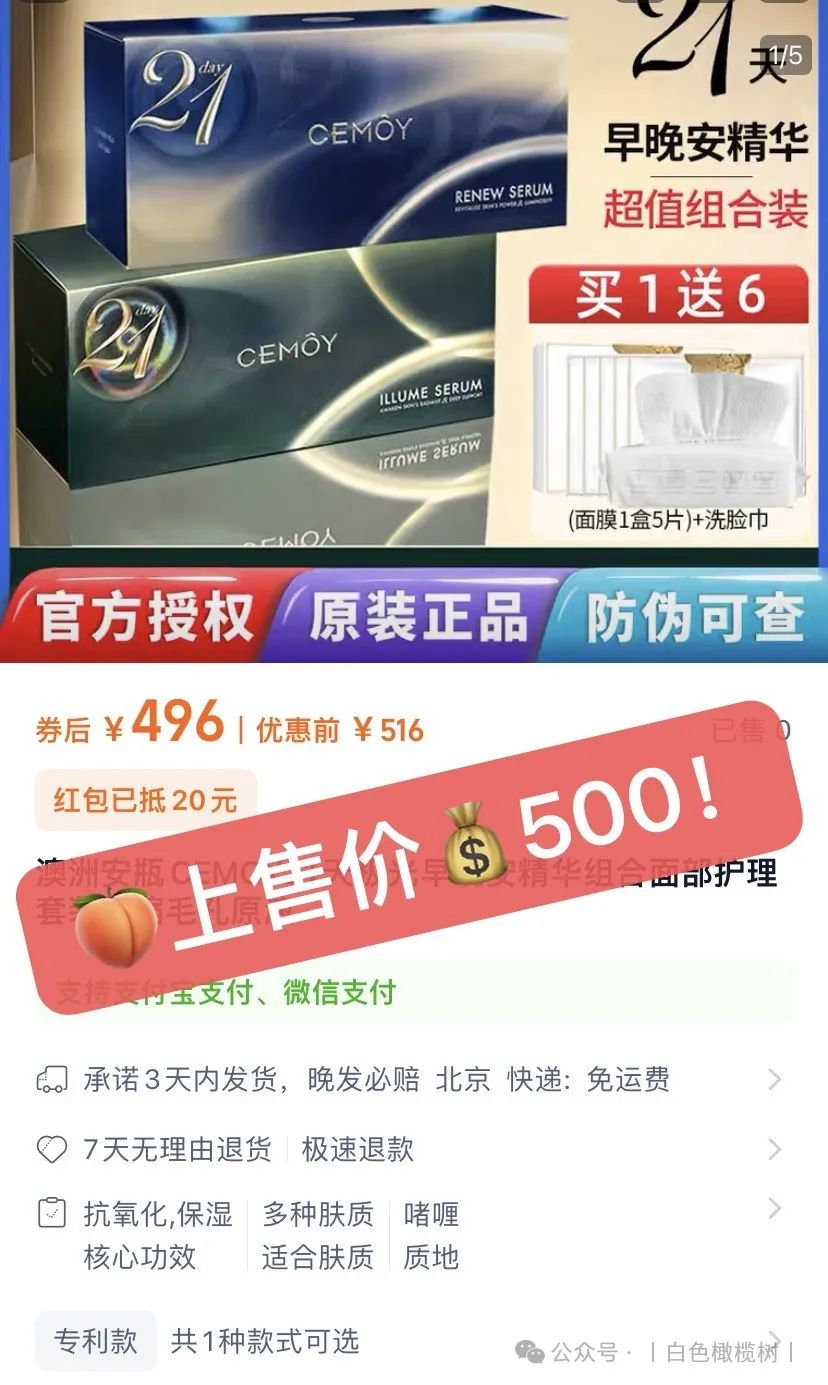 【澳洲进口CEMOY澳诗茉21天极光晚安精华】团购秒杀:79(直接图一扫码下单即可)![]() 【品牌直发】到了说永别的时候,停产绝版清仓❗限时2盒42片💰148送3颗新品精华体验装❗错过以后不会再有了❗澳洲进口CEMOY澳诗茉21天极光晚安精华❗ ✅独家黑科技配方-极光粒子 修复光损伤,有效阻断蓝光入侵 ✅天然植萃复配精华—加强修护滋养 澳洲产 效期至2027.2 快递 团管理订单管理商品核销 68天前 发布 跟团中505天21小时31分33秒后结束 ![]() ![]() 热卖n年的cemoy当家花旦晚安精华停产了,到了说再见的时候,绝版清仓!上团4000多单直接抢完,这是最后一批库存了,以后不会再有了! 李+7直播间168元 日光紫外线,蓝光辐射 除了睡觉,肌肤时刻面临着光侵害! 这款21天极光晚安精华,强烈建议人手一套! 它是澳洲首款抗蓝光护肤产品 一款真正能有效解决蓝光,紫外线伤害 促进肌底受损细胞自我修复的抗衰老精华! 21天修护,紧致,淡纹,不粗糙❗ 精华中的全能战士!一盒恢复白、嫩,透亮肌! 肤感效果,性价比完胜贵妇pola❗ ![]() ![]() 上市以来,便亲民价格和黑科技抗蓝光 一战成名!主打从细胞根源解决肌肤问题❗ 配方精准高效,全片没有无效添加❗ ✅独家黑科技ProRenew Complex CLR极光粒子 快速分解吸收入侵蓝光紫外线,有效阻断光侵害,修复肌底受损细胞,加速代谢,稳固屏障 ✅加上乳酸菌裂解液双向打配合 加乘代谢防守,清除老废细胞 为肌肤筑起一道无死角“抗蓝光钢化膜”❗ ✅一天一片,夜间修复,抗蓝光 加速肌肤更新,修复损伤,提升肌肤屏障功能! 只需21天,弹嫩紧致淡纹,恢复肌肤年轻态❗ ![]() 而且这个精华一开始吸引我的是抗蓝光 毕竟我们现在真的一天到晚对着手机📱电脑💻 对这个噱头是无法抗拒的 尤其是像我这种爱熬夜的主 作为一个晚安精华,在低感光的夜间环境中 极光粒子能释放长达12小时的护肤能量❗ 把肌肤白天受到的日光、蓝光损伤细心修复 清理皮肤毒素还有那些废旧老化的细胞 快速排除老化细胞 最重要的是可以将肌肤回春周期缩短到21天 这就是21天精华由来! ✅一大盒内含:7片*3小盒,到手共21片精华 ![]() ![]() ![]() ![]() ![]() ![]() ![]() 防守做好了,养护抗老当然一样都不能少! 全方位精进奢养,复配多种天然珍稀植萃精华 21天养出白嫩,透亮、健康肌❗ ✅褐藻提取物——强抗氧化抗老 深海高活性物,促生胶原蛋白 紧致淡纹,深度保湿,构建防护屏障 ✅燕麦仁——亮白保湿 舒缓抗炎,清除老废角质,提升肌肤通透度! ✅积雪草——舒缓修复 深度补水与锁水,舒缓镇静泛红刺激 抗菌抗炎,有效改善油痘肌,修护敏感 ✅水解大豆-调理细腻肤质 具有很好的滋润保湿,强韧肌肤屏障的作用 ![]() ![]() 多种天然珍稀植萃精华神助攻 ✅可实现高效率、高活性抗氧化抗衰老! 增强肌底细胞活力,稳定肌肤,高效保湿防暗沉 ✅临床人体功效实测: 21天的真实改变!效果看得到 ![]() ![]() ![]() ![]() ![]() ![]() 魔鬼👹李佳琦推荐👇 李+7直播间168元,我们连他半价都不到! 历史最低!抢到就是赚到! ✅一撕开就是一股很清淡的植物清香, 闻起来就是很天然的气息 上脸特别水润,好推开,渗透吸收超快 按摩几下就吸收了,重点是这款精华非常清爽 没有别的精华那种粘腻感 ✅一片2ml的精华量,分量超足 涂完我这张大脸竟然还有多的!!太感人了! 多的我都会用来涂脖子涂胳膊~ 涂两遍脸也是完全没问题的! ✅晚上涂完,第二天皮肤又嫩又透亮! 一扫疲惫倦容!天天上班,脸上也没“班味”! ![]() ![]() 21天精华三段进阶效果: 修光损,抗光老,巩固屏障不服不行❗ ✅第一周: 老废细胞开始加速代谢 同时逐渐激活新一轮的细胞新生 堆积已久的自由基老费细胞,被分解排出 ✅第二周: 肌底垃圾彻底被清扫,细胞极速更新 吸收力被唤醒,皮肤充分汲取养分,越来越细腻饱和,肌肤弹力,紧致度,光泽感显著提升! ✅第三周: 细胞完成更新,肌底环境逐渐平衡 角质屏障被修复,干燥,泛红,痘痘,及干纹细纹,暗沉色着通通不见,皮肤通透呈现健康光泽 2天肌肤焕然新生! ![]() ![]() ![]() ![]() 肌肤有以下问题,都给我去囤它! 夏天的肌肤损伤,21天让你养出健康灯泡肌! ![]() 👇官方售价💰229元 我们仅需💰79元 ![]() ![]() ![]() ![]() ![]() ![]() ![]() 被李佳琦OMG捧上天的Cemoy21天晚安精华 一推出就火到不行 迅速被捧上了平价好用精华之王的宝座 简直可以直接和POLA极光精华正面开杠啦~ 口碑爆棚的人气单品,怎么能轻易放过呢 ![]() 可以说CEMOY这个牌子在国内大红大紫起来 就归功于21天精华 “熬夜救星”“效果令人惊叹”、“无限回购” “大牌品质白菜价,简直性价比之王”…… 都是它的热门关键词。 不仅美妆博主、时尚达人 普通用户对它赞不绝口 连女明星张嘉倪、钢琴女神吉娜、知名美妆 直播博主李佳琦也都推荐过它! ![]() 🔥国际高端权威期刊《时尚芭莎》获奖评为“年度最佳夜间精华”! 🔥国民人气美妆节目《女人我最大》倾情推荐! ![]() ![]() 高端百货老佛爷线下专柜在售💥 ![]() ![]() “白天电脑、晚上手机” 已经成了越来越普遍的生活方式 无数少女肌就这样硬生生催成了老阿姨 CEMOY21天晚安精华 能在蓝光入侵肌肤时分解吸收并转换掉 真正实现对蓝光的有效阻断 为你肌肤贴上一层“抗蓝光钢化膜” ![]() 你了解过蓝光对肌肤伤害吗? 蓝光并不是指蓝色的光, 而是波长在380nm-500nm(纳米)的高能量可见光 是可见光