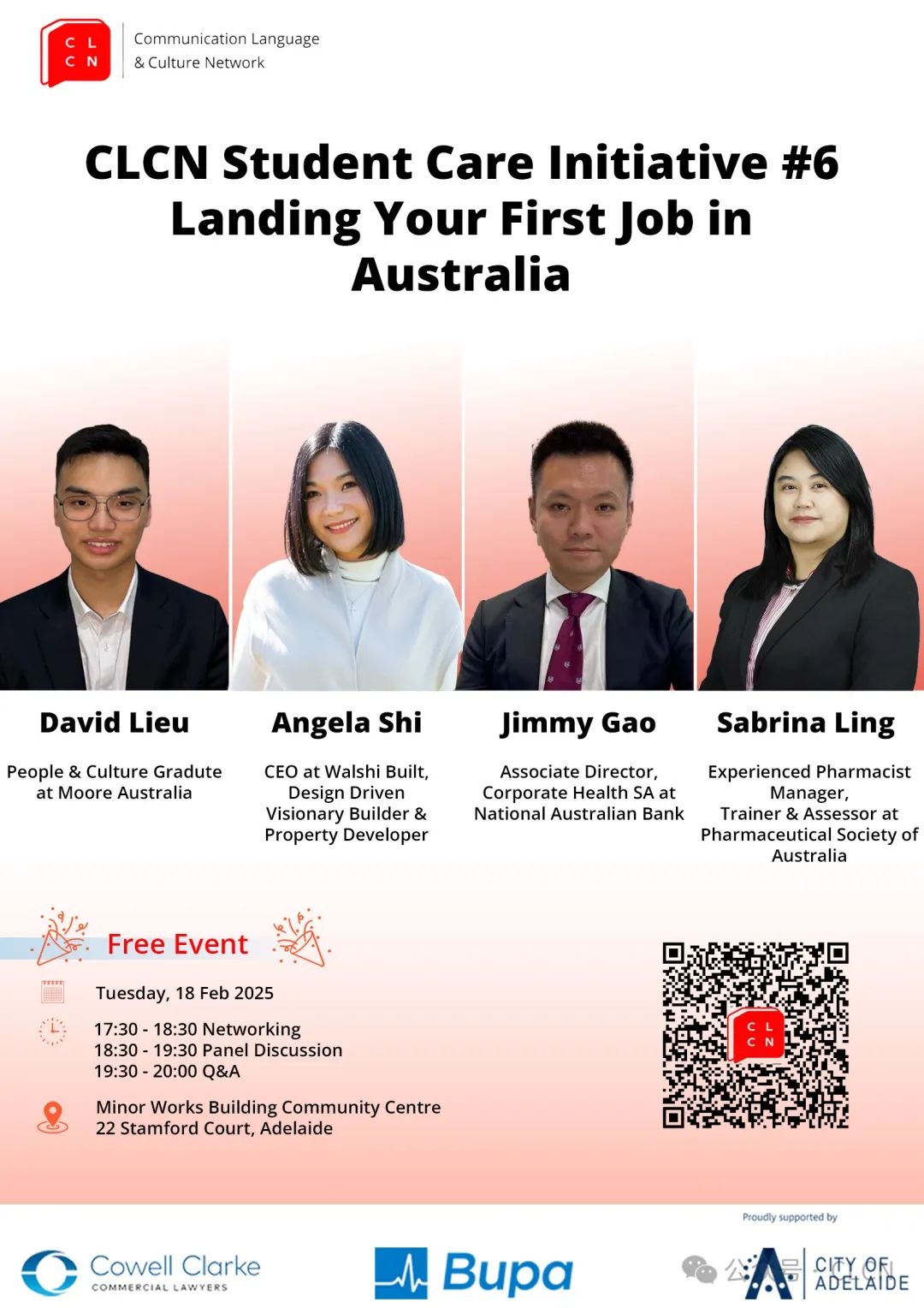 ---CLCN学生关怀计划第六期---![]() 小伙伴们,好久不见!2025年已经开启,大家有没有定下新的求职目标? 过去的活动中,许多小伙伴曾向我们表达了他们在求职过程中遇到的困惑和挑战: “简历投了很多份,却迟迟没有回音?” “没有本地经验,不知道如何提升竞争力?” “不知道从哪里开始,甚至怀疑自己是否真的能找到工作?”...... 为了能够真切地帮助大家提升求职成功率,CLCN学生关怀计划特别策划了本项目在2025年的第一期讲座—如何拿下第一份工作!希望通过这场讲座,能够帮助大家在新的一年里开启一个好头! ![]() CLCN学生关怀计划 ![]() CLCN学生关怀计划(CLCN Student Care Initiative(CLCN SCI))是由CLCN(Communication Language & Culture Network)携手阿德莱德市政府(the City of Adelaide (CoA))共同推出的一项长期发展项目,旨在帮助国际学生及新移民熟悉了解澳大利亚的社会和法律体系,进而帮助他们跨越语言障碍,提高跨文化交流的有效性,并清楚地知道何时何地能够寻求到有效的社会及法律援助。该项目通过提供学生及新移民们所需的知识和资源,帮助他们成功融入澳洲社会。 本期的信息说明会,CLCN有幸邀请到了四位来自不同行业、拥有不同工作经验的嘉宾,Angela Shi,David Lieu,Jimmy Gao,Sabrina Ling(排名不分先后)一起与大家分享如何在澳洲找到自己理想的第一份工作,揭示有哪些澳洲求职必杀技。 ![]() Angela Shi – 首席执行官 – Walshi Built Angela曾作为国际学生来到澳大利亚留学,毕业后成功获得了应用金融和商业学双学位。27岁时,她成为市值数十亿美元的跨国公司中最年轻的执行团队成员,负责管理澳大拉西亚地区的财务规划与分析(FP&A)及项目管理部门。 在担任了11年的高层管理职务后,Angela决定追随自己热情,投身于建筑和房地产行业,并创办了自己的建筑公司 - Walshi Built,从此彻底改变自己的职业生涯。在过去的两年里,Angela完成了MBA学位,获得了建筑管理文凭,负责Jurlique公司具有挑战性的商业分析工作,并从超过300名申请者中脱颖而出,成功获得了仅有的两张建筑许可证之一。 Angela热爱挑战,她认为阻碍成功有三大敌人 - 舒适圈,自我怀疑以及寻求捷径。她坚信,培养强大的心理素质和不轻易放弃的决心有助于在求职过程中保持动力,应对困难,并最终取得成功。 ![]() David Lieu - 人力资源 & 文化管培生 - Moore Australia David拥有南澳大利亚大学人力资源管理学学士学位,在人力资源职能方面为非营利组织、NDIS(国家残疾保险计划)和会计/咨询公司贡献了自己的力量。作为Moore Australia 的一名人力资源与文化管培生,他在招聘、员工入职、培训与发展、绩效管理、劳动关系、薪资管理以及合规性方面都积累了一定的经验。 David将围绕自我评估、职业探索、求职规划/搜索、技能发展、目标设定与适应力培养展开自己的分享。对于正在求职的国际留学生来说,David的分享将会是非常宝贵的参考。 ![]() Jimmy Gao - 副总监 - NAB (澳大利亚国民银行) Jimmy 拥有10年企业银行业务经验,大部分时间专注于退休生活与老年护理领域。目前Jimmy 负责南澳医疗保健市场的商务拓展和新客户开发。 此次分享,Jimmy将围绕有效沟通和面试思维而展开。求职成功的关键在于做好充分的准备,掌握非语言沟通技巧,能够积极倾听,并在深思熟虑后做出回应。同时,保持积极向上的成长心态,将帮助我们在求职过程中提升自我,最终实现职业目标。 ![]() Sabrina Ling - 药剂师 & 培训师和评估员 经验丰富的Sabrina拥有药房管理、培训和职业发展方面的多样化技能。她通过实施针对社区需求量身定制的战略计划,优化运营效率,并与关键相关方合作提升盈利能力,推动了组织的业务增长。作为一名出色的培训师和评估员,Sabrina擅长于评估临床能力、培养伦理决策能力,并通过建设性反馈赋能学习者。她在员工培养,实战培训,以及为实习生和学生提供职业指导方面展现出了优秀的领导力。Sabrina专注于通过量身定制的培训项目,帮助国际毕业生提升职场沟通、文化融入等方面的就业能力。她在指导、领导和创新方面的能力充分体现了她赋能个人、推动多元化职业领域成功的热情与奉献精神。 Sabrina将与大家分享人脉在澳洲求职过程中的重要性,并结合自身经历,讲述如何通过人脉在澳大利亚找到第一份工作。 ![]() 活动信息 ![]() ![]() 时间:2025年2月18日(周二)17:30 - 20:00 地点:Minor Works Building Community Centre, 22 Stamford Ct Adelaide SA 5000 活动流程: 17:30 - 18:30 交流互动 18:30 - 19:30 嘉宾演讲 19:30 - 20:00 Q & A环节 快快扫描下方二维码参加本次活动吧!(活动免费) ![]() ![]() 战略赞助商 ![]() ![]() ![]() ![]() ![]() CLCN ![]() ![]() CLCN国际语言文化交流协会(Communication Language & Culture Network, 简称CLCN),是一家在澳大利亚慈善机构与非营利性组织委员会(ACNC)注册的公益组织,专注于国际人才的孵化、教育培训、职业发展以及人才交流。 我们自主开发并主导一系列独特的人才培训课程IP和项目。我们的实习项目得到了阿德莱德大学、南澳大学、南澳州弗林德斯大学和TAFE SA以及更多澳大利亚大学与院校的认可。参与我们的实习项目不仅能让学生获得宝贵的实践经验,还能得到完成学业所需的学术学分。 想了解更多关于CLCN的精彩活动吗?快来扫描下方的二维码,更多精彩内容和惊喜等待着您。 ![]() —— 本期完结 —— |