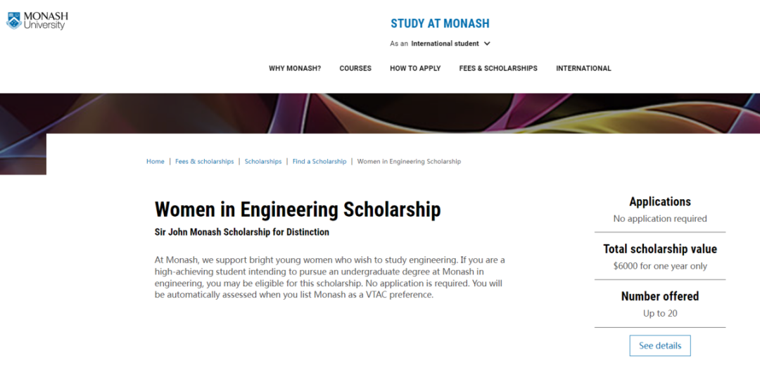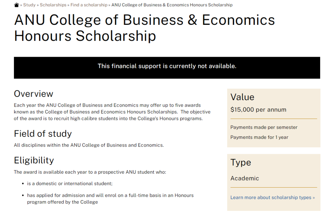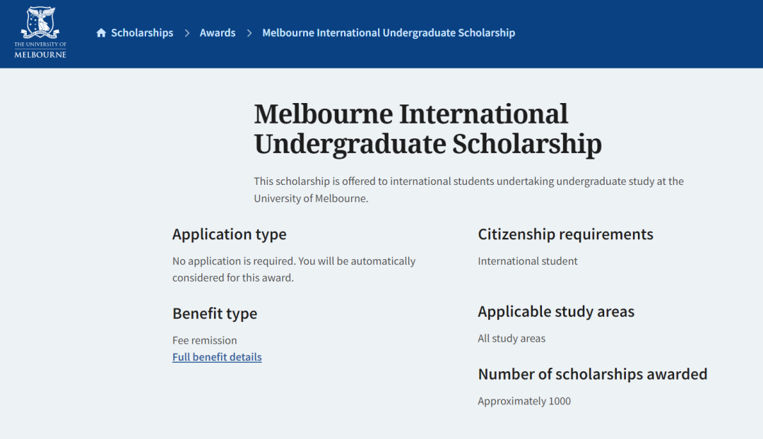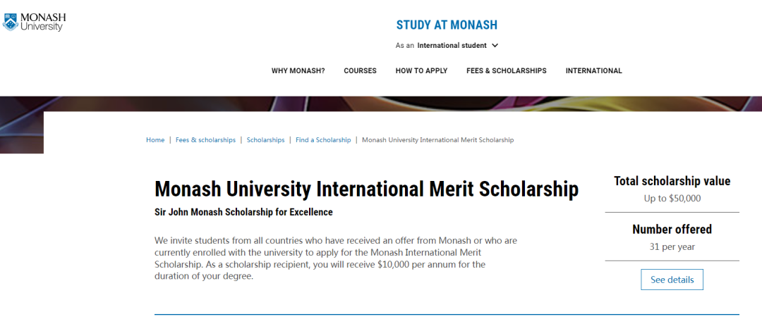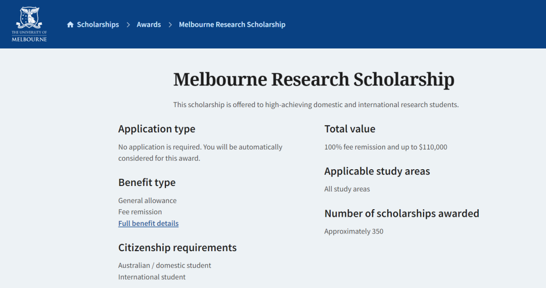 在留学申请中,奖学金是不少留学生关心的话题。如果能够申请到奖学金,就可以为自己减轻不少的经济负担,学费问题也不再是阻拦留学生的一道坎了。 今天馆长就来为大家介绍介绍澳洲都有哪些奖学金! 按照奖学金的颁发主体进行分类,我们可以把澳洲奖学金分为政府奖学金、院校奖学金和私人或机构提供的奖学金,授予学位覆盖了本科、硕士及博士。 一、政府奖学金 ![]() 首先我们来介绍一下政府奖学金,中国留学生可以申请的澳洲政府奖学金主要包括以下几种: 1.澳洲政府奖学金 AustralianGovernment Research Training Program,RTP ![]() 来源:澳洲政府教育部官网 RTP,又称 AGRTP,它的前身为澳洲国际研究生研究奖学金 International Postgraduate ResearchScholarship(IPRS),是澳洲联邦政府所提供的全额奖学金。 该项目的奖学金按年度发放,以支持攻读研究型硕士学位(ResearchMasters)或者研究型博士学位(ResearchDoctorate)的国际学生。受助人可获得学费资助、一般生活费津贴或其他与学位学习有关的津贴。 该奖学金为研究型硕士学位提供最多 2 年的奖学金,为研究型博士学位提供最多 4 年的奖学金。根据澳洲政府官网给出的数据,2023 年补助金额在 29,863-46,653 澳元之间,澳洲政府每年会依据 CPI 指数进行调整。 ![]() 来源:澳洲政府教育部官网 该奖学金的申请由每个学校自己管理负责,所以学生需要直接联系学校,了解如何申请 RTP 和关键截止日期。 学生选择申请此项奖学金后,学校会择优推选给澳洲政府评审,获选后的奖学金通过学校发放。该奖学金每年发放名额有限,全澳仅有两三百个,竞争相当激烈,对申请者的学术背景和科研能力有相当高的要求。 2.澳洲目的地项目 DestinationAustralia ![]() 来源:澳洲政府教育部官网 澳洲目的地项目是联邦政府为支持那些偏远地区的高等教育机构向其学生提供奖学金而进行的一项经费补助计划,旨在鼓励本地学生与国际学生前往澳洲偏远地区院校学习和生活。 该奖学金向在澳洲偏远地区院校就读澳洲学历框架下(AQF)四级证书课程(CertificateIV)至博士学位课程(PhD)的本地和国际学生发放,发放金额为每年 15,000 澳元,最长可获得四年。 申请者可以直接向自己的目标学校/教育机构申请奖学金,符合资格的学校具体名单可以在澳洲政府教育部官网进行查询。 ![]() 来源:澳洲政府教育部官网 国际学生在奖学金申请和发放期间,都需要保持有效的学生签证,并且学习的课程项目是需要在澳洲联邦政府招收海外学生院校及课程系统 CRICOS 注册登记过的全日制课程。 3.中国国家留学基金委研究奖学金 ChinaScholarship Council,CSC 中国国家留学基金委与澳洲多所院校有合作提供奖学金,主要面向申请澳洲高校的博士生开放,下面几类学生可以提出申请: 应届硕士毕业生以公派或自费方式到澳洲读博士、近一年在国外获得硕士学位还未回国要到澳洲读博士、以及已经以自费方式在澳洲读博士一年级的学生。 奖学金内容一般包含学费和衣食住行的全部费用。 该奖学金对于申请者的学术背景要求较高,限制也较多,符合条件的同学可以前往合作院校官网查看相关内容,或者也可以直接向中国国家留学基金委官网提交申请哦。 关于该奖学金的具体申请信息,大家也可以定期关注中国驻澳洲大使馆教育处发布的通知~ ![]() 来源:中国驻澳洲大使馆教育处 二、学校奖学金 ![]() 接下来是学校奖学金,澳洲众多高校都为学生提供丰厚的奖学金,在申请学校时大家可以前往各校官网进行查看,通常在 Scholarships 或相关版块下可以找到详细信息。大家也可以到澳洲政府教育部官网查询全澳洲学校的所有奖学金项目: 每所学校提供的奖学金都有所差异,下面馆长为大家简单介绍一下主要的几种类型: 1.院校奖学金 该类型的奖学金一般由学校提供经费,向全校所有专业的申请者开放。有的学校会把本科生与研究生奖学金分开设立,或者专门为国际学生设立,也有的会按地域国家划分。 该类型的奖学金一般都是基于学生的学业成绩、学术成就、个人潜力、实践能力,以及对社会的贡献度等多方面进行综合评估,奖金通常包含学费减免和生活补助等。 比如莫纳什大学向来自全球各国的国际学生提供了国际优异奖学金,奖学金获得者可以在学习期间每年获得 10,000 澳元,最高 50,000 澳元的奖金补助。 ![]() 来源:莫纳什大学 墨尔本大学为国际本科生以及研究型研究生学位的学生提供了学费减免,这也是奖学金的一种形式。 ![]() 来源:墨尔本大学 ![]() 来源:墨尔本大学 还有澳洲国立大学为研究生提供每年 34,000 澳元的研究奖学金等等。 ![]() 来源:澳洲国立大学 符合奖学金条件的同学一般在申请学校的时候就会被自动列入这些奖学金的考虑名单,但有时候需要自己主动提出申请。具体要求大家需要前往各校官网查看哦。 2.院系奖学金 院系奖学金,顾名思义,就是学校各学院为自己下属院系提供的奖学金,和院校奖学金性质相同,只不过是专门提供给申请本院系专业课程的学生。 比如澳洲国立大学商业与经济学院提供了国际研究生奖学金,获得该奖学金的国际学生可以减免 50% 的学费;另外,该学院还为所有就读荣誉课程的学生提供了每年15,000 澳元的荣誉奖学金。 ![]() 来源:澳洲国立大学 ![]() 来源:澳洲国立大学 再比如昆士兰大学音乐学院为就读研究型研究生学位的学生提供了 1,000-2,000 澳元的奖