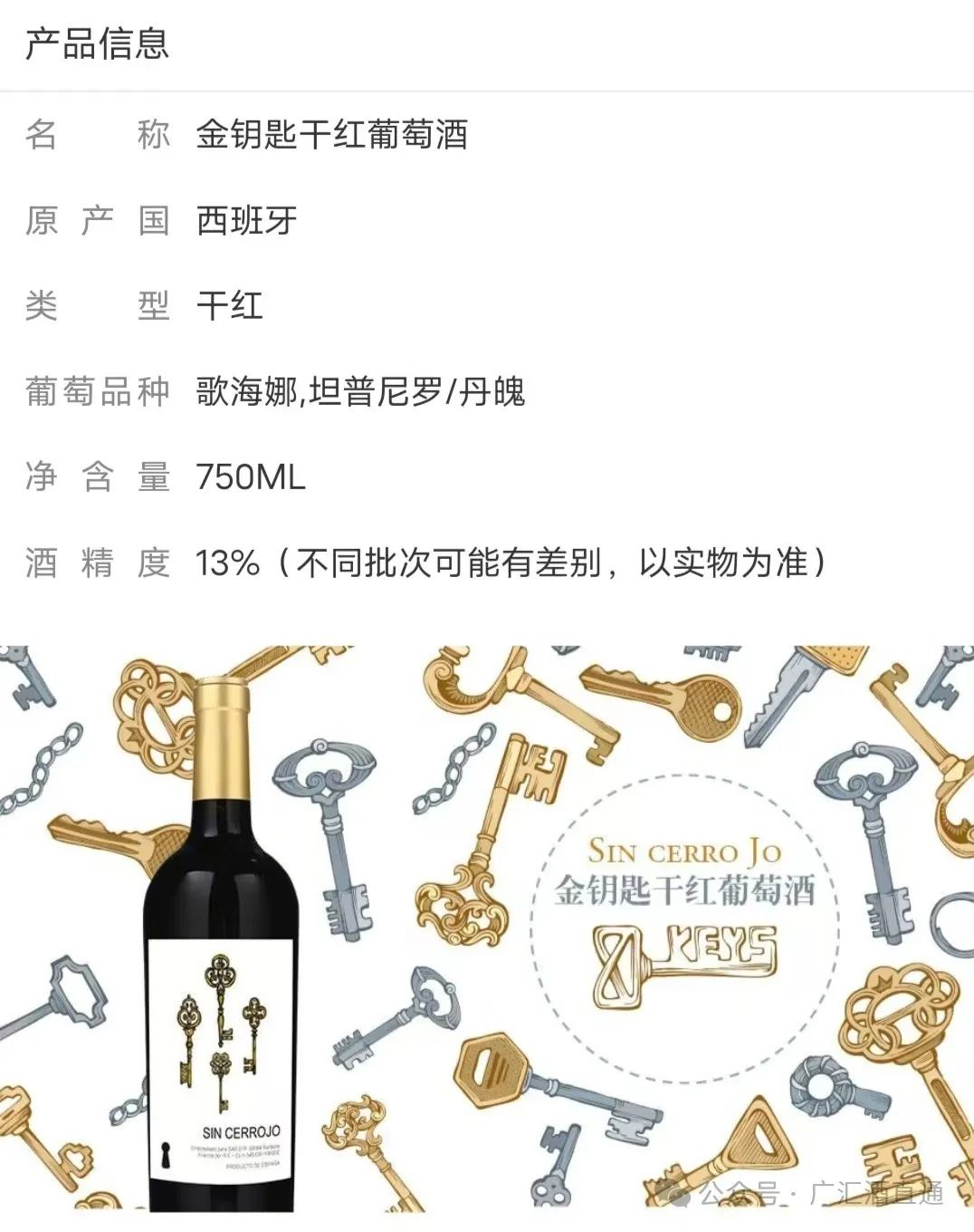 金钥匙干红葡萄酒