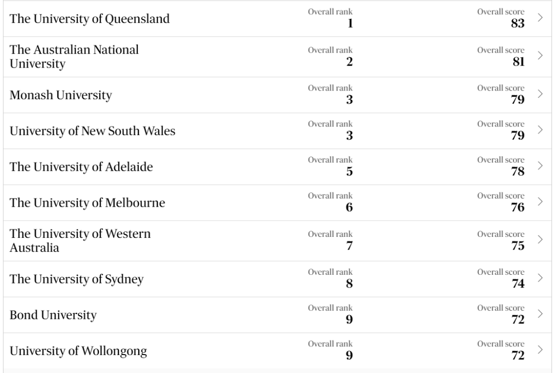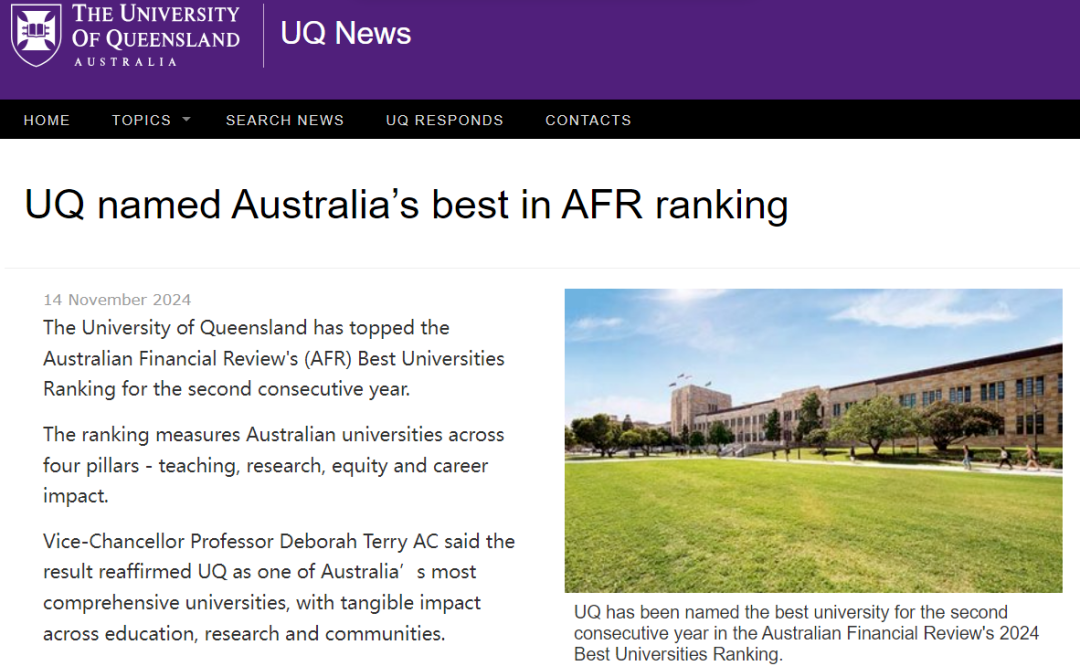 ![]() 前不久,《澳洲金融评论报》(Australian Financial Review,简称 AFR)正式发布了《2024 澳洲最佳高校排名》。值得一提的是,该排名是澳大利亚唯一由本土编制的大学排行榜。 ![]() 这份澳大利亚本土大学排名与留学生通常参考的四大权威排名——QS世界大学排名、U.S. News世界大学排名、泰晤士高等教育世界大学排名以及ARWU世界大学学术排名有所不同。AFR(澳大利亚金融评论)的排名指标数据主要来源于澳大利亚本土机构,因此对于未来计划在澳大利亚学习和发展的同学来说,这份排名更具参考价值。 ![]() 排名指标 本次排名依据四大核心指标进行综合评估。 ☑️教学指标:调查内容全面涵盖了学生体验、教学质量、技能培养、学生参与度以及学习资源等多个关键维度。 ☑️科研指标:该评估体系全面考量了多个关键指标:包括院校高质量学术出版物的产出数量、国际合作项目与学术交流的开展情况,同时结合了澳大利亚政府对研究质量、参与度及影响力的权威评估结果,并纳入了与研究相关的收入数据作为重要参考依据。 ☑️公平性指标:基于澳大利亚政府提供的五类弱势学生群体数据,评估体系着重考察了这些学生在校参与度、学业成功率与普通学生的对比情况,以及最终的学位获取率等关键指标。 ☑️职业成果指标:评估数据来源广泛且权威,主要包括:澳大利亚学习与教学质量指标(QILT)开展的毕业生就业成果追踪调查、毕业三年后的就业率统计以及雇主满意度调查结果;同时,研究还整合了澳大利亚税务局提供的毕业生在毕业一年期和五年期的薪资水平数据。 ![]() 排名亮点 与QS世界大学排名相比,本榜单的特色在于其本土化视角,这一点从TOP10院校的构成便可窥见端倪: ![]() 在排名中,昆士兰大学以83分的优异成绩蝉联澳大利亚榜首!喜讯传来,昆士兰大学官网随即发布了庆祝公告,喜悦之情溢于言表。 ![]() 备受瞩目的澳洲八大在本年度排名中表现亮眼,悉数跻身榜单前十位。 🌎️昆士兰大学(University of Queensland):继去年登顶后,该校再次蝉联澳大利亚榜首,彰显了其卓越的综合实力。在学术研究、教学质量、创新成果及国际化程度等多个领域,该校均保持着优质的水平,四大评估指标均获得优异评分。 🌎️澳洲国立大学(The Australian National University):荣登榜单第二位,较去年提升一个名次。该校在公平性、就业成果和科研实力等核心指标上表现尤为突出,斩获高分。作为享誉国际的学府,该校素以培养卓越人才著称,每年都吸引着大批优秀国际学子前来深造。 🌎️蒙纳士大学(Monash University)&新南威尔士大学(The University of New South Wales):两所高校并列榜单第三位。其中一所较去年上升一个位次,在科研实力和公平性等指标上均有亮眼表现;另一所虽较去年下降一个名次,但其在学生就业成果这一关键指标上依然保持着领先优势。 🌎️阿德莱德大学(The University of Adelaide):排名全澳第五。 🌎️墨尔本大学(The University of Melbourne):位列榜单第六位,该校在科研实力方面表现尤为突出,同时,其公平性指标也位居全澳第二。然而,在教学质量方面仍有提升空间,目前排名第三十二位。 🌎️西澳大学(University of Western Australia)和悉尼大学(The University of Sydney):分别位列第七、第八名。 ![]() 详细排名情况 ![]() ![]() ![]() ![]() ![]() *本文信息来源:AFR UK InLand 英伦教育(英伦留学) 总部位于英国伦敦,拥有丰富的海外院校项目资源,并拥有一支有丰富海外院校申请经验及留学文书经验的团队,提供海外升学、工作及生活等多方面协助,并为学生提供独一无二的、细致详尽的申请后续服务,关注学生在海外生活学习的方方面面。已获得British Council英国大使馆文化教育处,及英国外交部和中国驻英国领事馆 3 重官方认证的教育咨询资格。 “广东英伦教育”作为UK InLand在中国广东的分公司亦属广东省留学服务协会的理事会会员单位、全国留学服务机构联盟的盟员企业;同时获得留学行业内的“诚信承诺单位”称号以及荣获 ICEF 国际教育认证。2017 年正式成为“全国首批承诺采用国家标准留学服务机构”及“国家级留学服务保障机构”。 ![]() ![]() ![]() ![]() |